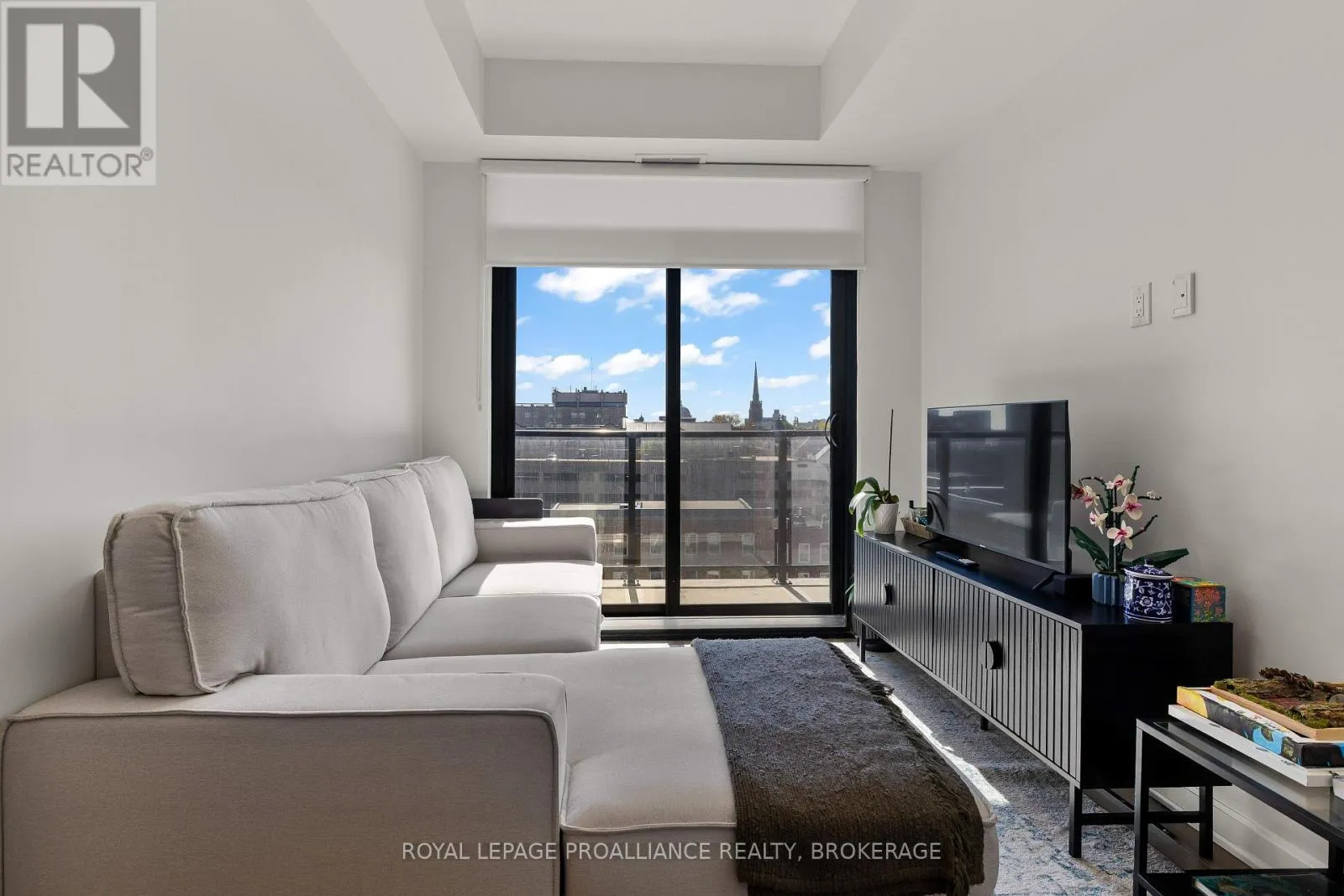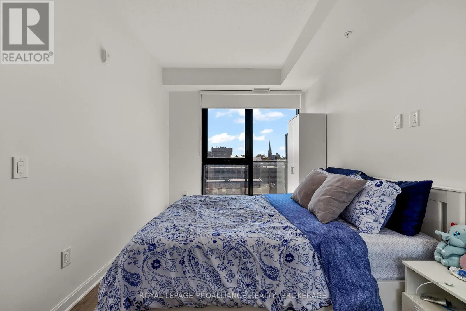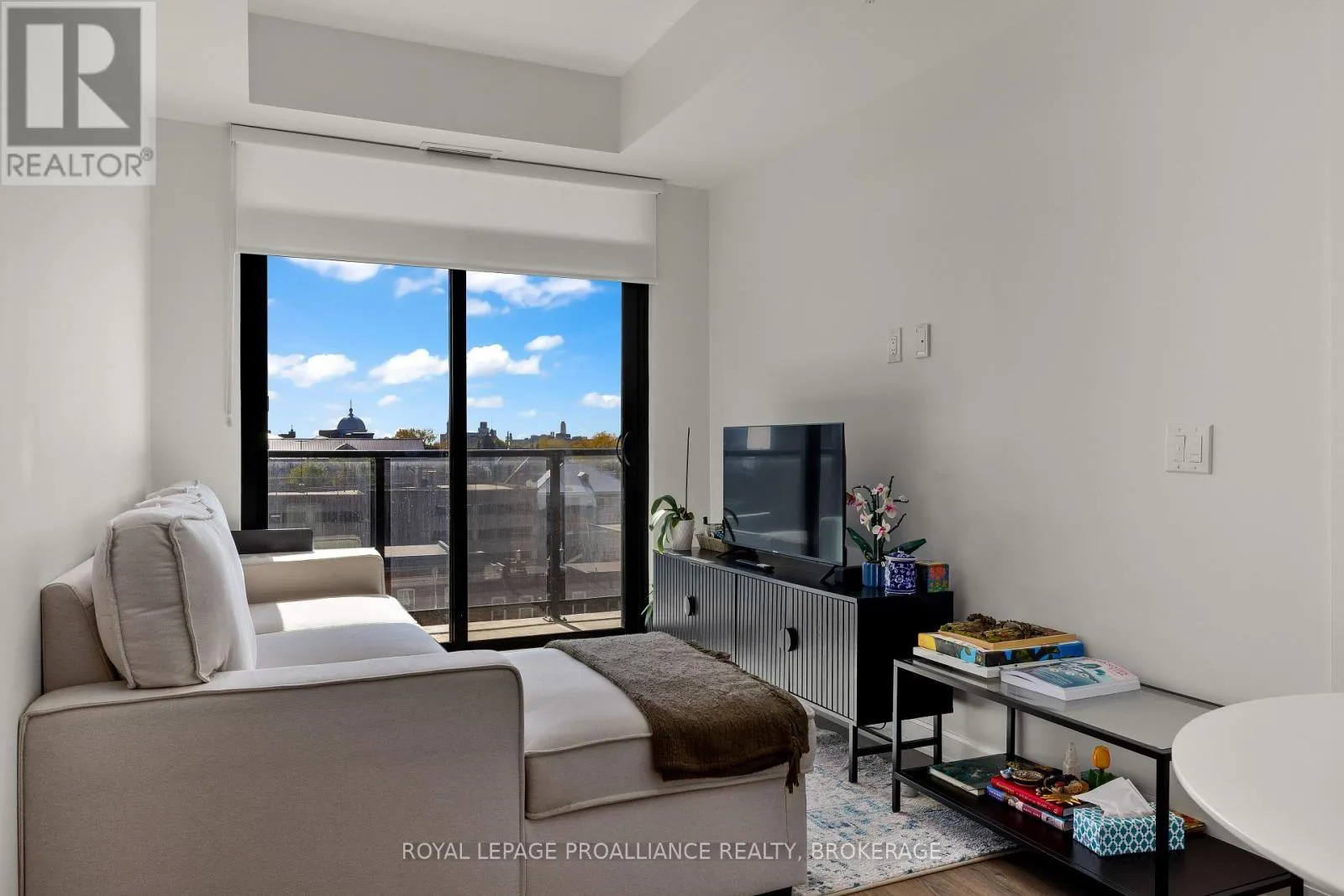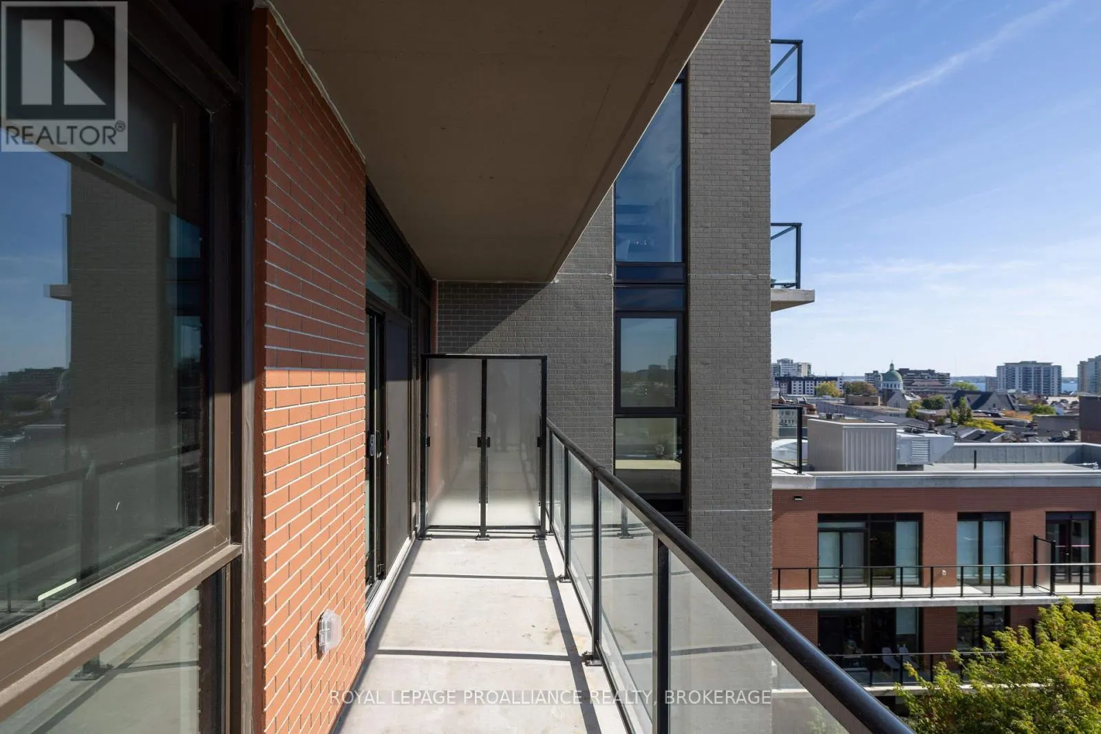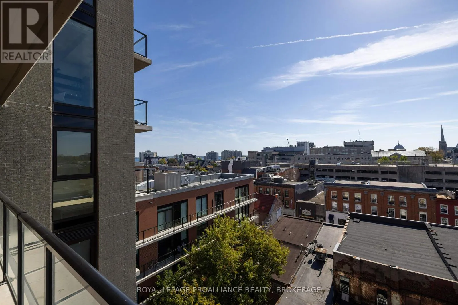 Princess & Sydenham Street Step into modern living with this stunning 600+ sq.ft. unit on the seventh floor of Kingston's newest condo development! Features include a spacious bedroom and dedicated office area, perfect for working from home, two full bathrooms for added convenience, a bright and sunny living area with patio doors leading to a balcony with expansive views of downtown, in-suite laundry for effortless living and a dedicated parking space and secure bike storage. This exceptional building offers a lifestyle like no other with a rooftop patio complete with barbecues, a yoga studio, meeting rooms, and a stylish party lounge for entertaining friends and family. All of this is just steps away from the vibrant Princess Street, where you can explore local shops, eateries, and cultural attractions. Don't miss your change to own a piece of this urban oasis! Whether you're a first-time buyer, looking to downsize, or seek a lucrative investment opportunity, this condo is perfect to you! (id:27476)