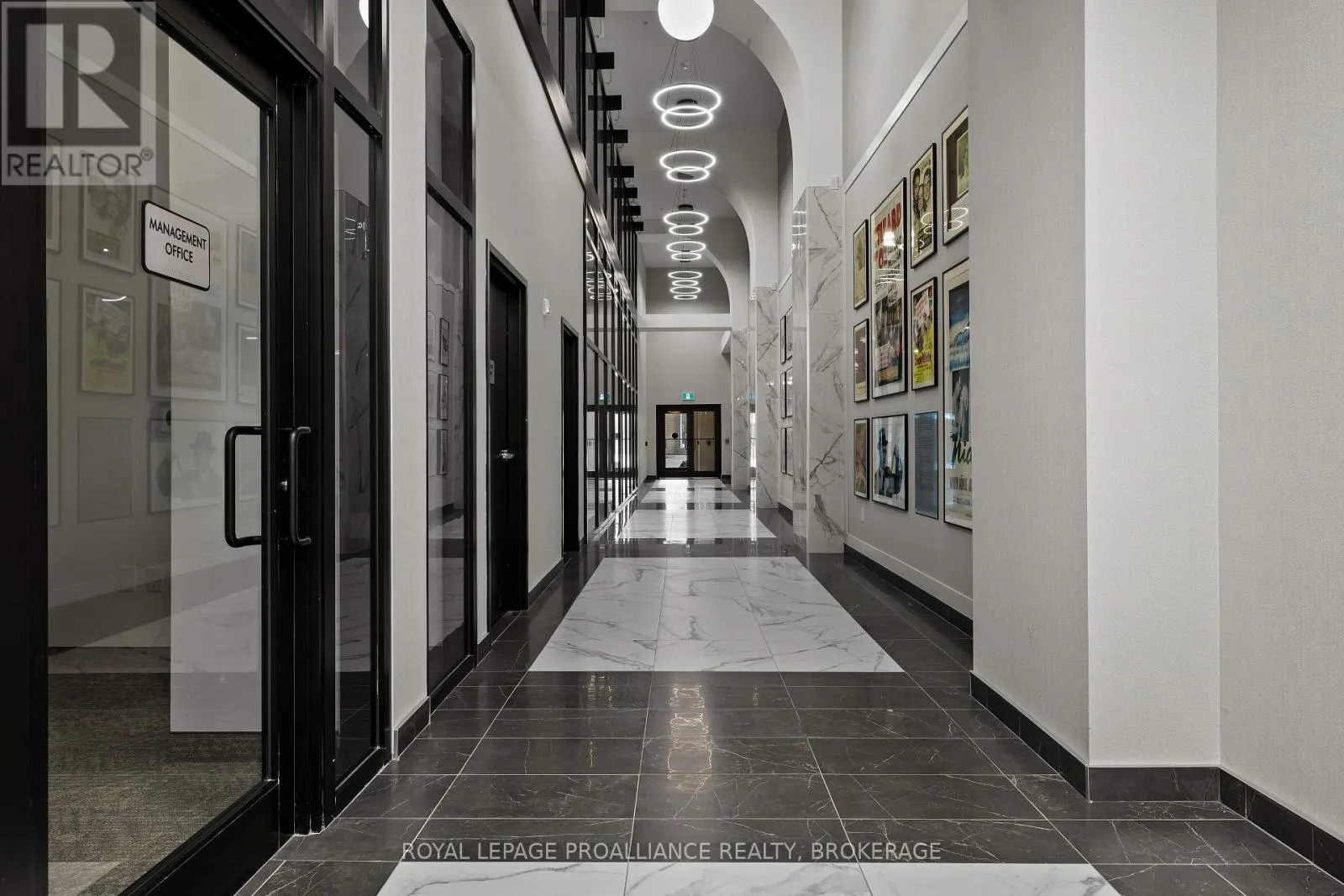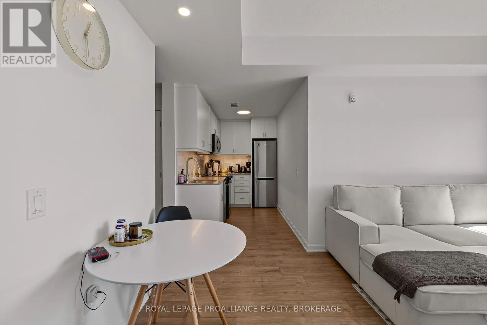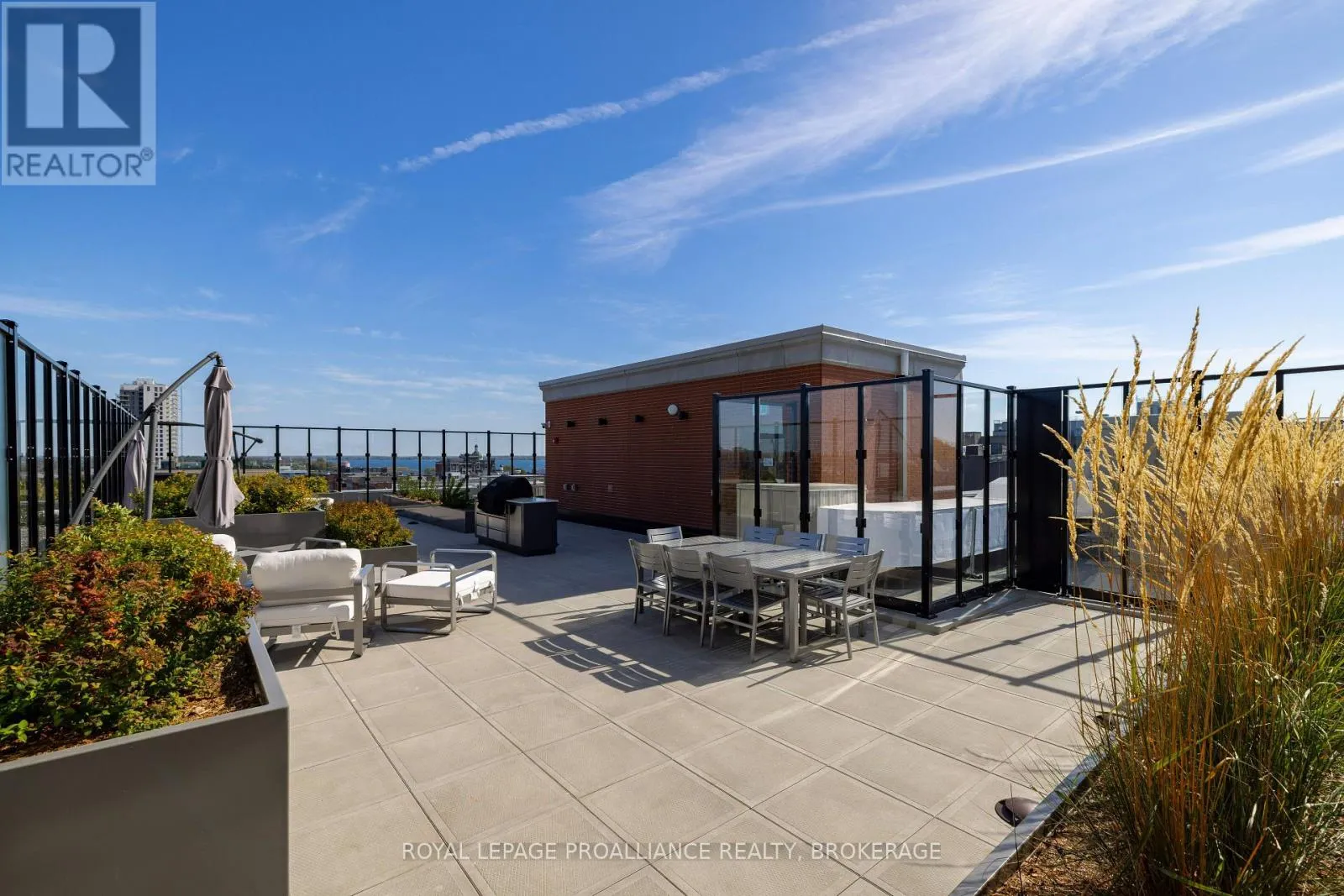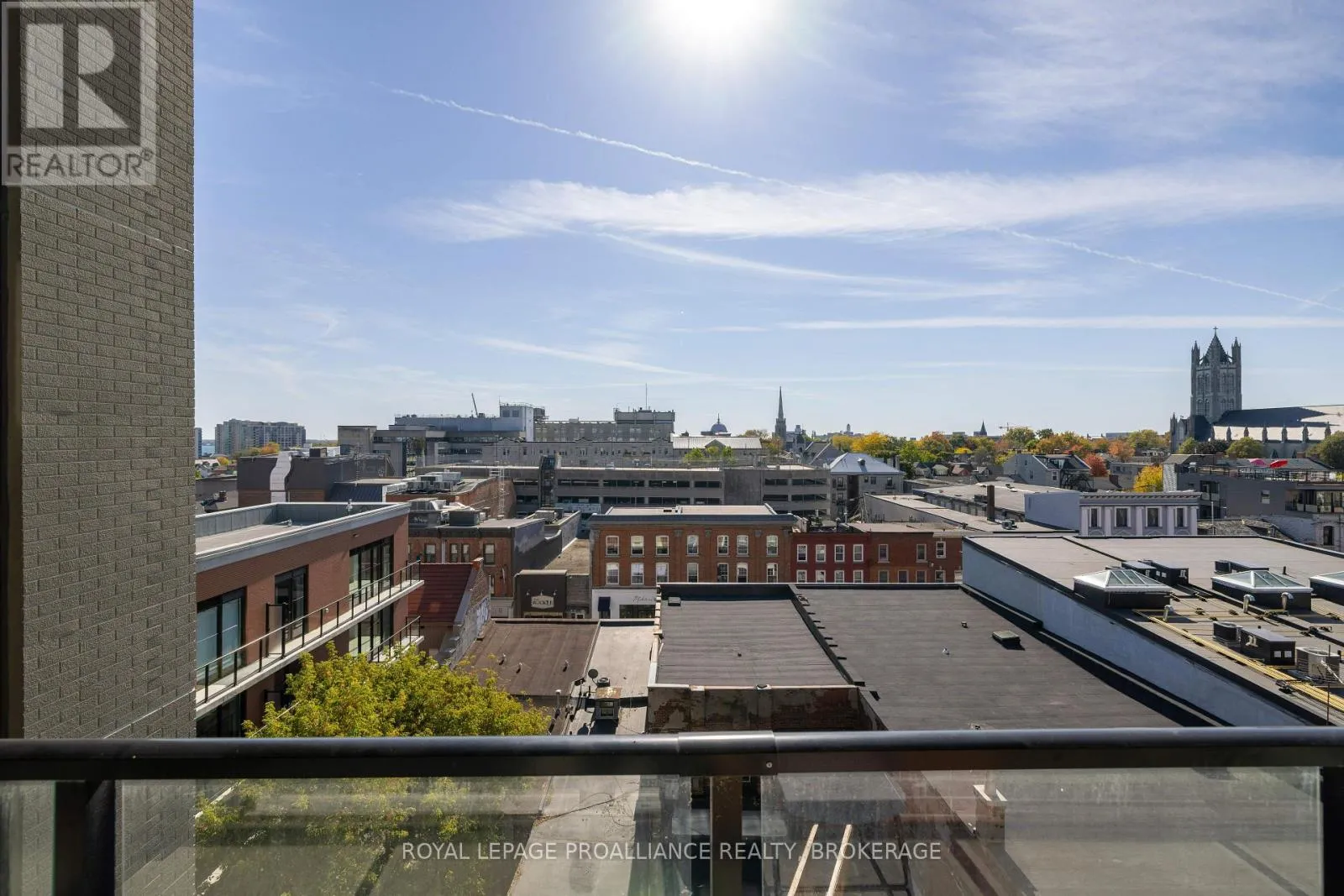 Princess & Sydenham Street Step into modern living with this stunning 600+ sq.ft. unit on the seventh floor of Kingston's newest condo development! Features include a spacious bedroom and dedicated office area, perfect for working from home, two full bathrooms for added convenience, a bright and sunny living area with patio doors leading to a balcony with expansive views of downtown, in-suite laundry for effortless living and a dedicated parking space and secure bike storage. This exceptional building offers a lifestyle like no other with a rooftop patio complete with barbecues, a yoga studio, meeting rooms, and a stylish party lounge for entertaining friends and family. All of this is just steps away from the vibrant Princess Street, where you can explore local shops, eateries, and cultural attractions. Don't miss your change to own a piece of this urban oasis! Whether you're a first-time buyer, looking to downsize, or seek a lucrative investment opportunity, this condo is perfect to you! (id:27476)