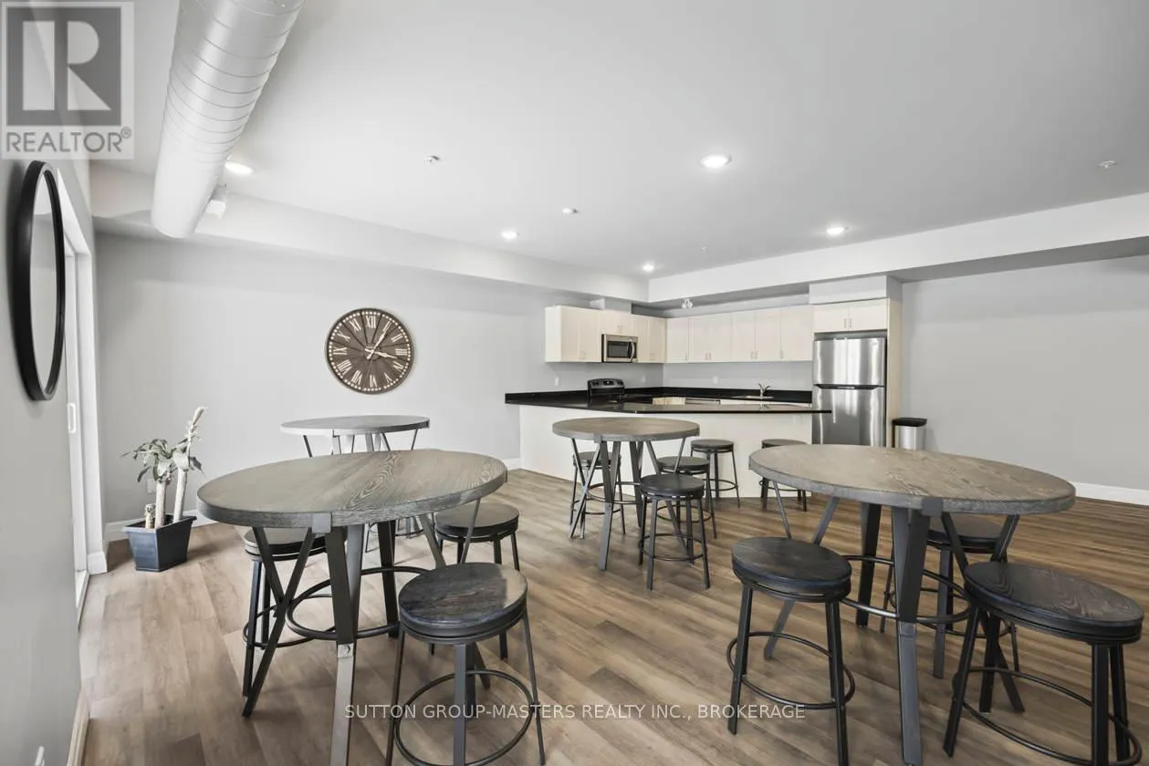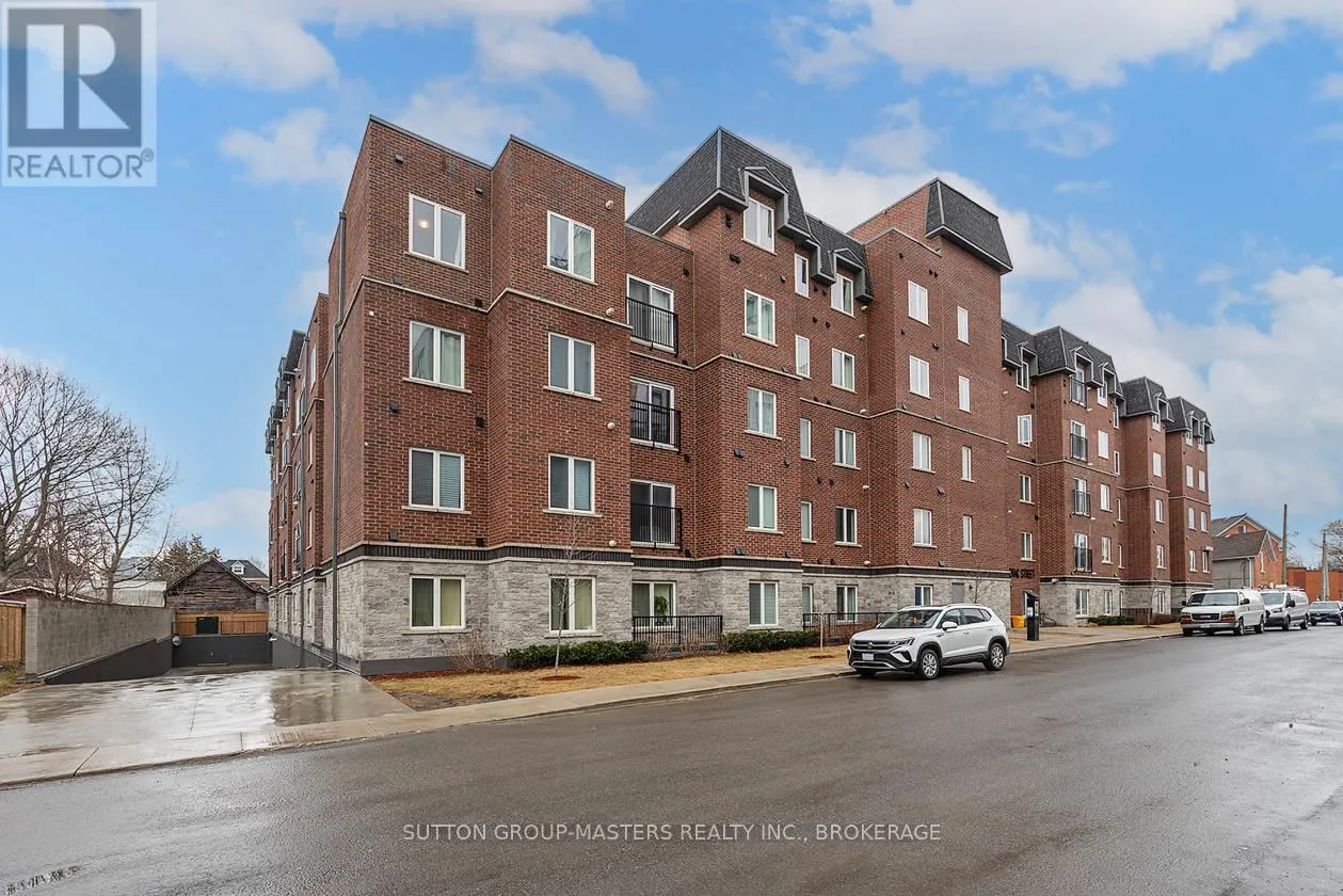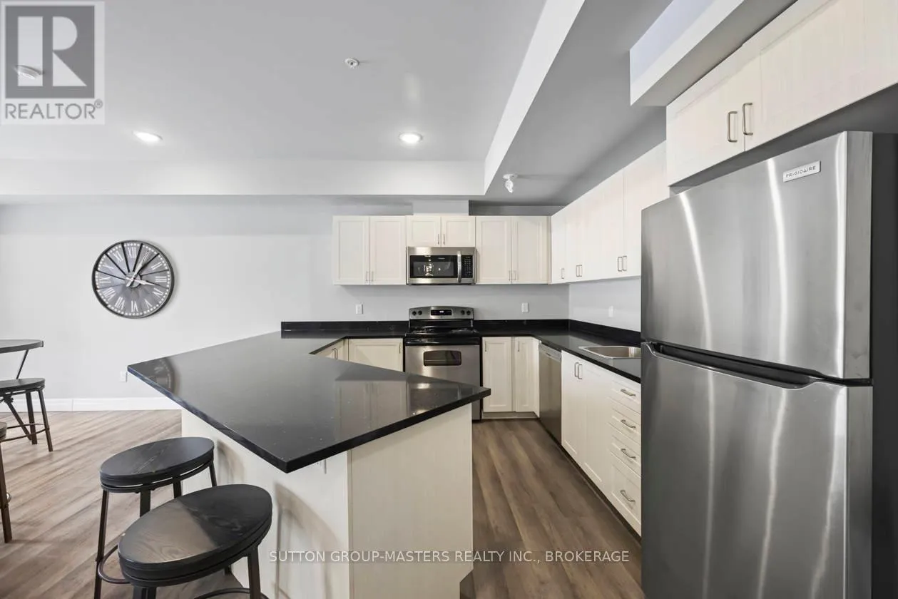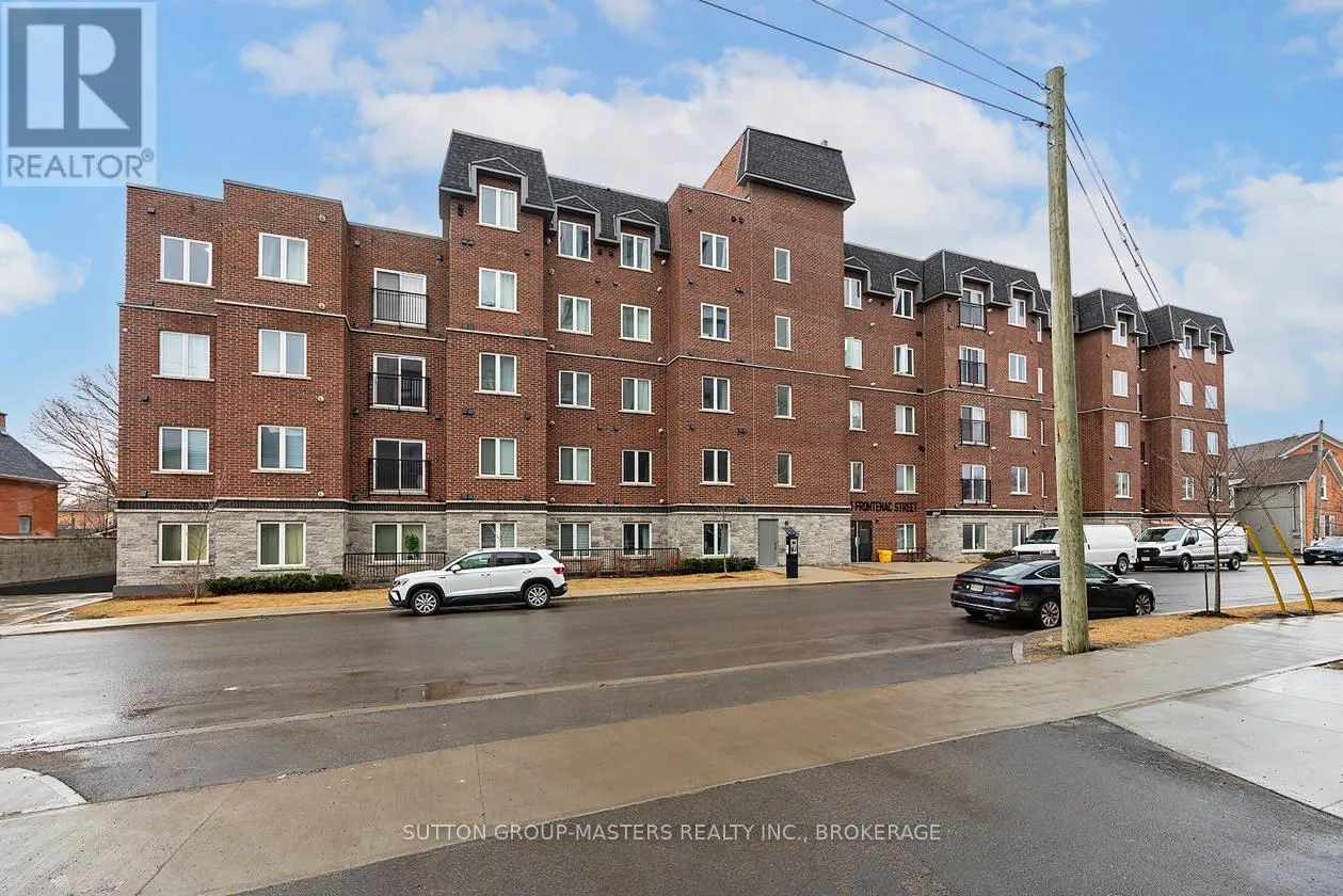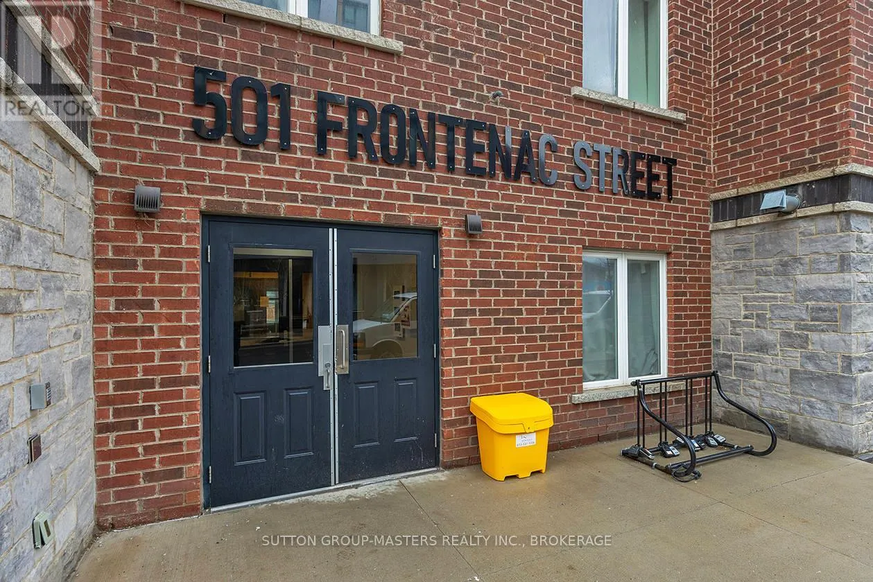Cross Streets: Princess and Frontenac. ** Directions: Princess to Frontenac St. Prime location in one of Kingston's newer, meticulously managed condominium buildings, just a short walk to Queen's University and all the amenities of the Limestone City's vibrant downtown core. Situated on the desirable 4th floor, this bright and inviting unit offers a fantastic open-concept layout with soaring ceilings, durable laminate flooring, and the convenience of in-suite laundry. Well maintained throughout, the space features neutral décor, stainless steel kitchen appliances, and gleaming quartz countertops in both the kitchen and bathroom. Natural light pours in through the Juliette balcony, offering a pleasant view overlooking the courtyard. This unit also includes exclusive deeded parking in the secure underground garage, conveniently located just steps from the elevator. The building is well equipped with secure front entry, a fitness room, a bookable party room, and an expansive rooftop terrace complete with BBQs - perfect for enjoying time with friends during the warmer months. With easy access to public transit, restaurants, shops, and parks, this is an ideal opportunity for busy professionals or students seeking a low-maintenance lifestyle. All furniture and kitchenware are negotiable, making this a truly move-in-ready option. Come see it for yourself! (id:27476)