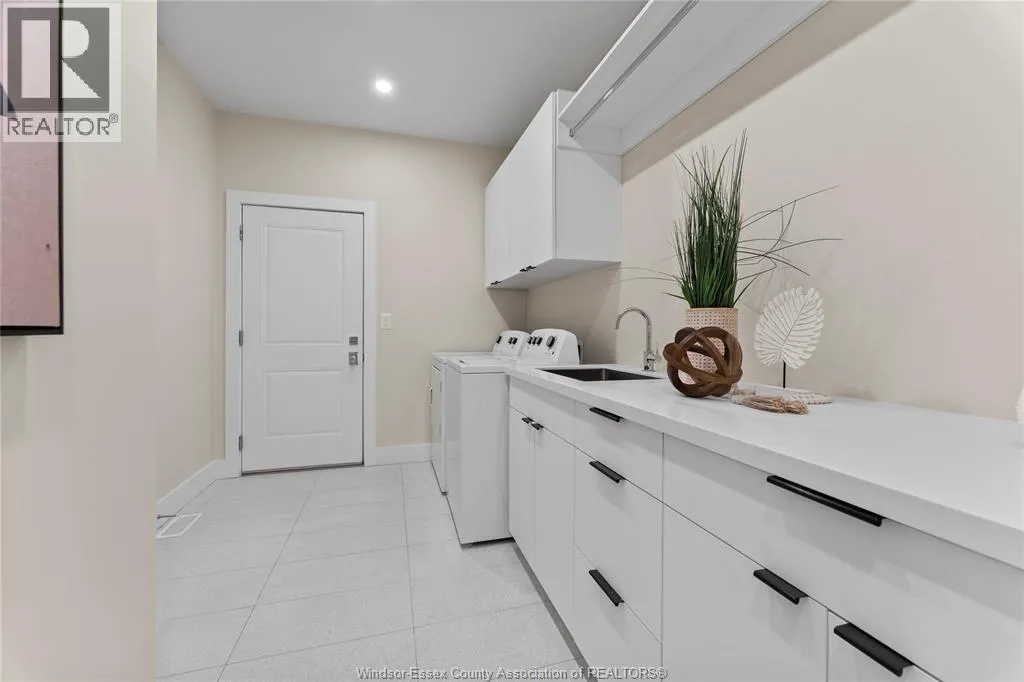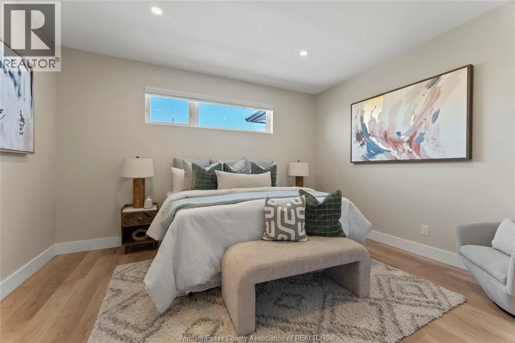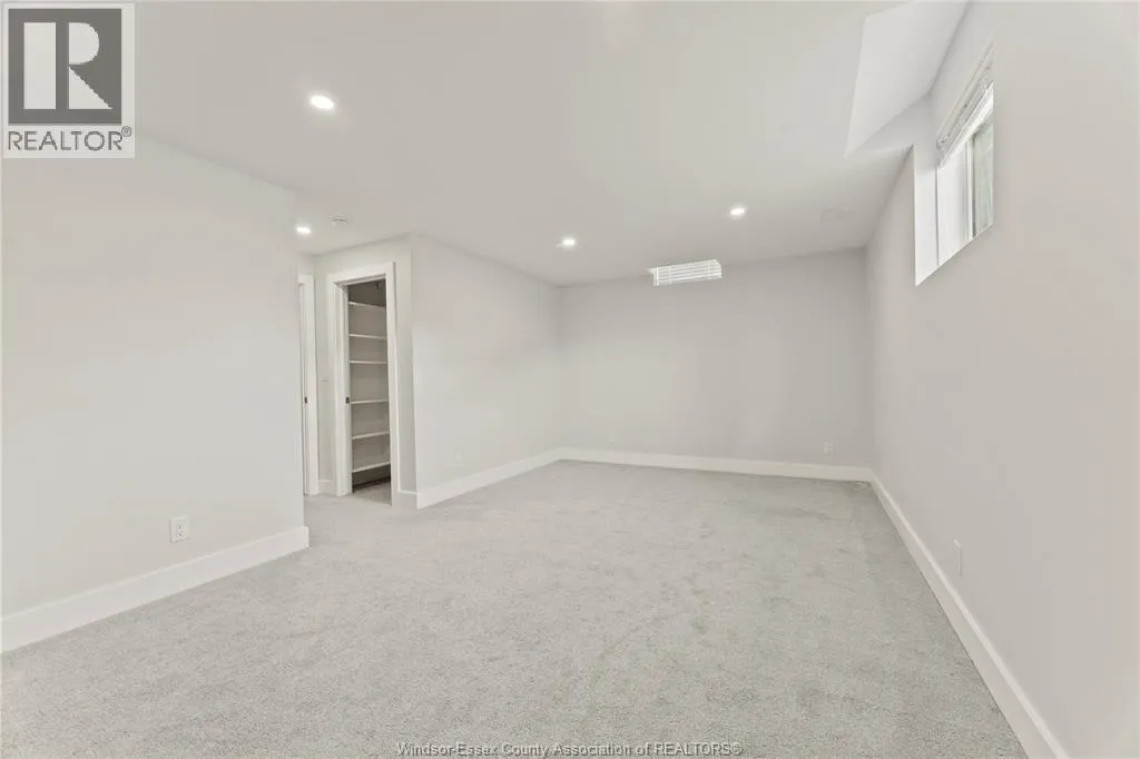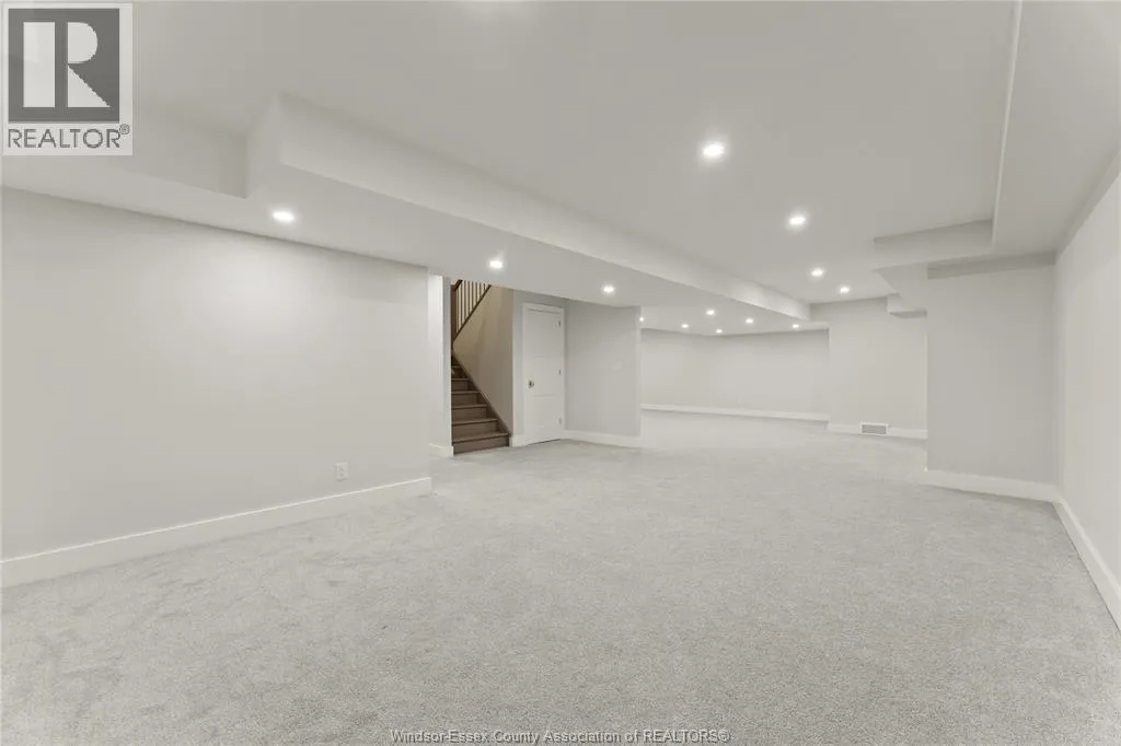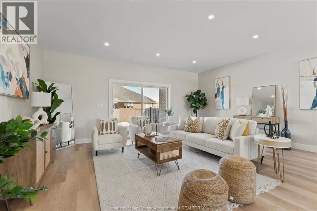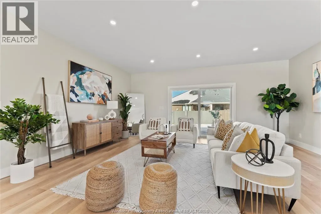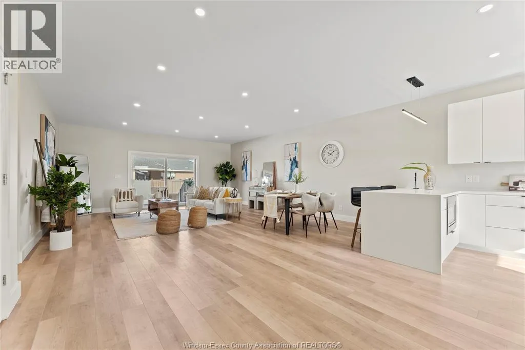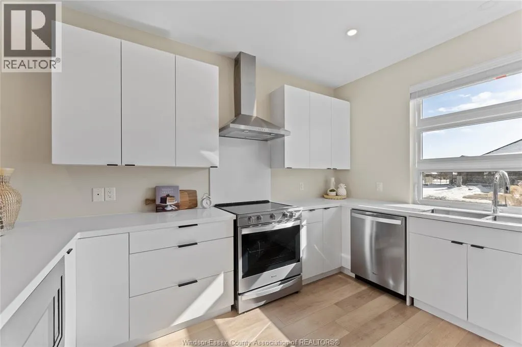 This oversized ranch style semi townhome rests in a prime Kingsville location with upgraded finishes throughout! This 2+1 bedroom, 3 bath contemporary styled design spans approx. 1,550 sqft and is streamlined in a clean and functional retro look. Main floor finishes include porcelain tiles, upgraded wood flooring, curb less walk-in shower, Riobel faucets, clerestory windows, and custom California closets throughout. Open concept kitchen, dining, and family room with warm neutral, nude coloured wood flooring. Fully finished basement with large family & recreation room, spacious bedroom with walk-in California closet, separate 3pc bath and utility. Double car garage leads to organized laundry/mud room. Expansive and fully covered rear patio with outdoor fan, clean modern looking front landscaping, and cement drive. (id:27476)