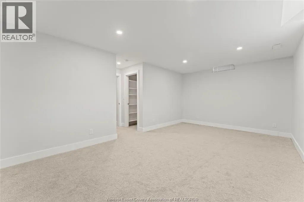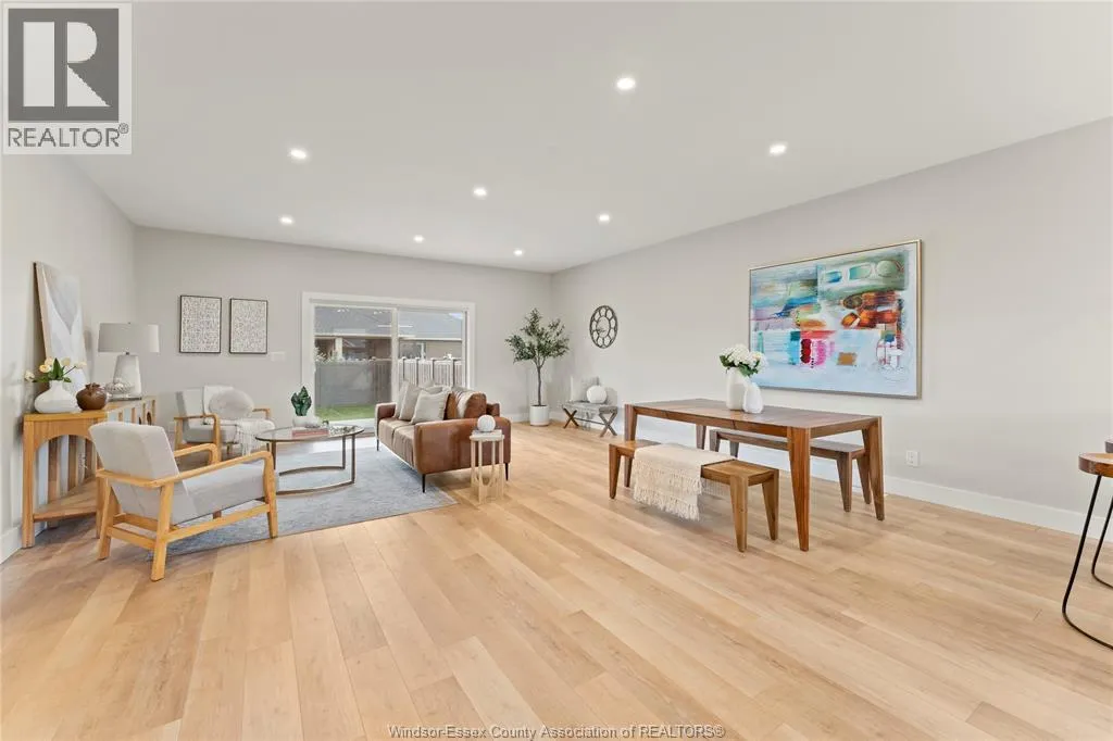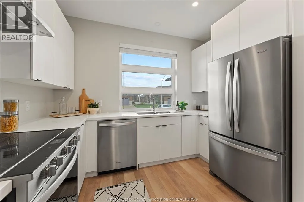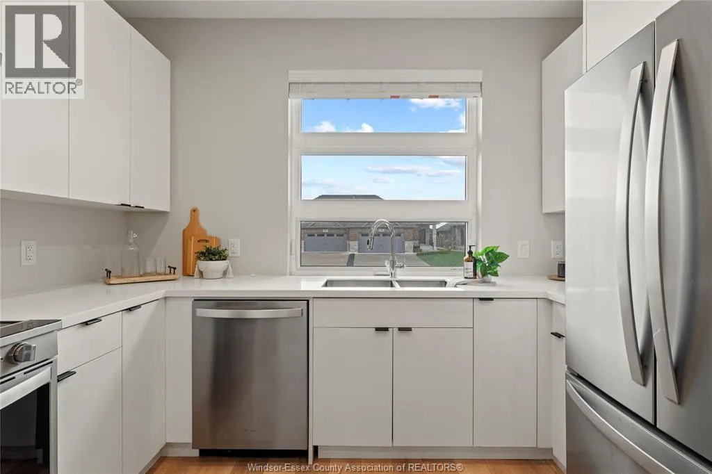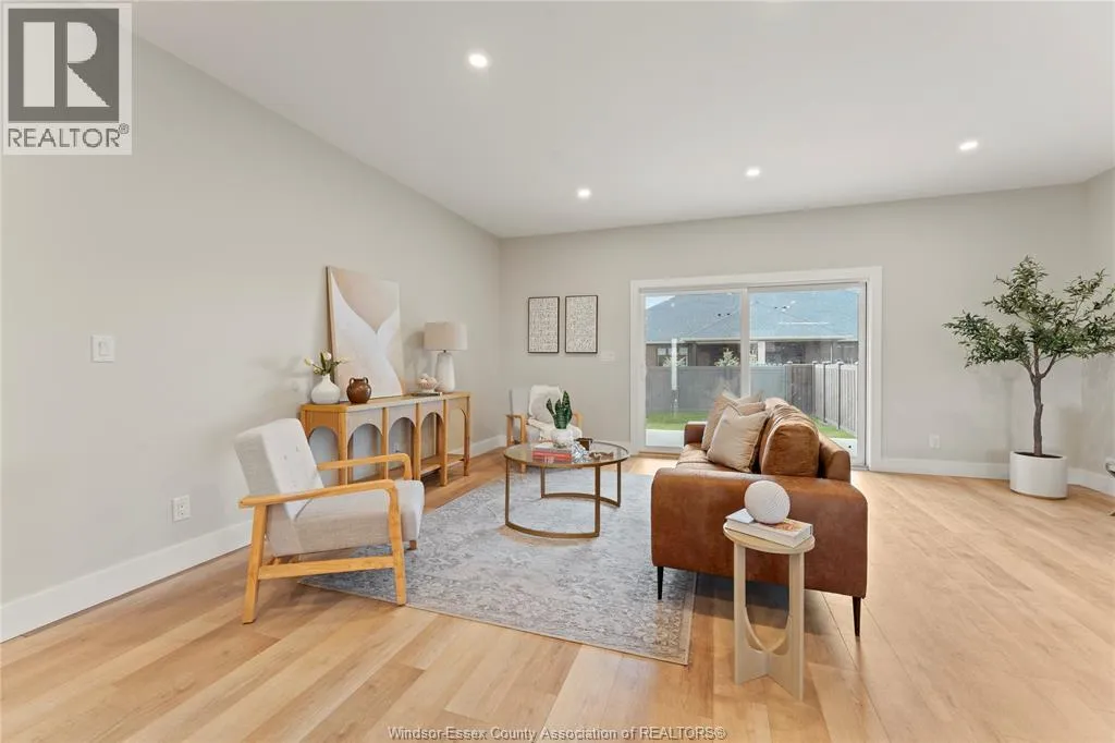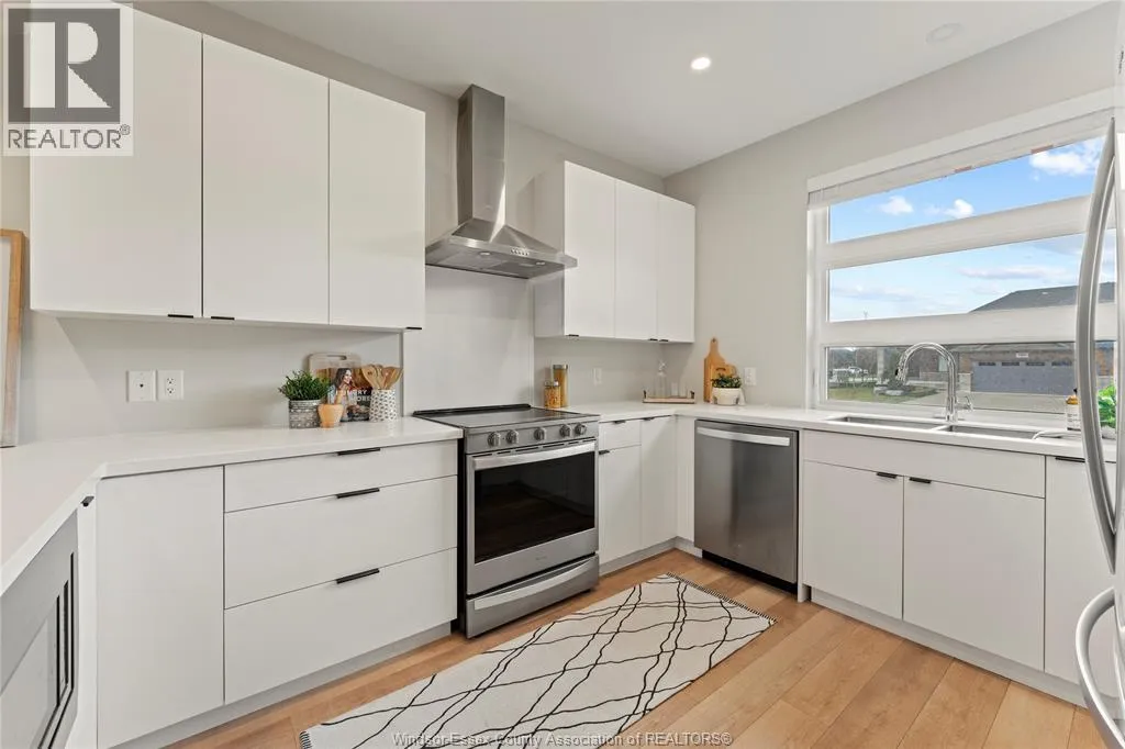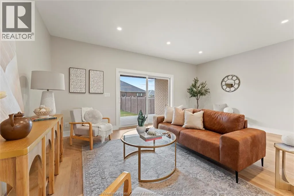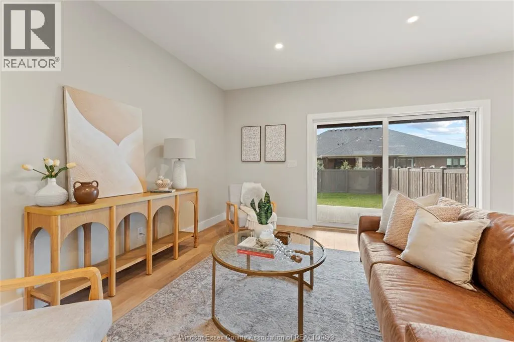 This oversized ranch style semi townhome rests in a prime Kingsville location with upgraded finishes throughout! This 2+1 bedroom, 3 bath contemporary styled design spans approx. 1,550 sqft and is streamlined in a clean and functional retro look. Main floor finishes include porcelain tiles, upgraded wood flooring, curb less walk-in shower, Riobel faucets, clerestory windows, and custom California closets throughout. Open concept kitchen, dining, and family room with warm neutral, nude coloured wood flooring. Fully finished basement with large family & recreation room, spacious bedroom with walk-in California closet, separate 3pc bath and utility. Double car garage leads to organized laundry/mud room. Expansive and fully covered rear patio with outdoor fan, clean modern looking front landscaping, and cement drive. (id:27476)