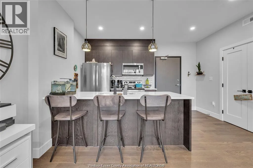 Stunning main level condo in beautiful Kingsville featuring oversized patio doors that fill the space with natural light and open to a private patio/balcony! The open-concept kitchen with island overlooks the dining area and living room with a cozy fireplace, creating a perfect space for both everyday living and entertaining. Beautiful hardwood flooring flows throughout, adding warmth and elegance. This well designed 1-bedroom, 1-bath home also offers the rare convenience of in-suite laundry. An ideal opportunity for first-time buyers, down-sizers, or investors. (id:27476)