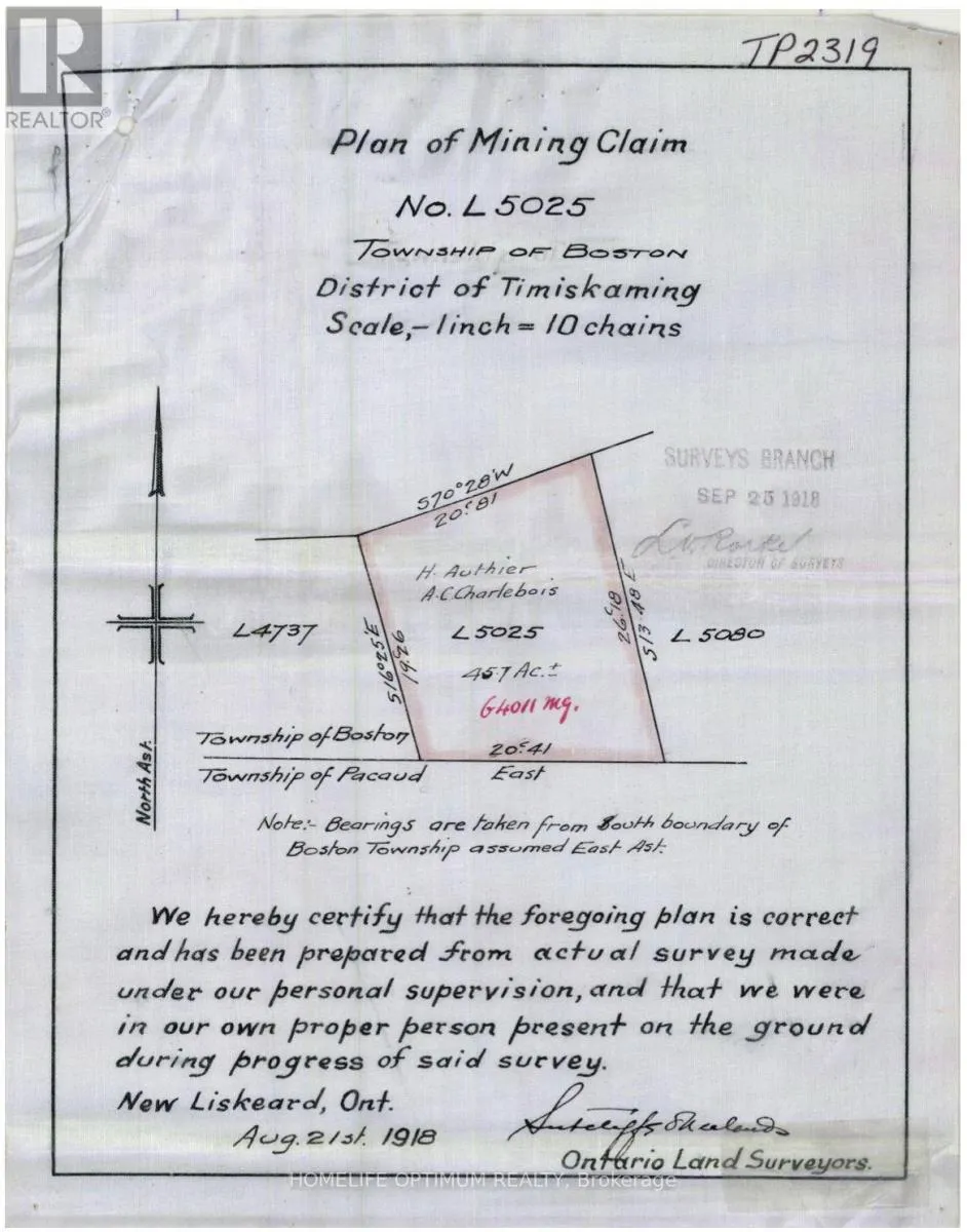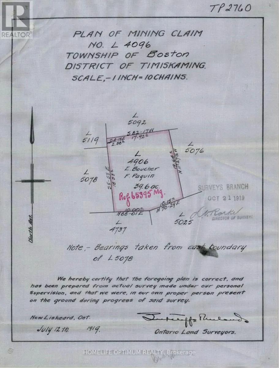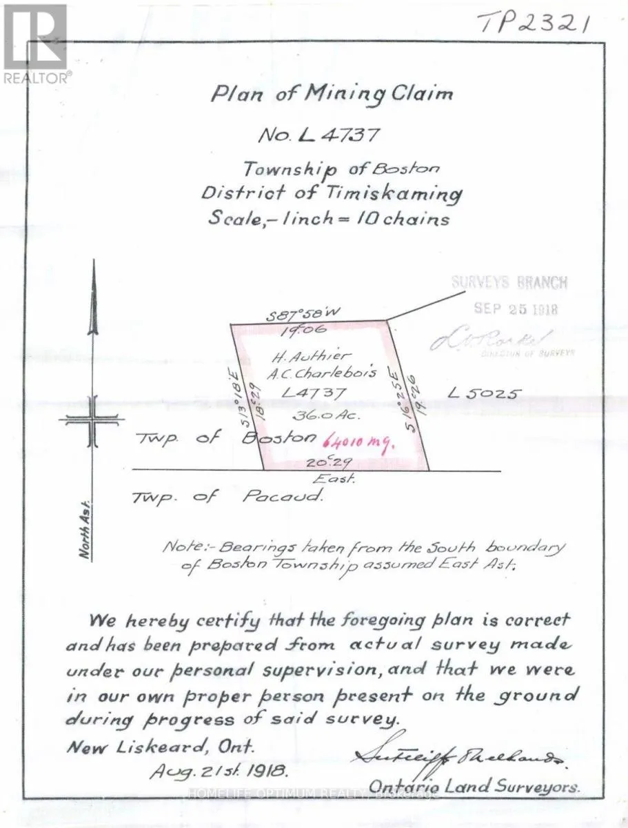 Cross Streets: HWY 564 & HWY 112. ** Directions: GPS:48.01528, -79.90252. This 121.3-acre parcel is located in the UNORGANIZED TOWNSHIP OF BOSTON, in the District of Timisikaming. This property is located between the towns of Kirkland Lake and Englehart. Kirkland Lake is 15km north of the subject property and Englehart is 20km South.According to satellite images, there is a logging road that gives you access in the non-winter months by a 4x4 vehicle. This logging road starts at highway 112, which is roughly 8 km west of the subject property. **Please note: sections of this trail goes through private land. According to the contour maps, the surrounding area is relatively flat and dry.There are many small lakes, ponds, creeks and rivers accessible through crown land.The largest lake in the area is Round Lake.Round Lake has a surface area of 3,000 acres (1,213 hectors)It has an average depth of 60 feet (18 meters) and a max depth of 118 feet (36 meters). Rivers and Creeks in the area include:Boston Creek Mousseau Creek, and The Blanch River. The property is 121.3 acres in size and is made up of three parcels of land.Parcel 19263 = 39.6-acres, Parcel 19264 = 36-acres, Parcel 19265 = 45.7-acres SURFACE RIGHTS, & TREE RIGHTS COME WITH THIS PROPERTY other than the "Pine Rights" which are reserved to the Crown.MINERAL RIGHTS DO NOT COME WITH THIS PROPERTY AS THEY ARE WITH THE CROWN.. (id:27476)