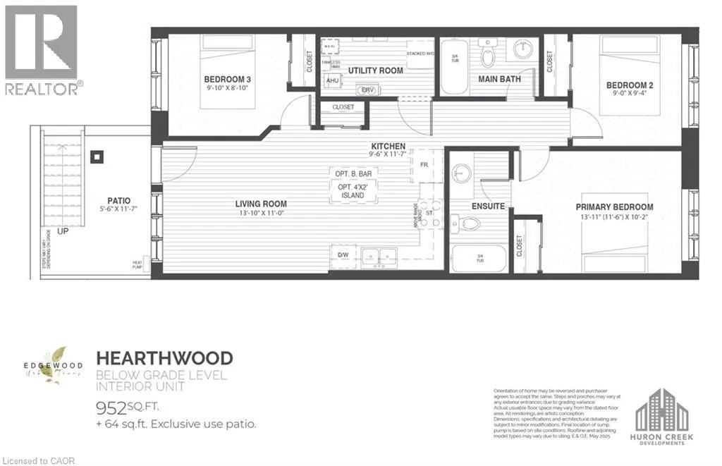 Huron Road to Strasburg Road Welcome to the Hearthwood - a stunning 3-bedroom, 2-bathroom lower level unit in a stacked townhome-style condo, perfectly blending urban convenience with natural tranquility. Tucked into the serene Brigadoon Woods, this thoughtfully designed home offers a spacious open-concept layout ideal for both relaxing and entertaining. Step inside to discover generous-sized bedrooms, including a primary suite with ample closet space and a private ensuite. The patio extends your living space outdoors, offering a peaceful retreat surrounded by mature trees and greenery. Enjoy the best of both worlds â nature at your doorstep and all amenities within easy reach. Located close to top-rated schools, shopping, dining, and with quick access to major highways, this home offers exceptional lifestyle and value. Whether you're a first-time buyer, downsizer, or investor, this beautifully maintained condo is a rare opportunity in a sought-after community. Don't miss it! PLEASE VISIT - (((Sales Centre is located at 35 Trillium Drive, Unit 1 in Huron Creek Developments building - lower level ))) (id:27476)