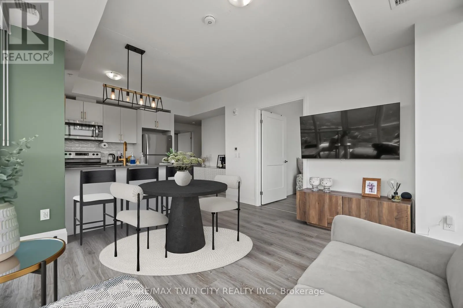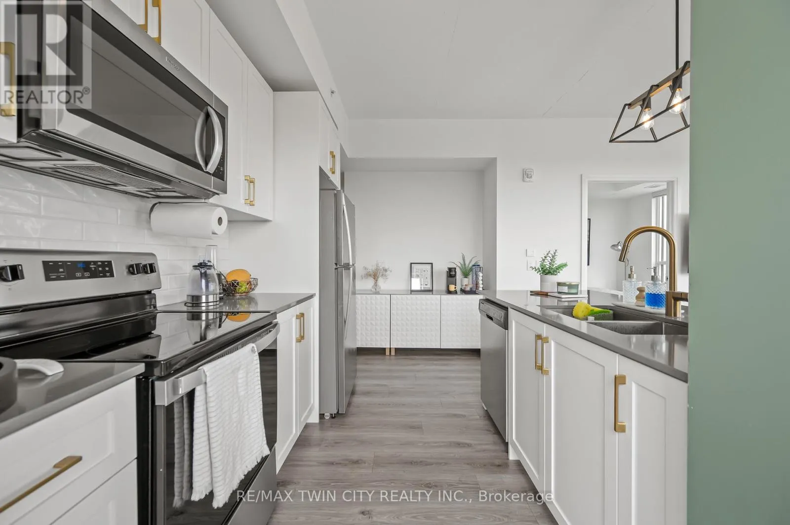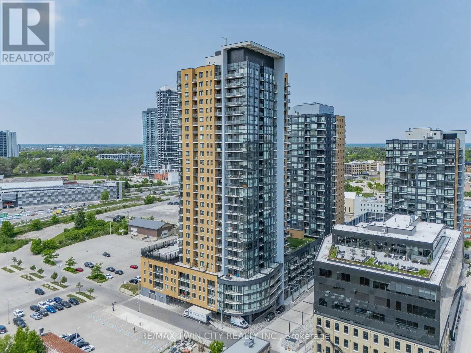 Cross Streets: Victoria Street S. ** Directions: Victoria Street S to Garment Street. Luxury Corner Unit at Garment Street Condos-Experience elevated urban living in the heart of Kitcheners Innovation District. This bright, south-facing corner unit offers 2 bedrooms, 2 bathrooms, a locker, and one underground parking space - perfectly blending style and convenience. Floor-to-ceiling windows and an open-concept layout flood the 811 SF space with natural light. The modern kitchen features quartz countertops, a breakfast bar, subway tile backsplash, and premium appliances, flowing seamlessly into the integrated dining area and living room. Step out onto your extra-wide private balcony and take in panoramic city views. The spacious primary suite boasts a walk-in closet and a stylish 3-piece ensuite, while the second bedroom and full 4-piece bath provide flexibility for guests or a home office. Laminate flooring and in-suite laundry add to the move-in-ready appeal. Garment Street Condos offers exceptional amenities: rooftop pool, fitness centre, yoga studio, basketball court, BBQ terrace, co-working spaces, media room, pet run, concierge service and high-speed internet is included in the condo fees. Situated just steps from top employers like Googles Canadian HQ, Communitech, Miovision, Vidyard, D2L, and ApplyBoard, and minutes to the University of Waterloo's Pharmacy School and new School of Medicine, this location is unmatched for professionals and investors alike. Walk to Victoria Park, the LRT Central Station, the GO Train, and downtown Kitchener's top restaurants, cafes, breweries, and boutiques. Whether you're a professional, investor, or seeking low-maintenance luxury, this is the one. Live where tech, culture, and convenience meet-book your private showing today! (id:27476)