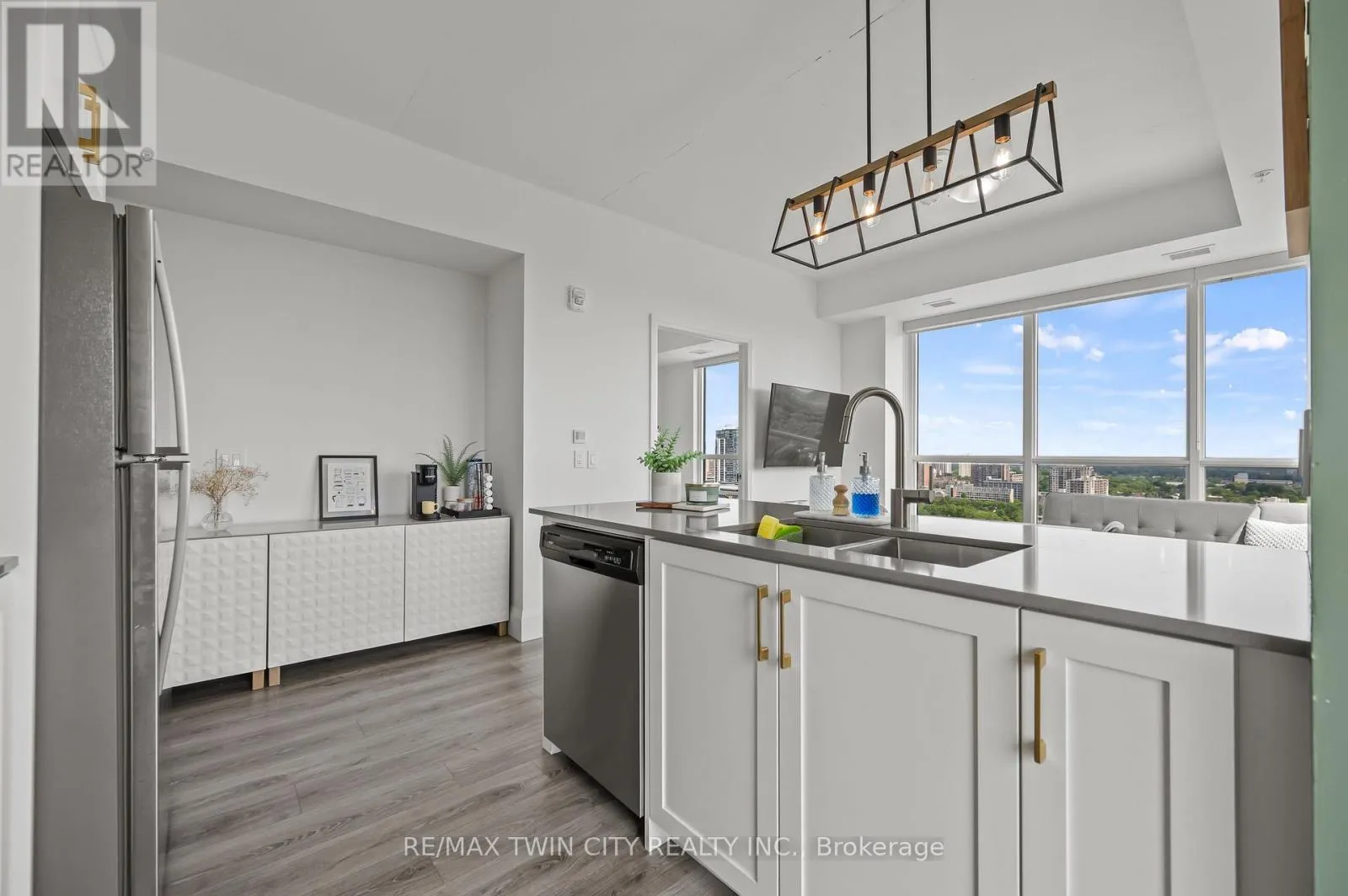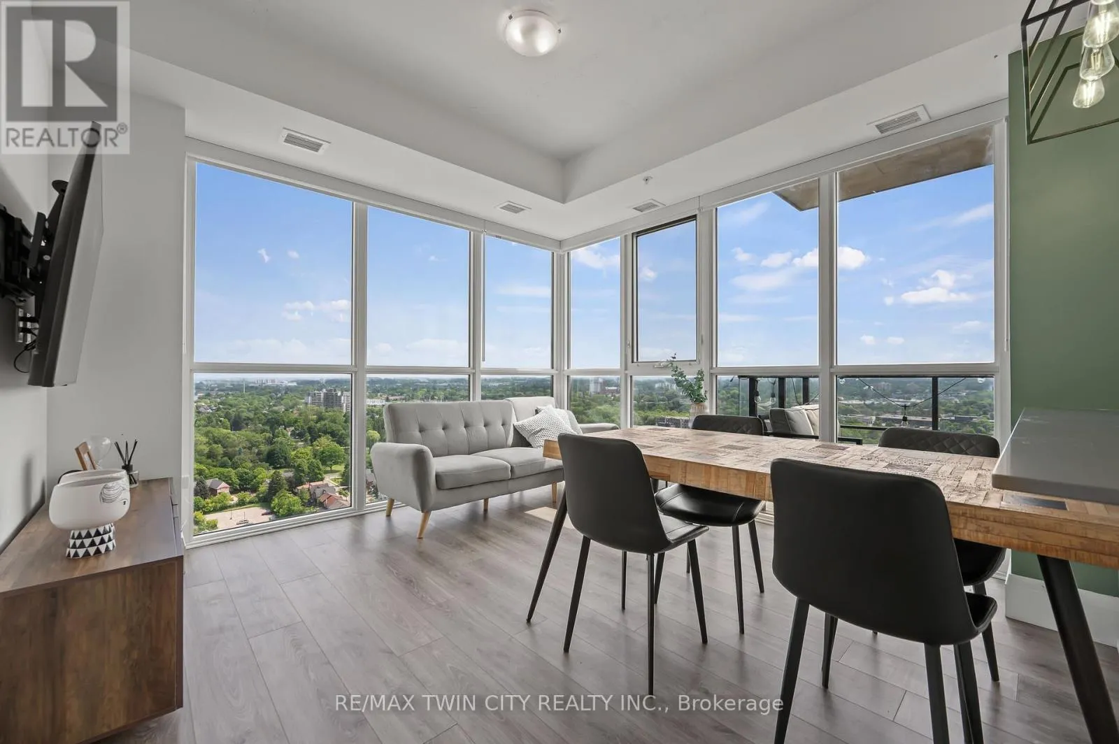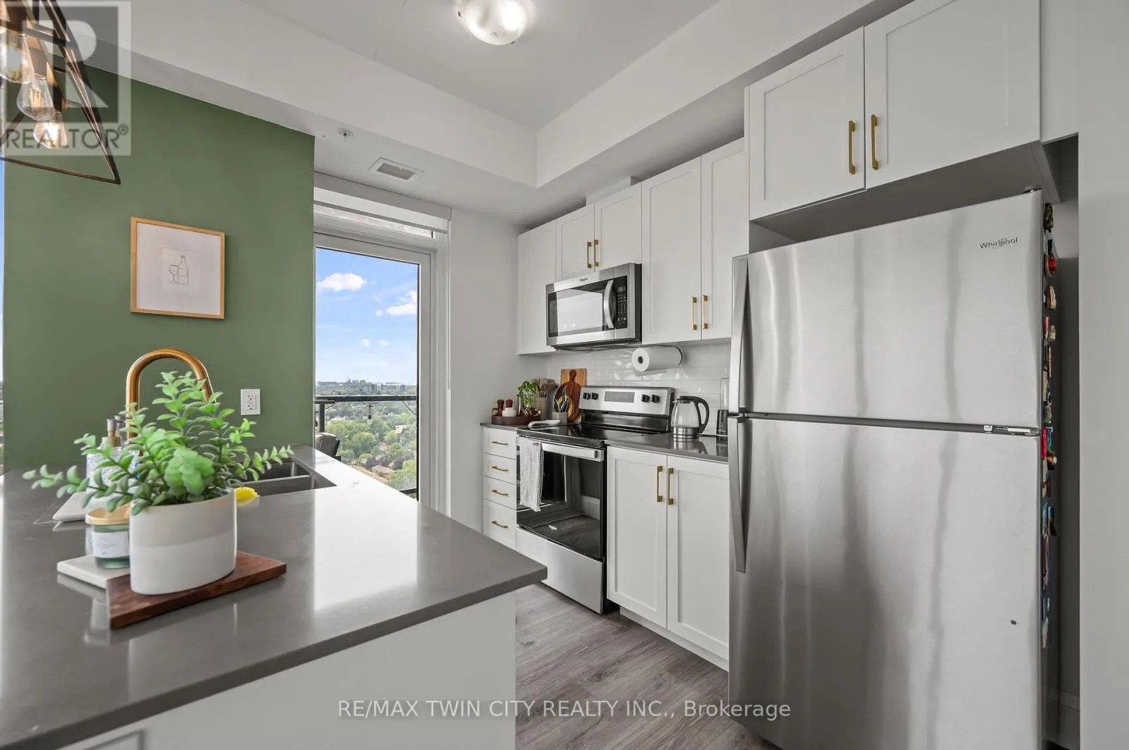 Cross Streets: Victoria Street S. ** Directions: Victoria Street S to Garment Street. Luxury Corner Unit at Garment Street Condos-Experience elevated urban living in the heart of Kitcheners Innovation District. This bright, south-facing corner unit offers 2 bedrooms, 2 bathrooms, a locker, and one underground parking space - perfectly blending style and convenience. Floor-to-ceiling windows and an open-concept layout flood the 811 SF space with natural light. The modern kitchen features quartz countertops, a breakfast bar, subway tile backsplash, and premium appliances, flowing seamlessly into the integrated dining area and living room. Step out onto your extra-wide private balcony and take in panoramic city views. The spacious primary suite boasts a walk-in closet and a stylish 3-piece ensuite, while the second bedroom and full 4-piece bath provide flexibility for guests or a home office. Laminate flooring and in-suite laundry add to the move-in-ready appeal. Garment Street Condos offers exceptional amenities: rooftop pool, fitness centre, yoga studio, basketball court, BBQ terrace, co-working spaces, media room, pet run, concierge service and high-speed internet is included in the condo fees. Situated just steps from top employers like Googles Canadian HQ, Communitech, Miovision, Vidyard, D2L, and ApplyBoard, and minutes to the University of Waterloo's Pharmacy School and new School of Medicine, this location is unmatched for professionals and investors alike. Walk to Victoria Park, the LRT Central Station, the GO Train, and downtown Kitchener's top restaurants, cafes, breweries, and boutiques. Whether you're a professional, investor, or seeking low-maintenance luxury, this is the one. Live where tech, culture, and convenience meet-book your private showing today! (id:27476)