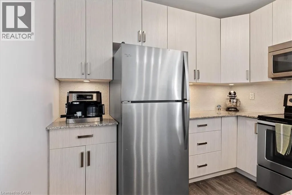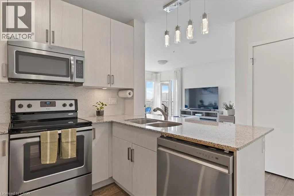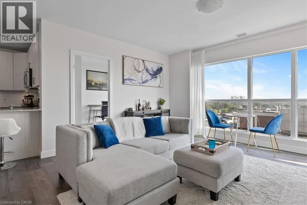 King & Victoria Available for immediate occupancy! welcome to this bright and modern 2-bedroom, 1-bath condo featuring a stunning corner balcony with panoramic views of downtown Kitchener. Floor-to-ceiling windows flood the space with natural light, while the open-concept living area offers flexibility for dining, lounging, or working from home. The contemporary kitchen is equipped with quartz countertops and four stainless steel appliances, including a new dishwasher (2024). Additional highlights include in-suite laundry, a front-entry closet, and two large closets in the primary bedroom for ample storage. The spacious bathroom is designed for comfort and accessibility. Recent upgrades include modern island lighting (2023), an undercounter water filtration system (2024), and fresh paint throughout (2023) making this home move-in ready. 1 underground parking is included, and residents enjoy access to top-tier building amenities such as a fitness centre, rooftop patio with BBQs, and a theatre room. One Victoria offers unmatched convenience with LRT and GO Train, FLIXBUS access just steps away with daily direct trips to Toronto Pearson Airport and Union Station- Downtown Toronto. You're also within walking distance of the School of Pharmacy, Innovation District, and Google headquarters. This condo has not only the convenience but the comfort you're searching for! -- Book your showing today! (id:27476)