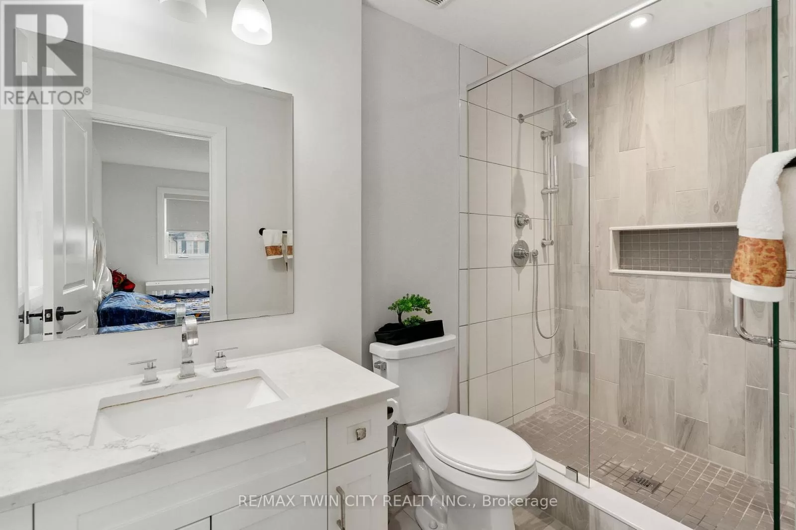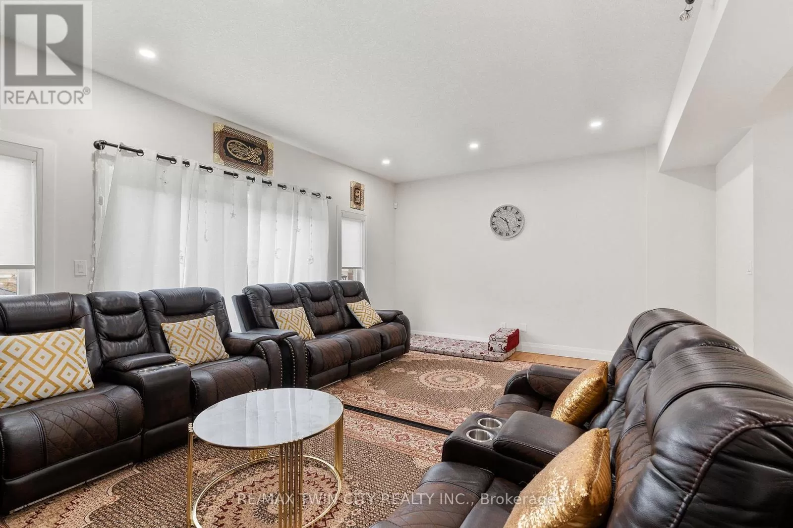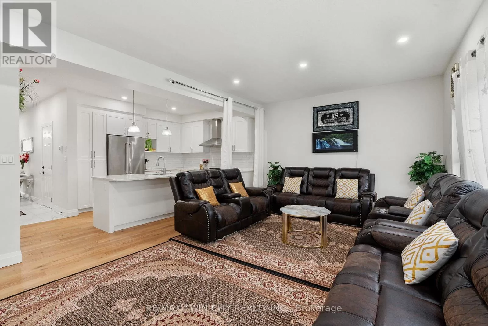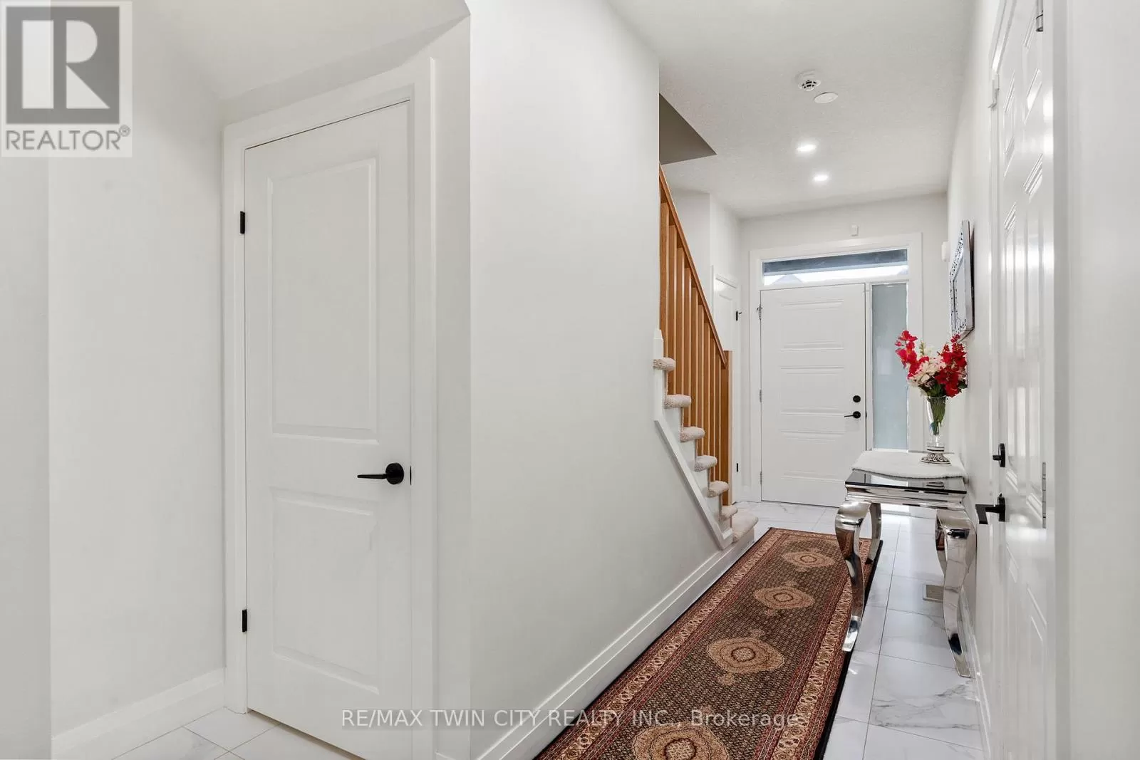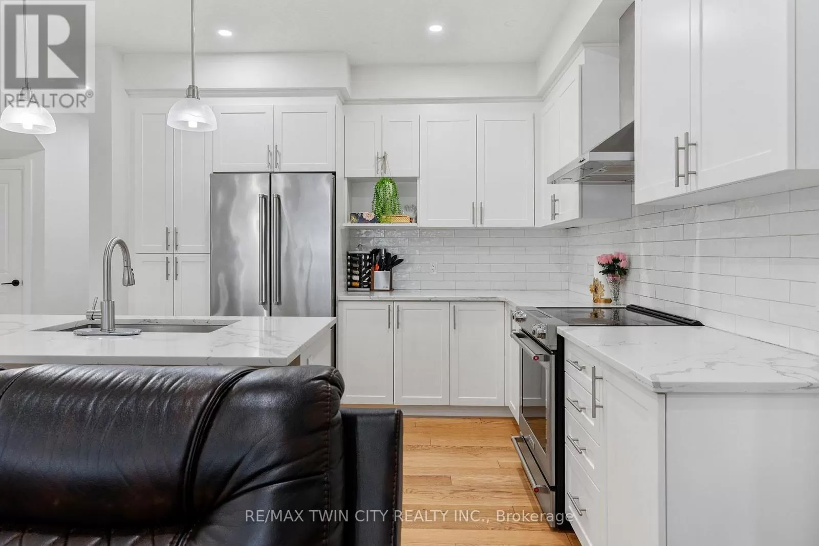 Cross Streets: Forest Creek Drive. ** Directions: From Homer Watson Blvd turn at the light onto Doon South Dr. Take first right at the roundabout onto Doon Mills Dr. Turn left onto Appleridge Dr. Left onto Forest Creek Dr. Take first right onto Pondcliffe Dr. House on left halfway down the street. Welcome to this stunning 2-storey home in the prestigious Doon South neighbourhood, offering over 2,300 sq. ft. of beautifully finished living space that blends custom craftsmanship with modern elegance. From the moment you enter, you're greeted by oversized marble-look tiles and a bright, spacious layout featuring engineered hardwood floors, soaring 9 ceilings, and an open-concept design perfect for family living and entertaining. The chefs kitchen boasts full-height custom cabinetry, quartz countertops, a walk-in pantry, timeless subway tile backsplash, and a full 2020 stainless steel KitchenAid appliance package. Oversized 8 patio doors lead to a fully sodded and fenced backyard with space for a future deck, garden, or play area. Upstairs, enjoy the convenience of second-floor laundry and three sun-filled bedrooms with blackout window coverings, including a luxurious primary suite with a spa-inspired ensuite featuring a glass walk-in shower and rainfall head. The unfinished basement with a 2-piece washroom rough-in offers excellent potential for future development. Additional features include central A/C, water softener, humidifier, and a stamped concrete/paver stone 3-car driveway. Ideally located just minutes from Hwy 401, this quality Ridgeview home is a rare opportunity where luxury, comfort, and location come together seamlessly. (id:27476)