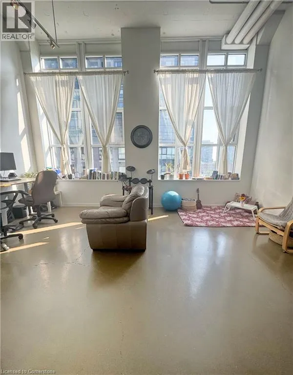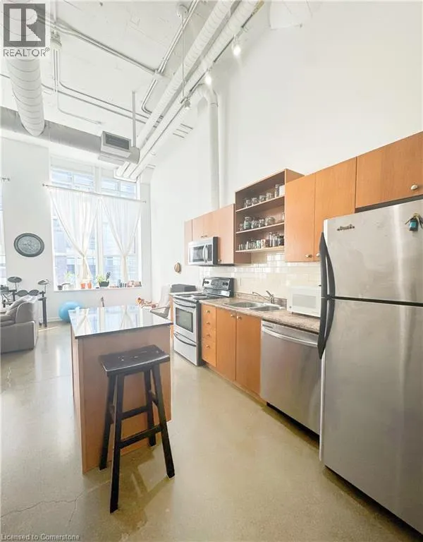 King and Victoria Bright, stylish loft just steps from Google and University of Waterloo School of Pharmacy in Kitchenerâs vibrant Innovation District! An entire wall of south-facing windows floods the space with natural light, complemented by soaring 13ft ceilings, polished concrete floors, and a modern open-concept design. The kitchen features a granite island, sleek cabinetry, and stainless steel appliancesâperfect for cooking and entertaining. Additional perks include in-suite laundry, a storage locker, parking, and access to a rooftop patio with BBQ. Walk to the LRT, the Tannery, Victoria Park, and countless shops and restaurants. Donât miss out on this one-of-a-kind opportunityâwhether youâre looking to invest or call this home! (id:27476)