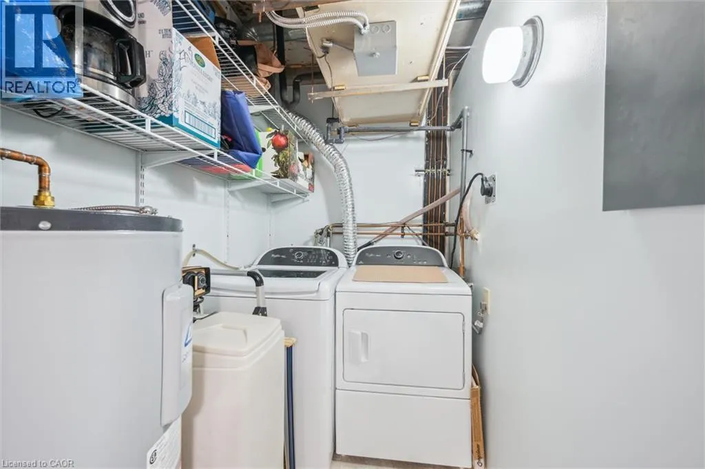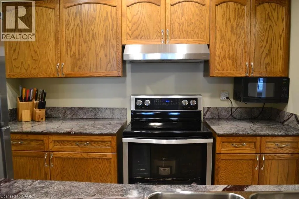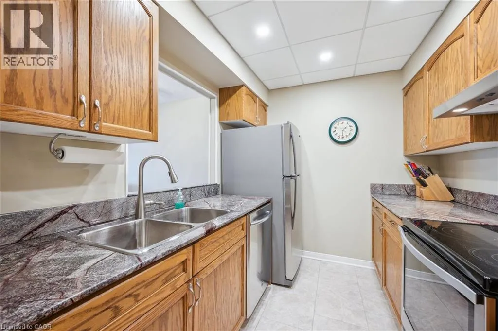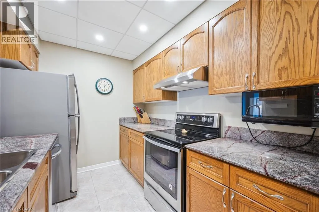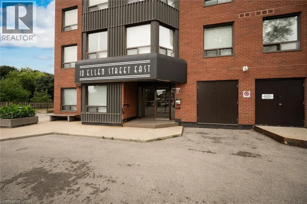 Queen Street/Ellen Street Bright and spacious 1- bedroom in a quiet well-maintained building. Open concept living and dining area, large bedroom, large walk-in closet, in-suite laundry room with full sized Whirlpool washer and dryer. Brightly lit remodeled kitchen with nearly new Whirlpool appliances: full size stove with convection oven, microwave, full size refrigerator, Maytag dishwasher and drinking water filtration system. Additional perks are owner water heater, water softener and one underground parking space. Located across the street from Center in The Square, public library, parks, shopping with quick access to transit, VIA Rail station and expressway. Pristine and clean as long time owner uses it only 6-8 weeks annually. Charming, move-in ready home in a prime location. (id:27476)