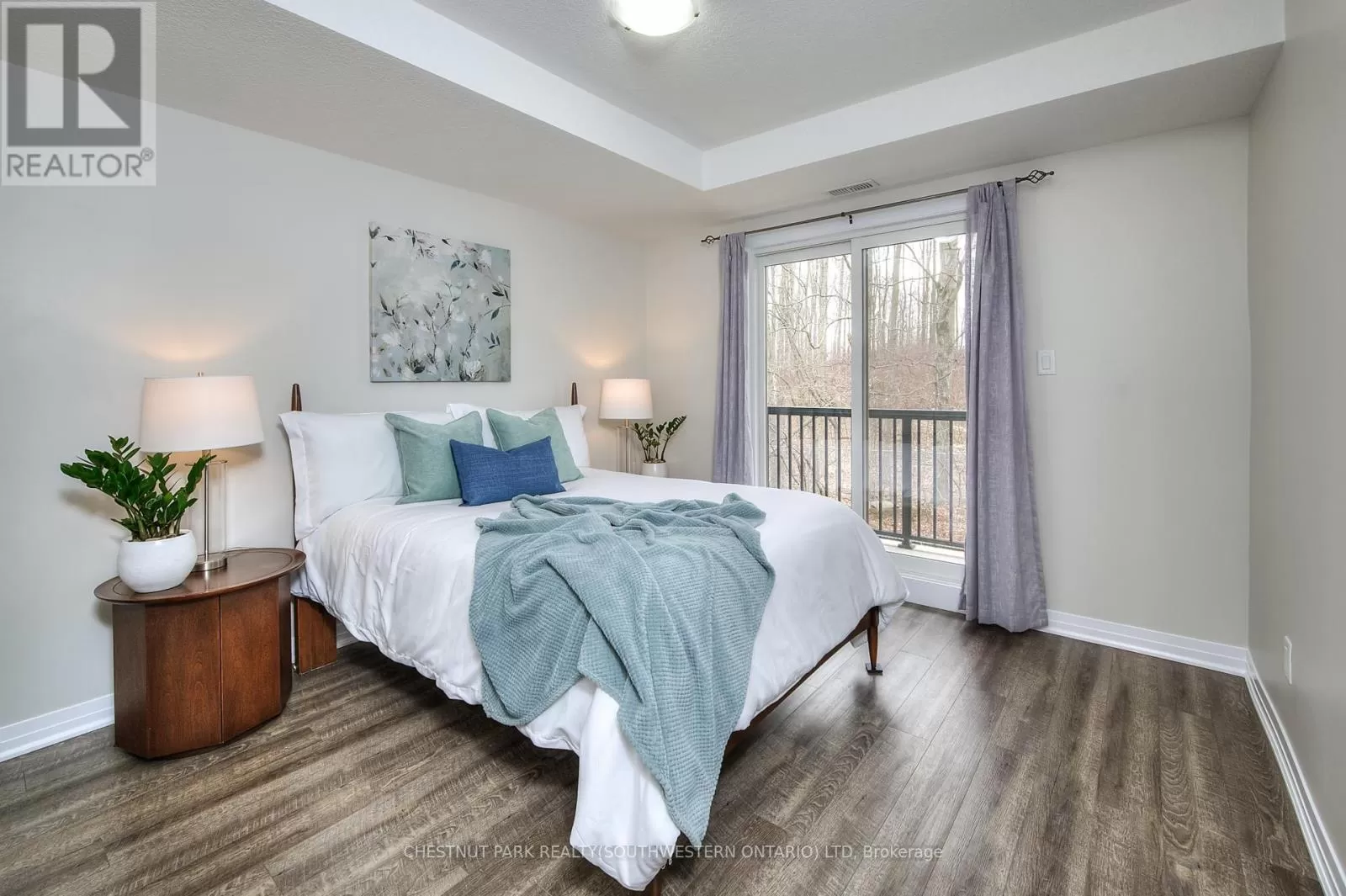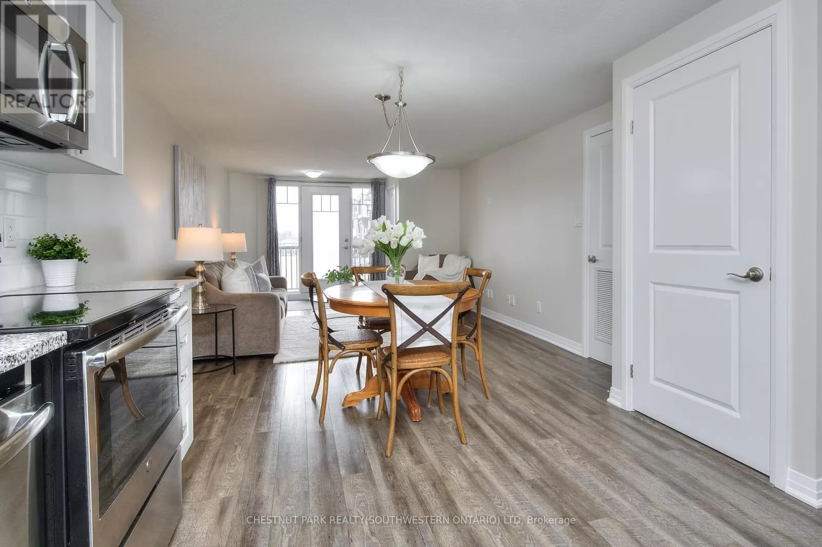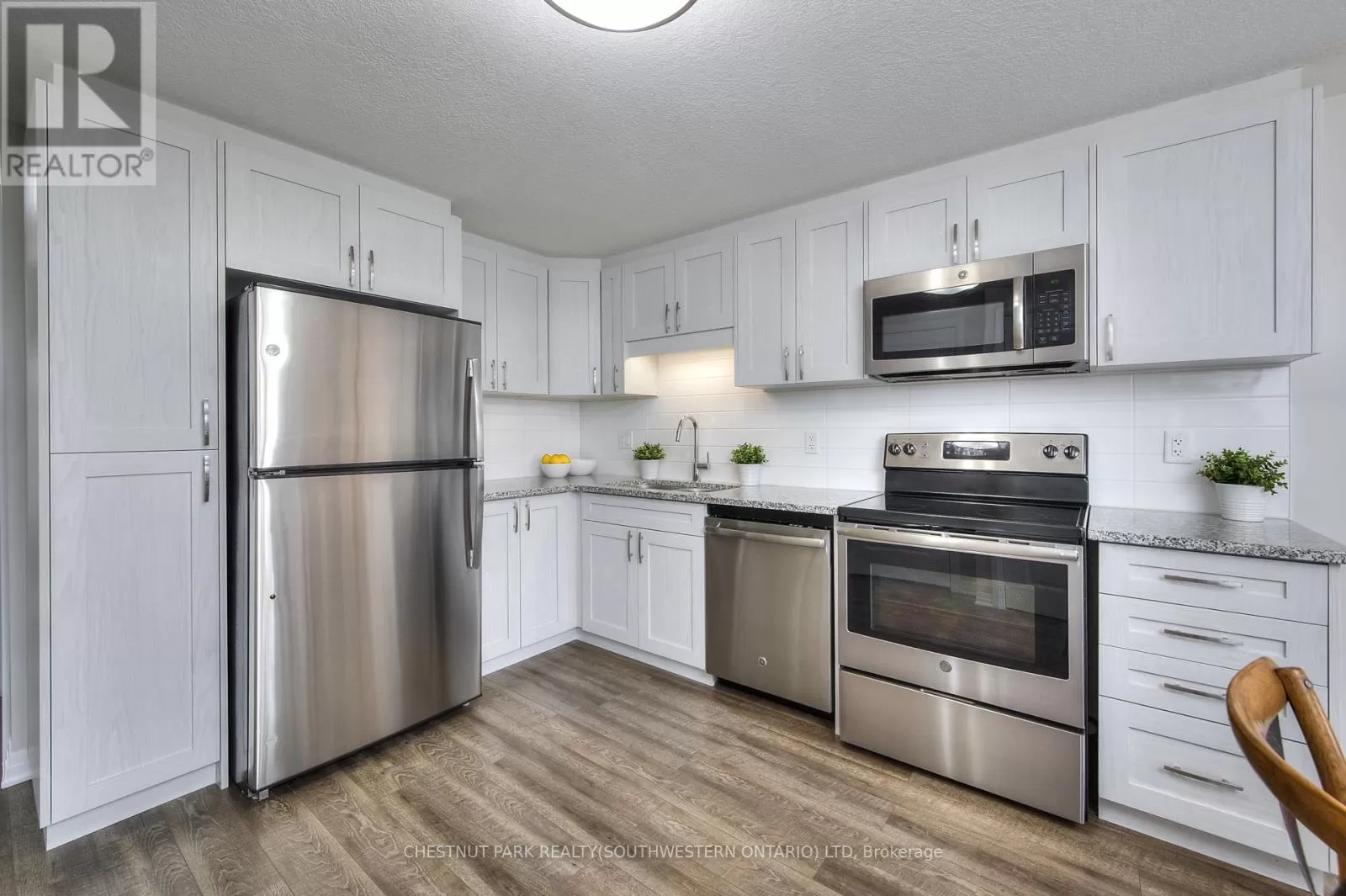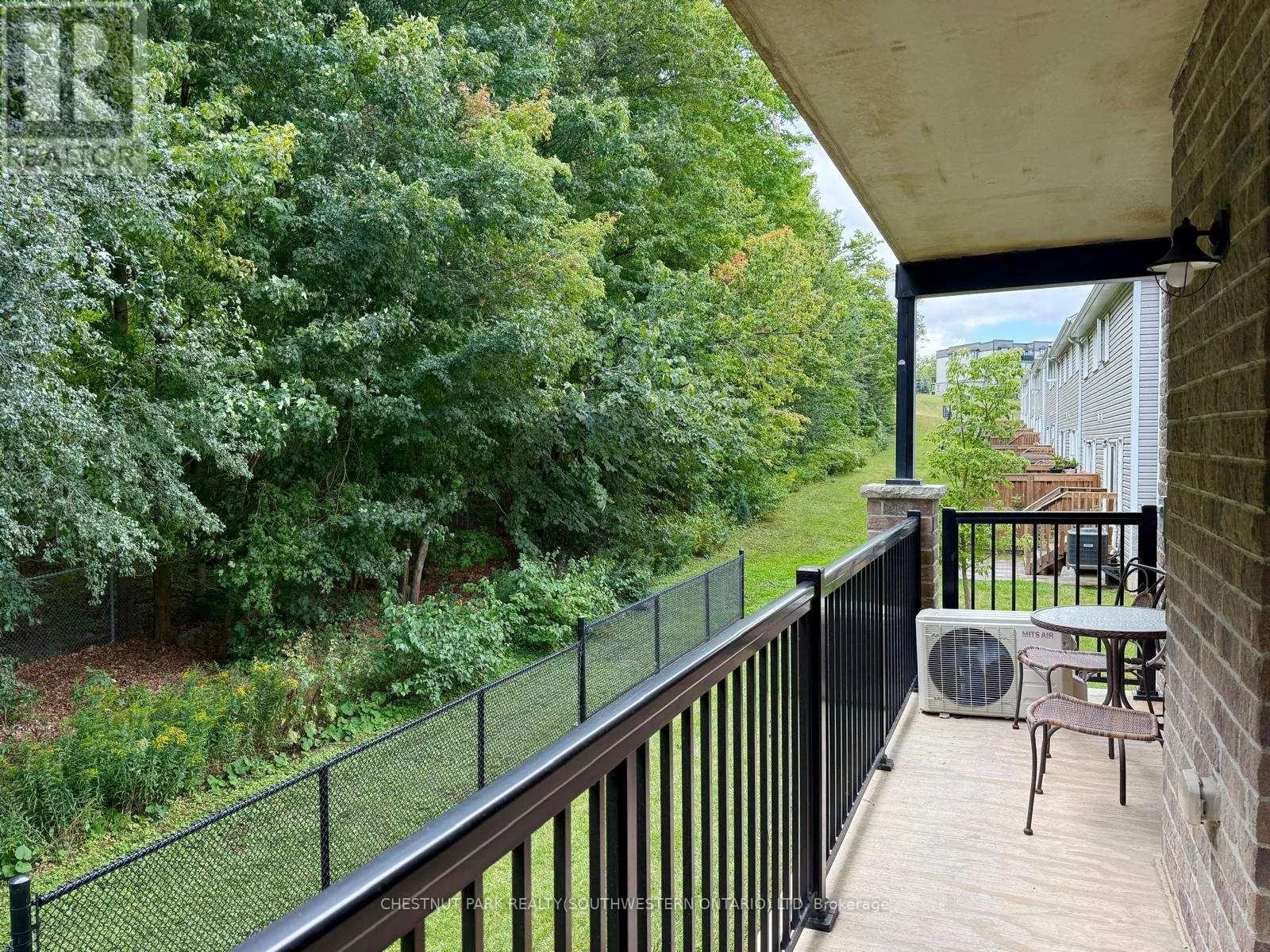 Cross Streets: Ottawa Street S & Trussler Road. ** Directions: Ottawa Street S & Trussler Road. This beautiful MAIN FLOOR stacked townhome shows like a model and features over 865 square feet of bright, open-concept living space all on a single level! Two good sized bedrooms, ample closet space, one full bathroom and in-suite full sized laundry compliment the stylish principal living spaces on display here. Completely carpet-free with upgraded luxury vinyl plank flooring and freshly painted throughout. The upgraded kitchen features a large built-in pantry alongside the refrigerator, as well as stylish granite countertops. This units premium location is settled at the edge of the development, and its spacious private patio overlooks absolutely beautiful mature woodland all while being only five minutes from the many amenities of the Sunrise Shopping Centre, excellent schools and the expressway at Homer Watson Boulevard. One dedicated parking spot is included! Main floor units do not come for sale often and this one is move in ready! (id:27476)