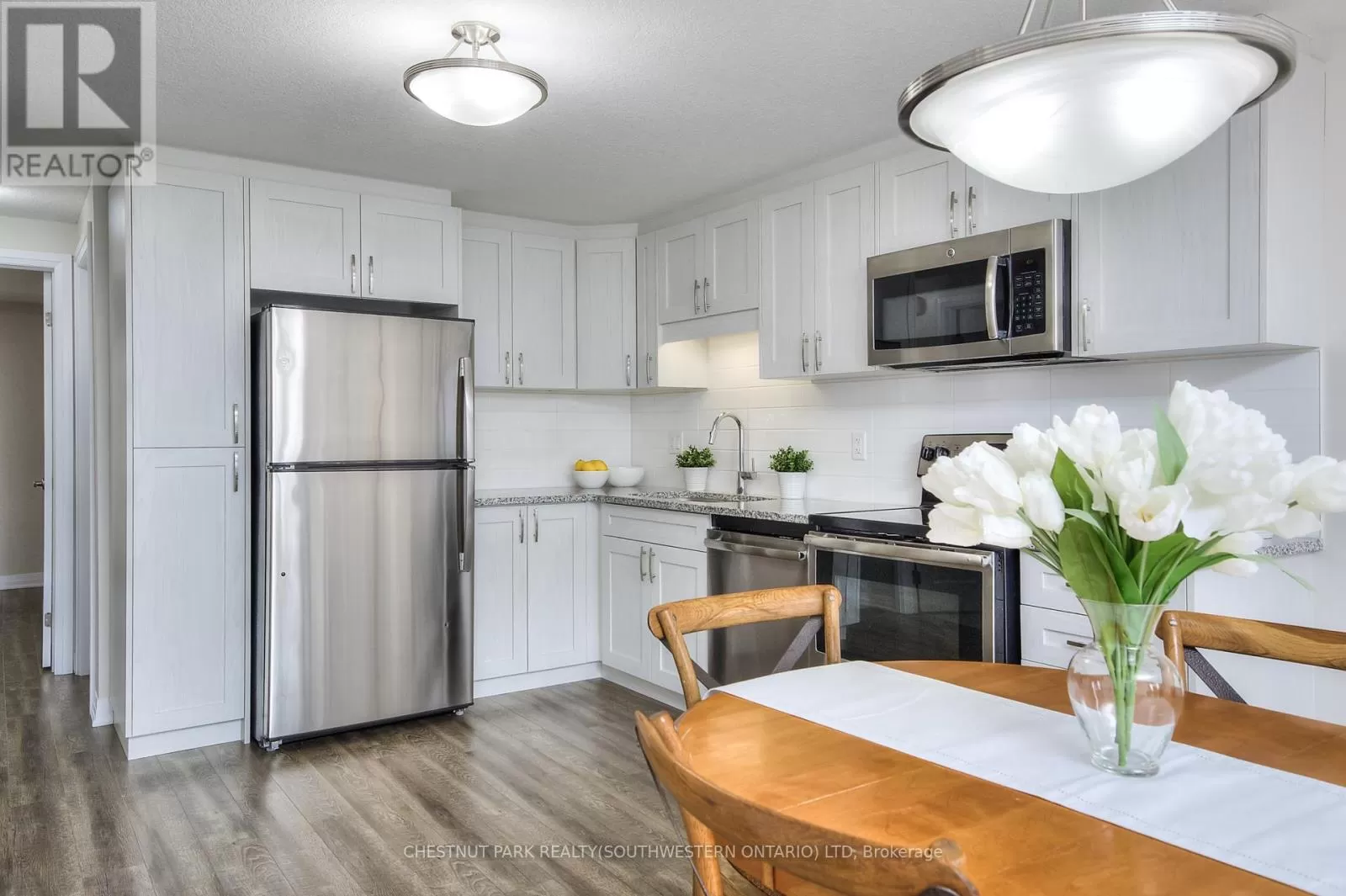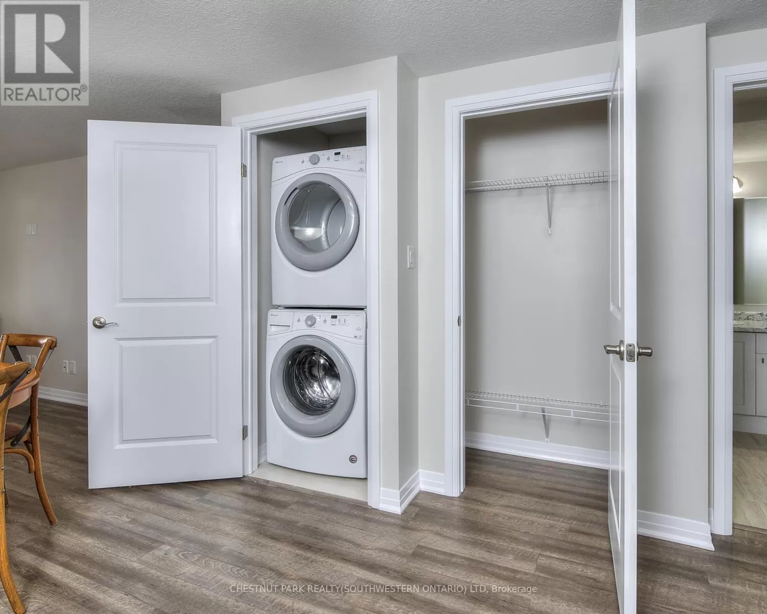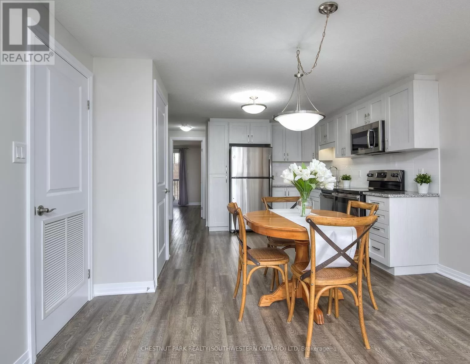 Cross Streets: Ottawa Street S & Trussler Road. ** Directions: Ottawa Street S & Trussler Road. This beautiful MAIN FLOOR stacked townhome shows like a model and features over 865 square feet of bright, open-concept living space all on a single level! Two good sized bedrooms, ample closet space, one full bathroom and in-suite full sized laundry compliment the stylish principal living spaces on display here. Completely carpet-free with upgraded luxury vinyl plank flooring and freshly painted throughout. The upgraded kitchen features a large built-in pantry alongside the refrigerator, as well as stylish granite countertops. This units premium location is settled at the edge of the development, and its spacious private patio overlooks absolutely beautiful mature woodland all while being only five minutes from the many amenities of the Sunrise Shopping Centre, excellent schools and the expressway at Homer Watson Boulevard. One dedicated parking spot is included! Main floor units do not come for sale often and this one is move in ready! (id:27476)
