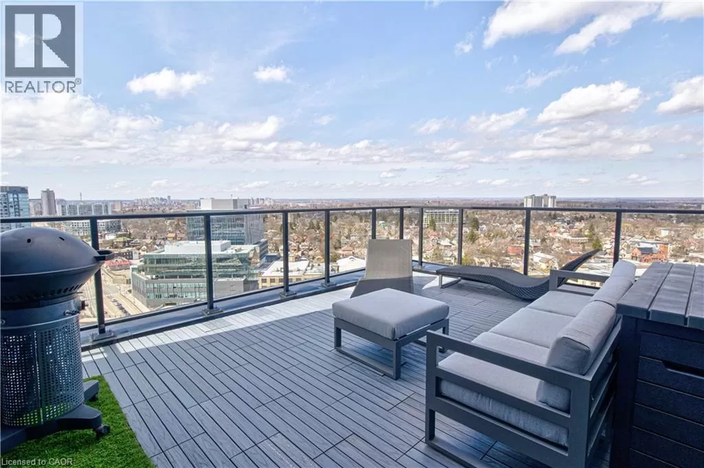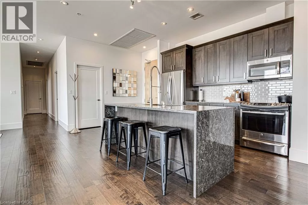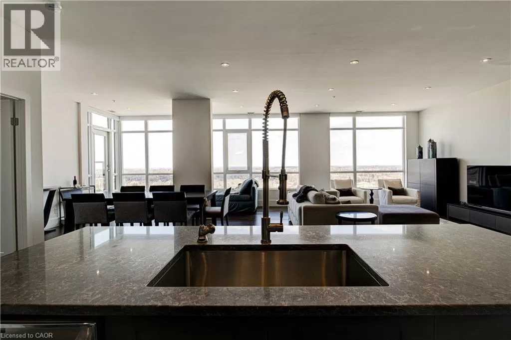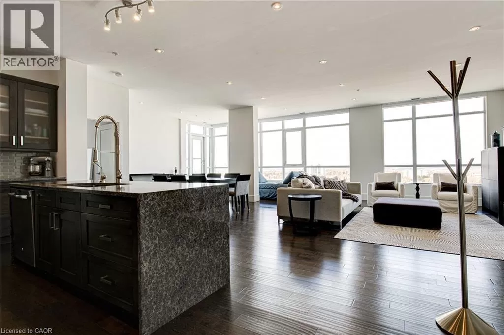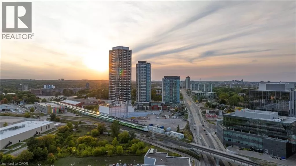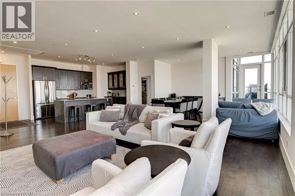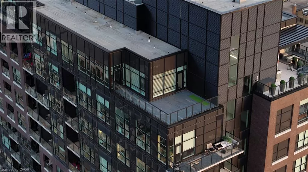 King St W to Victoria Ave S Welcome to the crown jewel of 1 Victoria â a rare, nearly 2,000 sq. ft. penthouse perched atop one of Kitchener's most coveted addresses. Situated in the heart of the Innovation District and steps from Google HQ, the future GO Train station, and the iON LRT, this exclusive residence delivers a vast living space, luxurious finishes and convenience in the centre Kitchenerâs fastest-growing neighborhood. One of only four suites on the top floor, this three-bedroom, two-bathroom home offers unmatched privacy and scale. The corner primary bedroom is flooded with natural light from expansive windows on two sides and features a substantial ensuite along with a walk-in closet outfitted with built-in organizers. The master suite leads directly onto the massive, private terrace from which you can enjoy all day sun, a natural gas BBQ and sweeping views of the city below. The open concept design will allow you to entertain in style in the formal dining room or relax in the massive open-concept living area. The chefâs kitchen is a standout â equipped with designer appliances, a gooseneck faucet, and more storage than most detached homes. The granite counters offer enough surface area to please those who enjoy having a different countertop appliance for different tasks. This residence features engineered hardwood flooring throughout, soaring 10-foot ceilings, and custom window treatments with light-filtering or full privacy options in the bedrooms. Two parking spots â one with EV charging â and two private lockers complete the package. Residents enjoy access to exceptional amenities including a rooftop terrace with community gardens, a professional-grade fitness centre, theatre room, and party spaces. Luxury. Location. Exclusivity. This is penthouse living redefined. (id:27476)