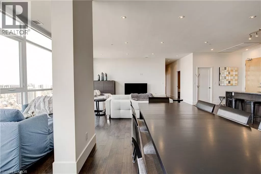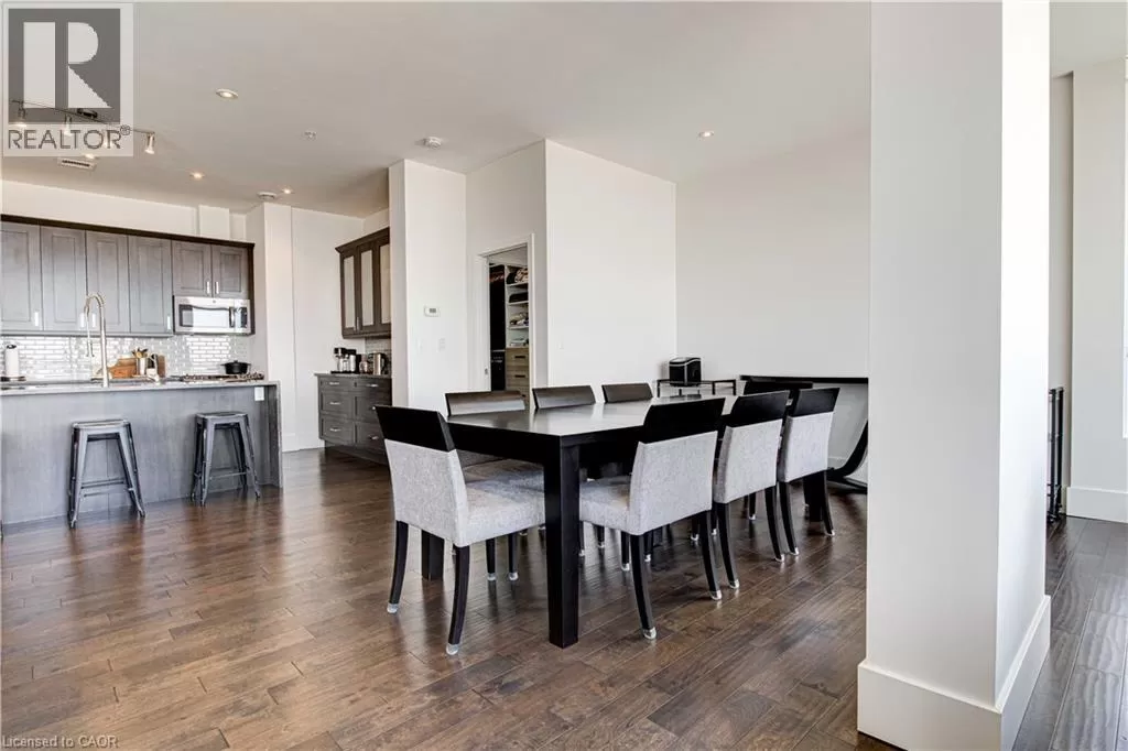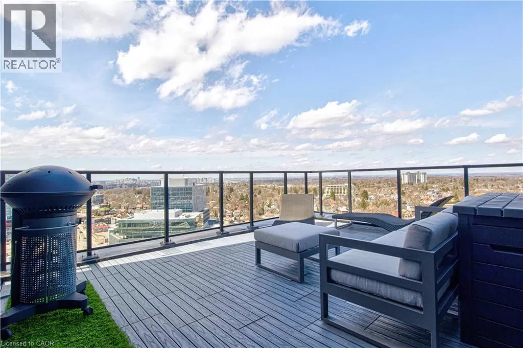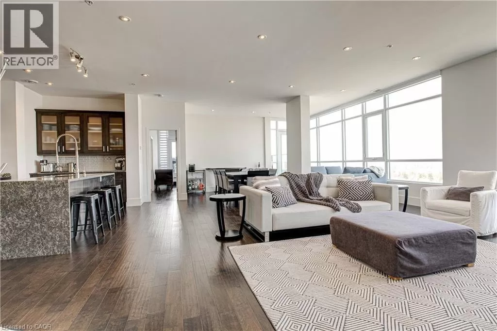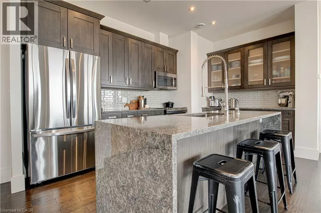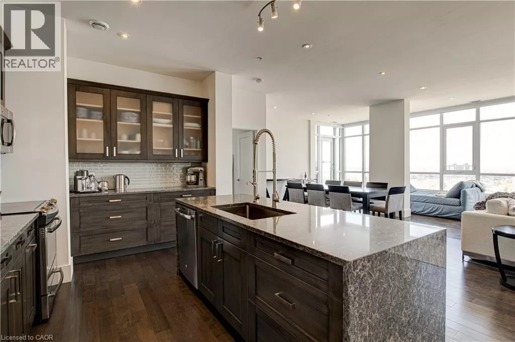 King St W to Victoria Ave S Welcome to the crown jewel of 1 Victoria â a rare, nearly 2,000 sq. ft. penthouse perched atop one of Kitchener's most coveted addresses. Situated in the heart of the Innovation District and steps from Google HQ, the future GO Train station, and the iON LRT, this exclusive residence delivers a vast living space, luxurious finishes and convenience in the centre Kitchenerâs fastest-growing neighborhood. One of only four suites on the top floor, this three-bedroom, two-bathroom home offers unmatched privacy and scale. The corner primary bedroom is flooded with natural light from expansive windows on two sides and features a substantial ensuite along with a walk-in closet outfitted with built-in organizers. The master suite leads directly onto the massive, private terrace from which you can enjoy all day sun, a natural gas BBQ and sweeping views of the city below. The open concept design will allow you to entertain in style in the formal dining room or relax in the massive open-concept living area. The chefâs kitchen is a standout â equipped with designer appliances, a gooseneck faucet, and more storage than most detached homes. The granite counters offer enough surface area to please those who enjoy having a different countertop appliance for different tasks. This residence features engineered hardwood flooring throughout, soaring 10-foot ceilings, and custom window treatments with light-filtering or full privacy options in the bedrooms. Two parking spots â one with EV charging â and two private lockers complete the package. Residents enjoy access to exceptional amenities including a rooftop terrace with community gardens, a professional-grade fitness centre, theatre room, and party spaces. Luxury. Location. Exclusivity. This is penthouse living redefined. (id:27476)