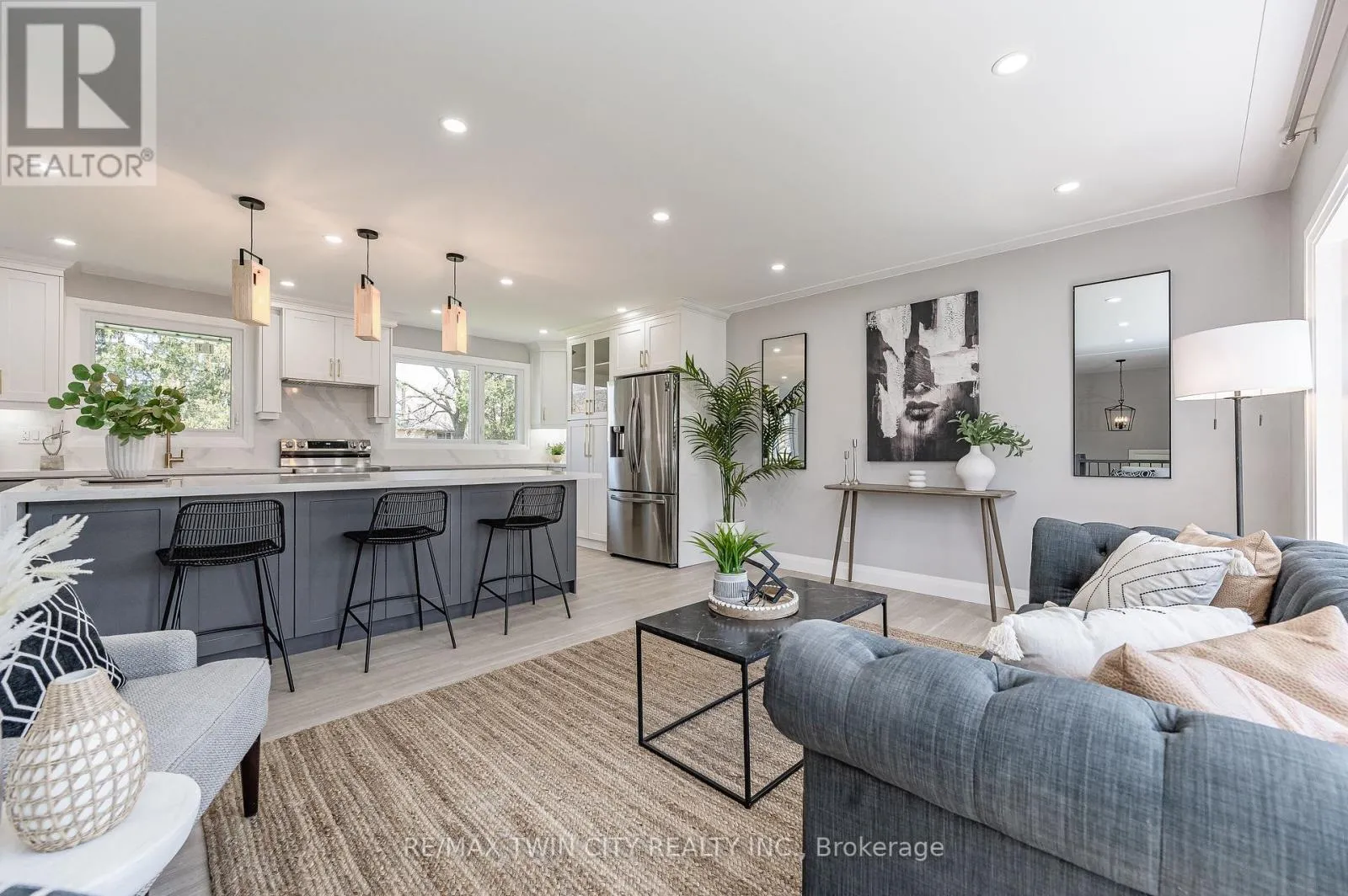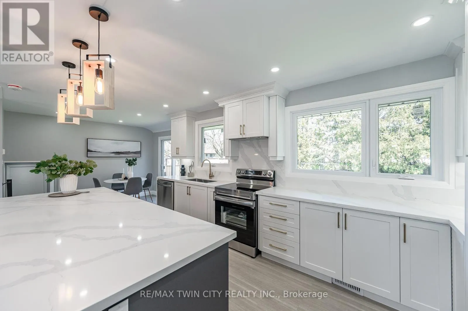 Cross Streets: ASKIN PLACE. ** Directions: FRANKLIN TO BRADLEY OR RIVER RD TO BRADLEY. WELCOME TO 34 BRADLEY! This beautifully renovated side split has been re-imagined and is ready for you to be its next owner. The open concept main floor is an entertainers dreams featuring a huge kitchen with new cabinets, stainless steel appliances, quartz counter tops, and a massive waterfall island. There's also new vinyl flooring throughout and brand new sliding doors leading to your oversized back yard. The bedrooms are all generous in size, and you'll love the new cheater ensuite with glass shower. The lower level has been redesigned to provide a new den/home office, a mud room and full 3pc bathroom with glass shower. As you walk into the basement you'll be greeted with another full bathroom, a large bedroom and a walk-up to the backyard. All windows and doors have been updated, along with new pot lights inside and out, new vinyl sliding, new gutters and a new electrical panel (ALL RENO's and UPDATES COMPLETED In 2022). The home is also located in beautiful Stanley Park, on a mature tree-lined street and close to schools, shopping, HWY 401, HWY 7/8, walking trails, Chicopee Ski Hill, and many other amenities. Call your favourite realtor and book your private showing today. (id:27476)