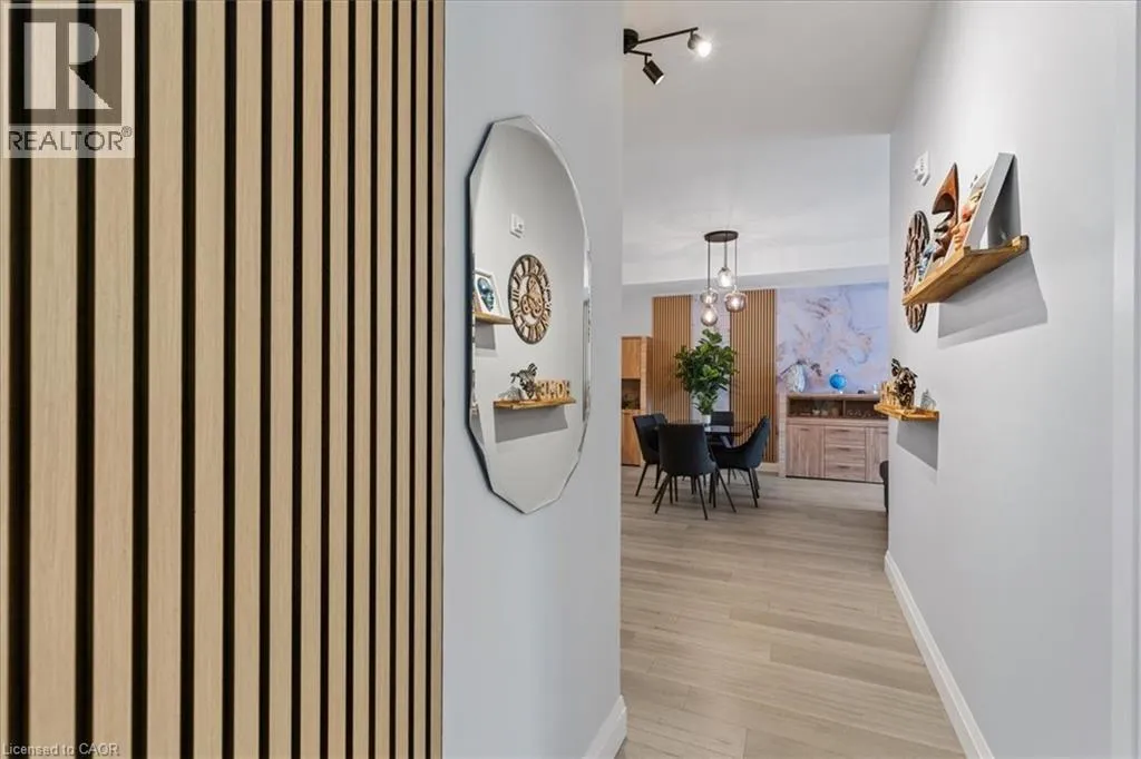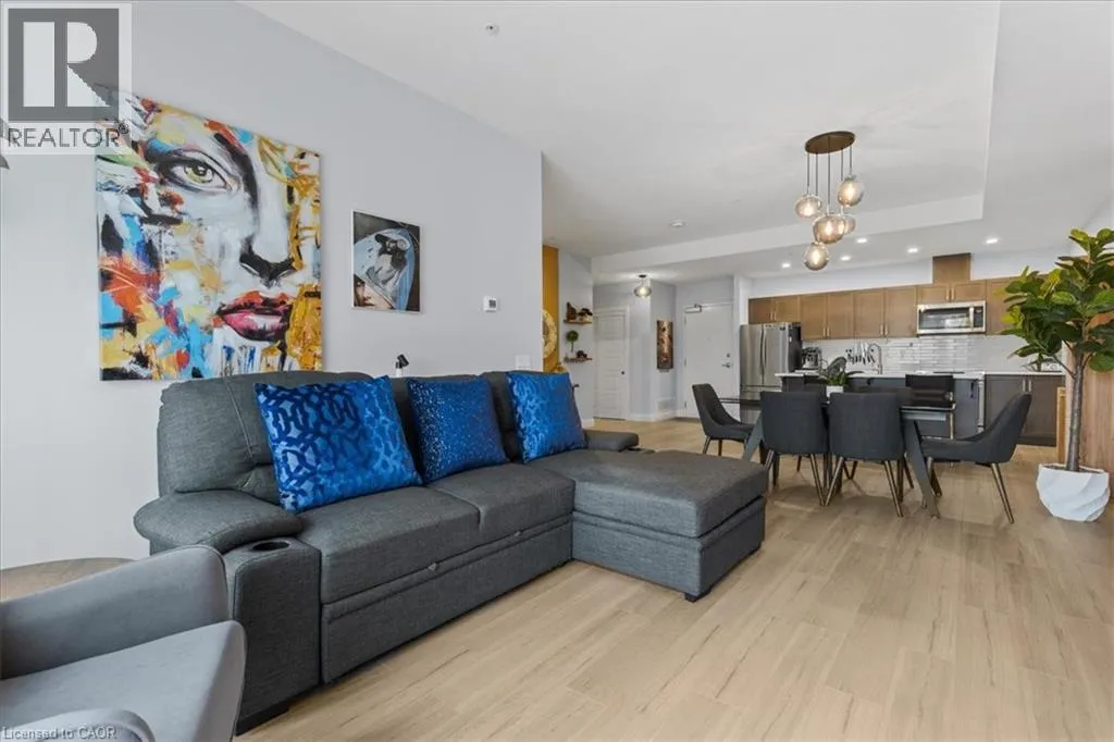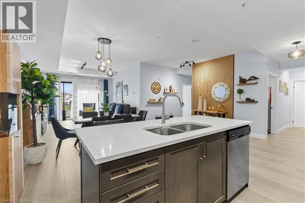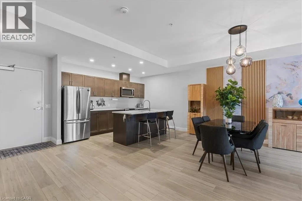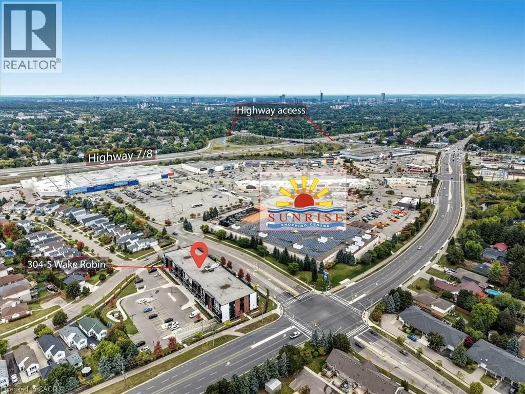 Ottawa St S Modern Comfort Meets Urban Convenience at 5 Wake Robin Drive, Kitchener! Welcome to over 1,200 sq ft of sleek, contemporary living in this 2-bedroom, 2-bath condo ideally located just steps from Sunrise Plaza and minutes to Hwy 7/8. Designed with both style and function in mind, this home boasts soaring 9+ foot ceilings, wide-plank hardwood flooring, designer light fixtures, bold modern accent walls, and oversized windows that flood the space with natural light. The chef-inspired kitchen features granite countertops, a massive island with bar seating, ample cabinetry, and stainless steel appliances â perfect for entertaining or everyday living. The spacious primary bedroom includes a full ensuite bath, while a second full bathroom ensures comfort for guests or roommates. Youâll love the bonus in-suite laundry room with extra storage, plus the added value of 2 parking spots and a locker. Step outside to your ultra-modern oversized balcony, ideal for morning coffee or evening wine. Perfect for young professionals or empty nesters seeking low-maintenance living in a walkable, well-connected urban hub. Experience luxury Kitchener real estate at its finest â this is the one youâve been waiting for! (id:27476)