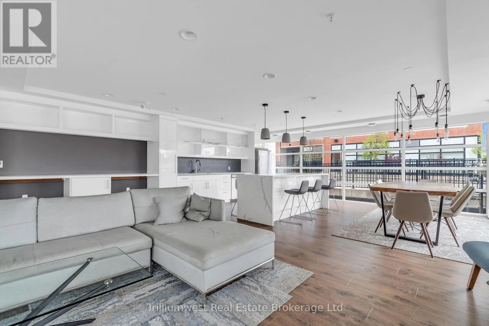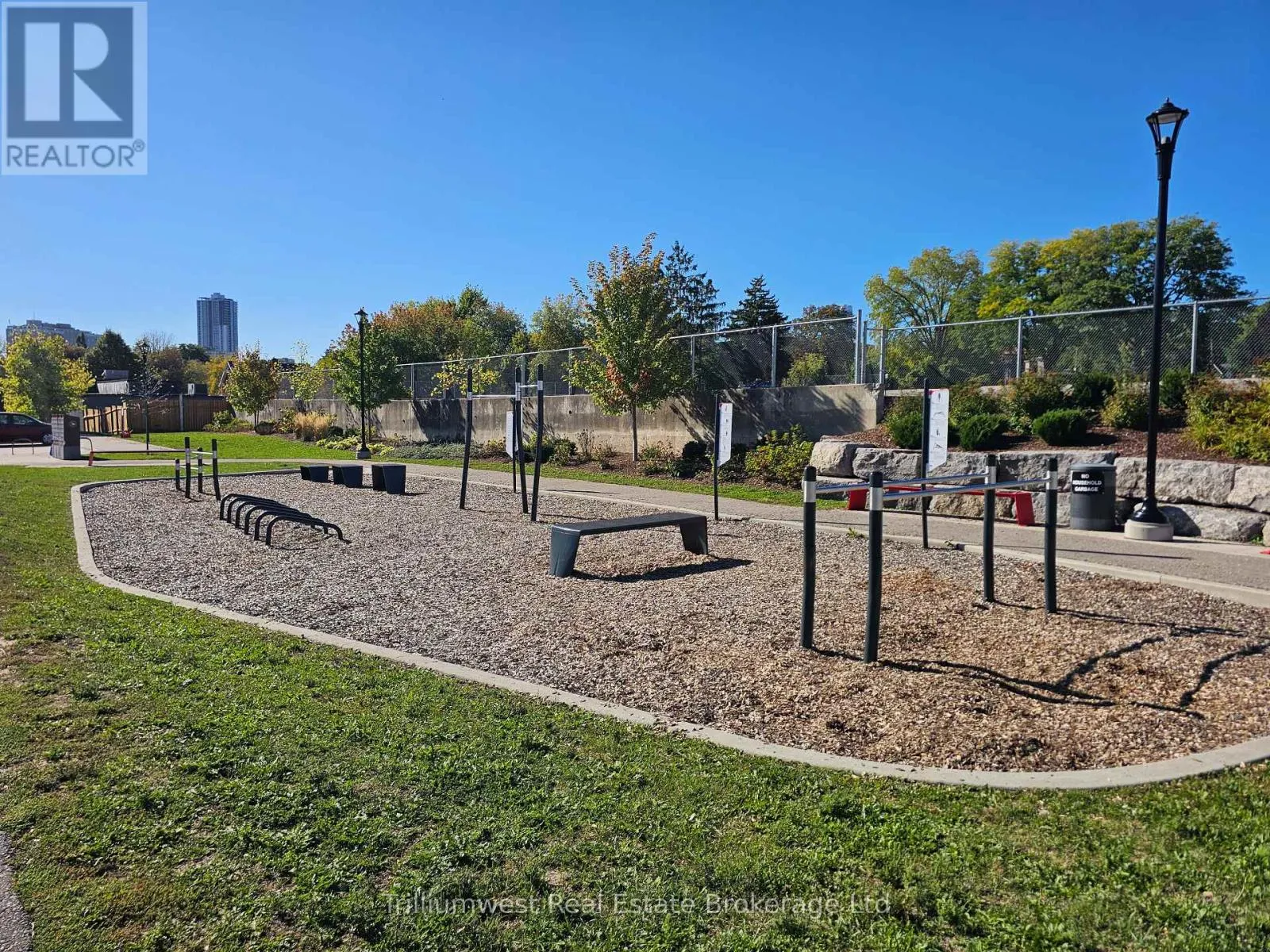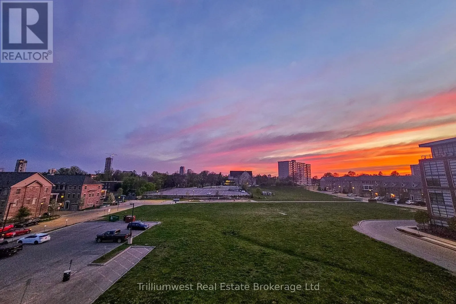 Cross Streets: Louisa St. ** Directions: South on Lancaster Street, turn right onto Louisa Street, Right onto St. Leger. Building is on the left. Welcome to Victoria Common, a unique and luxurious midrise development just minutes from downtown! This bright and cheerful 1 bedroom plus den condo is the perfect blend of modern style, comfort, and convenience. Embrace the the bright and inviting atmosphere of this freshly painted unit, featuring vinyl floors, granite countertops, modern wood design cabinetry, and sleek glass backsplash creating a sophisticated and contemporary feel. The expansive 4th-floor balcony offers breathtaking southwesterly views of Kitchener's downtown skyline and spectacular sunsets. Imagine sipping your morning coffee or enjoying a glass of wine in the evening, surrounded by the energy of the city. Building features include: - State-of-the-art geothermal forced air heating and cooling system - Well equipped main floor gym/exercise room with floor-to-ceiling windows. - Large and luxurious party room perfect for special occasions or community hangouts. - 1 Underground parking space and ample visitor parking for guests. -1 Storage locker included and secure bike storage in the parking garage. The best of downtown Kitchener's amenities and natural beauty, just steps away: - Short walk to parks and trails. - Just a stone's throw to downtown restaurants, shops and cafe's. - Easy access to public transportation and bike trails. And, as a pet-friendly building, you can bring your furry friends along! (id:27476)