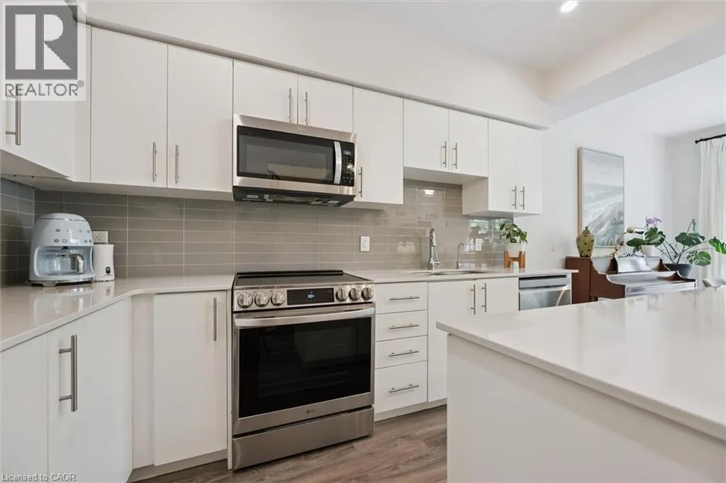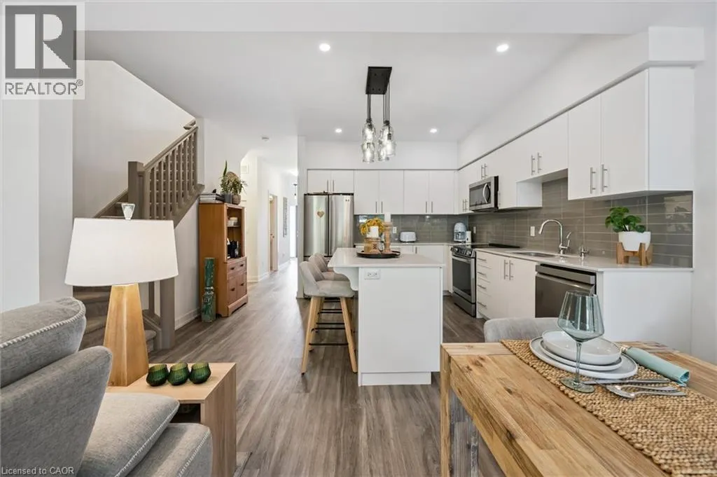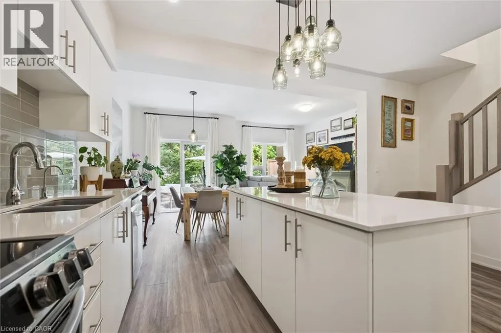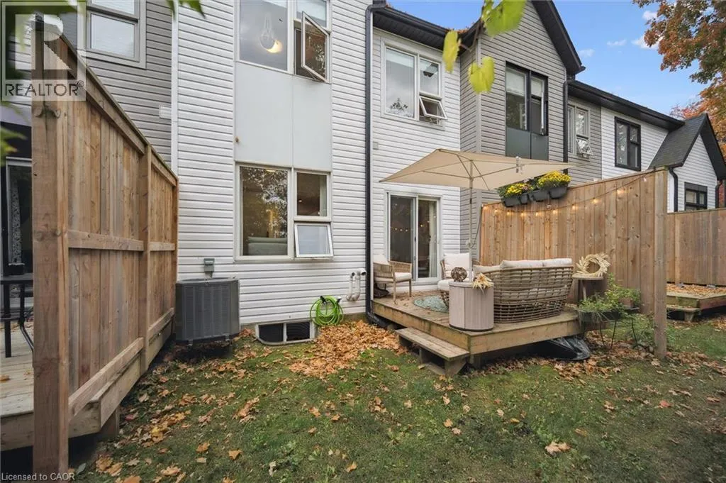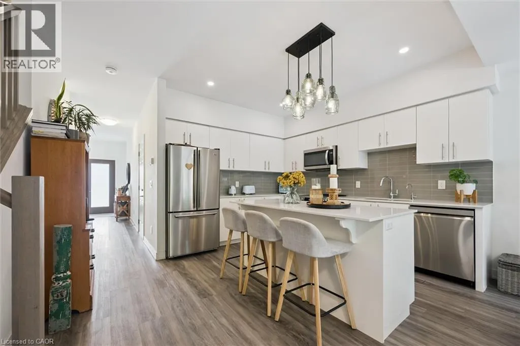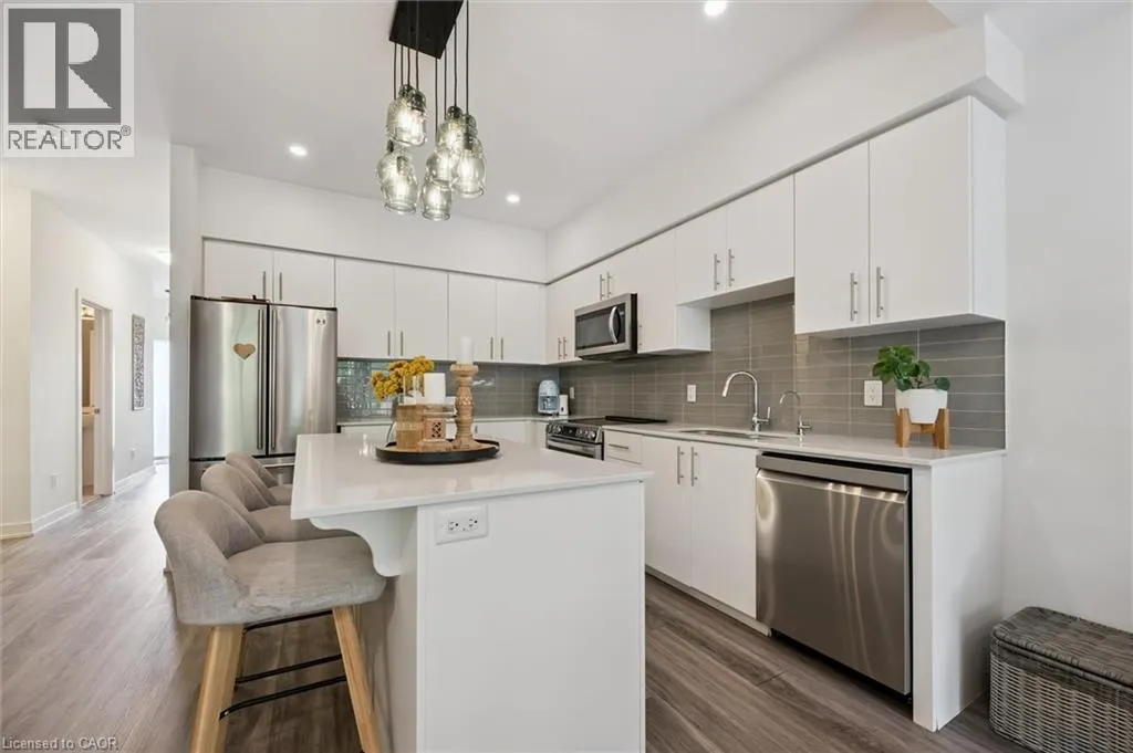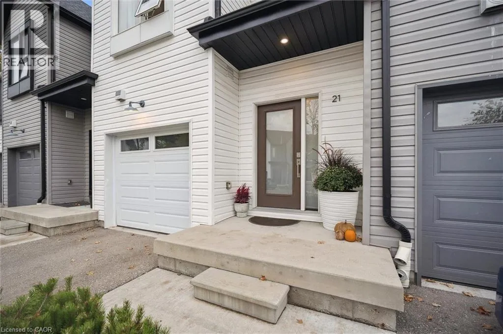 Unit 21 is at the left of the back row of townhouse. Northwest corner Welcome to 110 Fergus Avenue, Unit 21 â a beautifully maintained, owner-occupied townhome in a prime Kitchener location. Built in 2020, this home offers modern finishes, thoughtful upgrades, and a layout perfect for todayâs lifestyle. The open-concept main floor features a bright kitchen with quartz countertops, a large island, and new stainless steel appliances, flowing seamlessly into the dining area with sliding doors to a private backyard with no rear neighbours. You'll also notice the 9-foot ceilings throughout and convenient 2-piece bathroom off of the entrance. Upstairs, youâll find three spacious bedrooms and two full bathrooms. The primary suite boasts a walk-in closet with a window and a private ensuite. Laundry is conveniently located on this level, with a new washer and dryer. The unfinished basement offers high ceilings and endless potential to create additional living space. Additional highlights include an attached single-car garage with a private driveway for a second vehicle, visitor parking nearby, all in a well maintained and friendly condo complex. Featuring builder upgrades such as solid wood stair railings and quartz countertops in both the kitchen and bathrooms. This home is ideally located close to schools, shopping, and amenities â everything you need is just minutes away. Donât miss your chance to make this modern, move-in ready property yours! (id:27476)