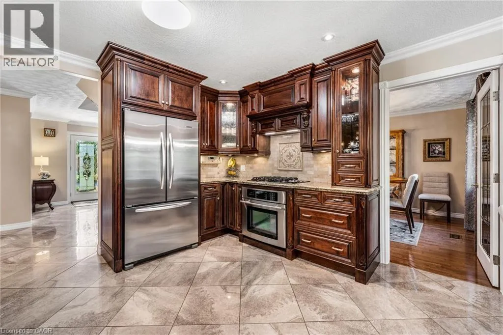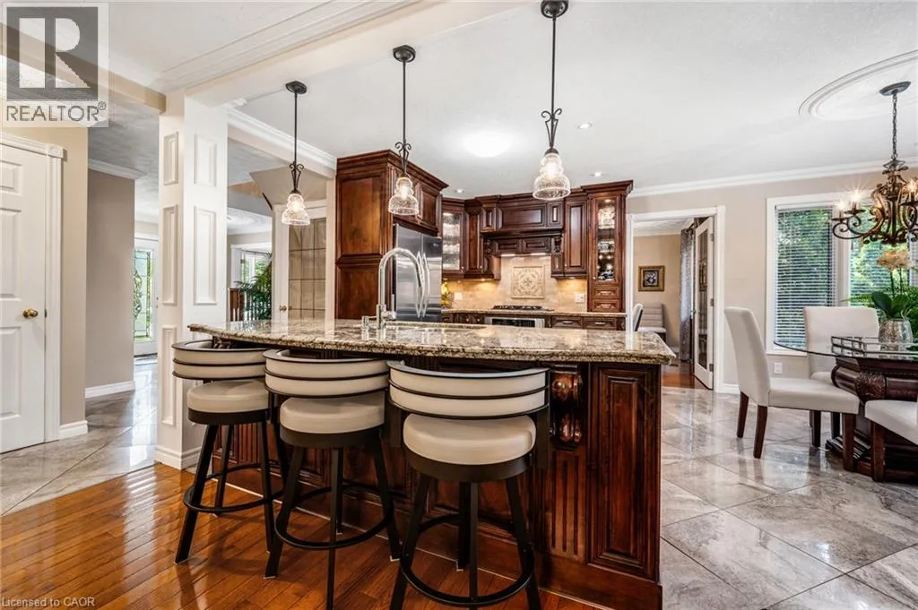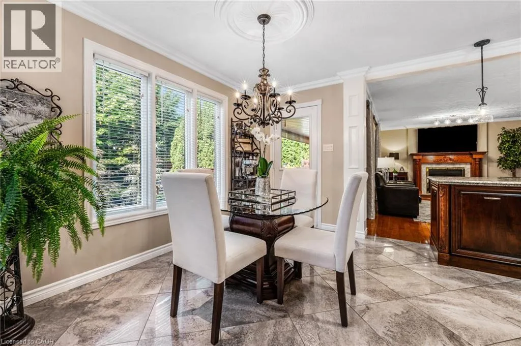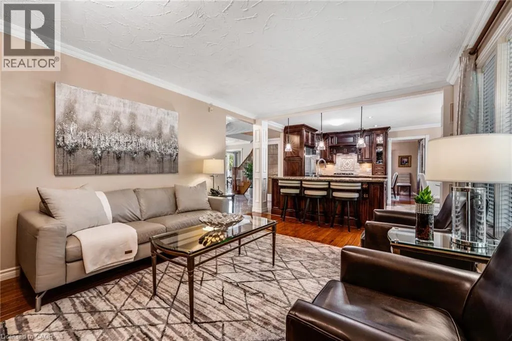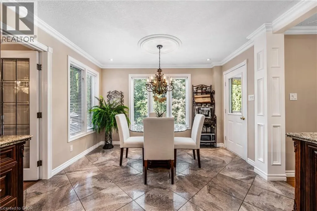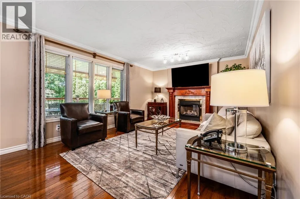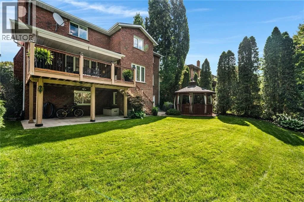 Lackner to Oldfield to Michener Set on a quiet crescent in the sought-after Idlewood neighbourhood, this elegant two-storey brick home offers more than 2,600 sq ft above grade plus a finished walk-out basement for a total of over 3,800 sq ft of living space. A double-door entry opens to a tiled foyer with a curved oak staircase and detailed trim work. Formal living and dining rooms feature hardwood flooring, crown moulding and wainscoting. French doors from the dining room lead to a large deck, ideal for indoor - outdoor entertaining. The kitchen is appointed with rich cabinetry, granite counters, stainless steel appliances and a large island, with a breakfast area that overlooks the backyard. The bright and sunny family room offers a gas fireplace for relaxed gatherings. A powder room and main-floor laundry with cabinetry complete this level. Upstairs, three spacious bedrooms provide comfortable retreats. The primary suite includes a five-piece ensuite bath. A loft-style family room offers space for reading, hobbies or quiet movie nights. The finished basement extends your living options with a recreation room, bar, bonus room and a three-piece bath. The walkout design connects directly to the backyard, making it perfect for entertaining or play. An additional entrance from the garage to the basement adds convenience, while the fully excavated garage offers rare and abundant storage space. Outdoors, mature trees and a generous deck create a private setting. This Idlewood residence blends classic details with modern conveniences, offering space for both everyday living and gracious entertaining in one of Kitchener' s most desirable communities. (id:27476)
