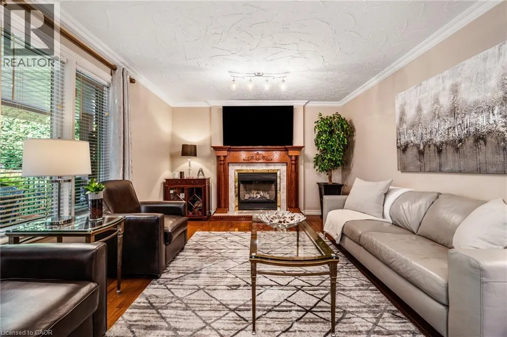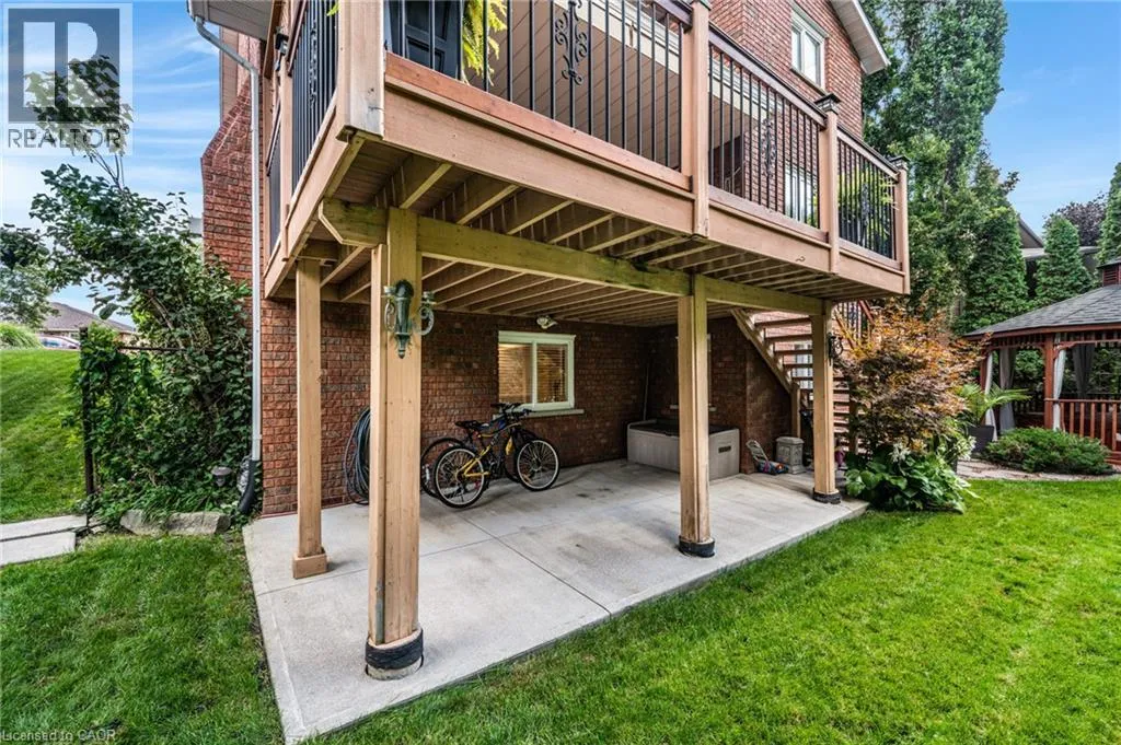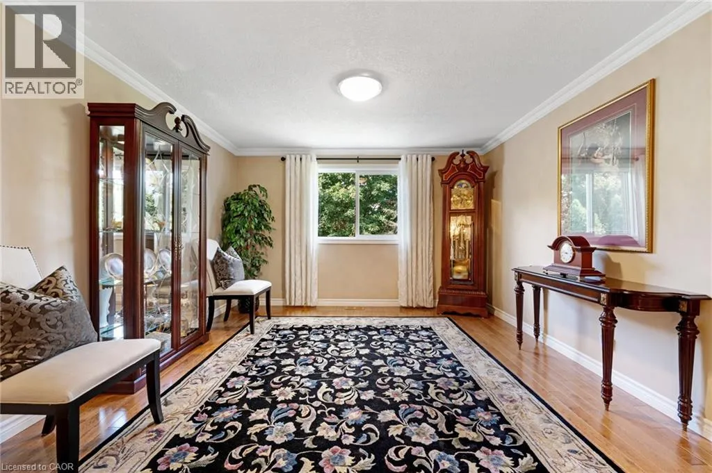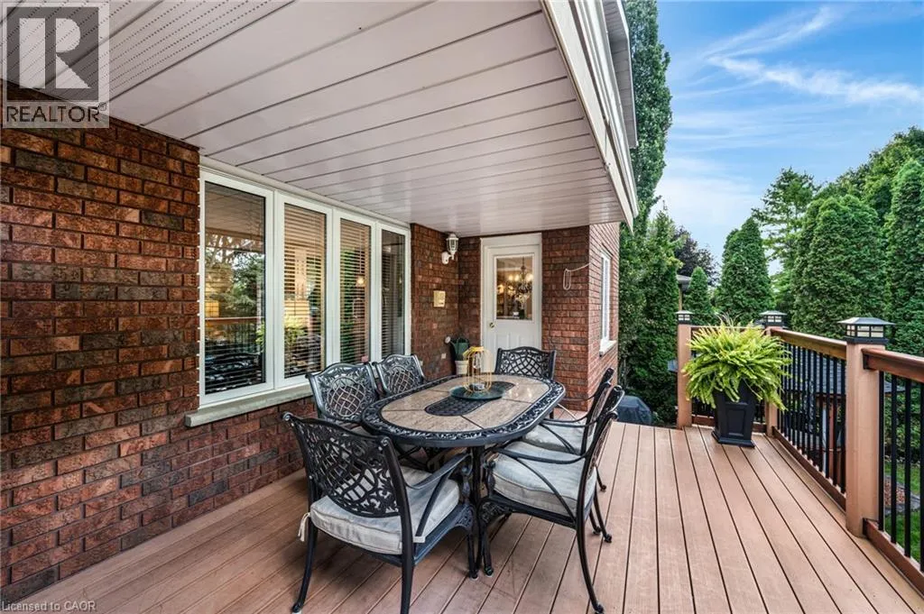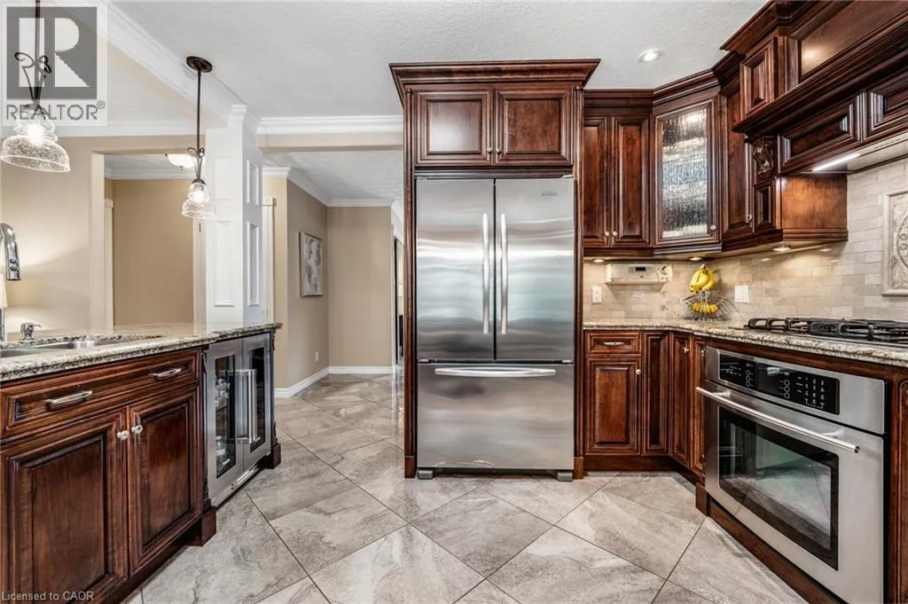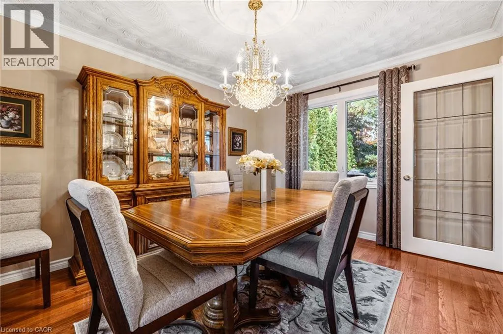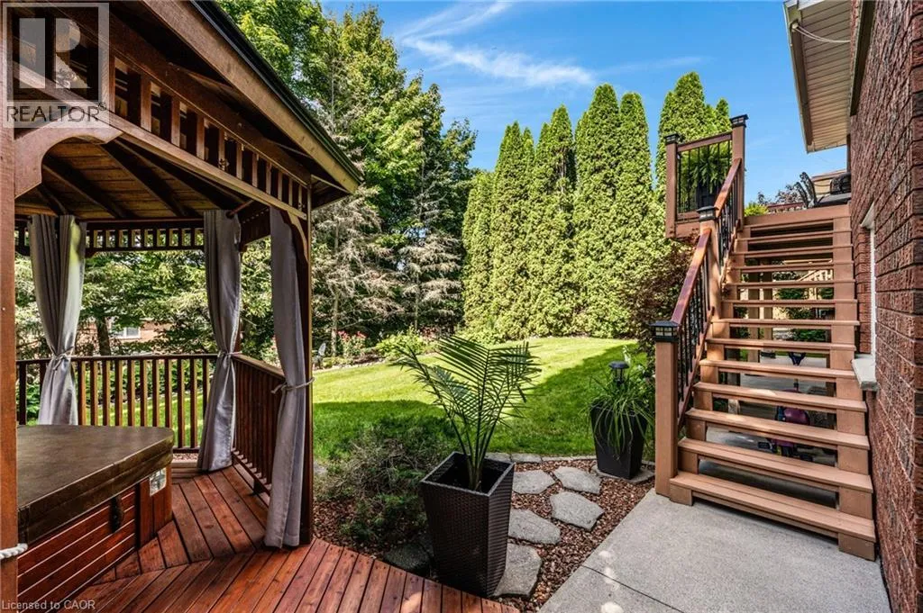 Lackner to Oldfield to Michener Set on a quiet crescent in the sought-after Idlewood neighbourhood, this elegant two-storey brick home offers more than 2,600 sq ft above grade plus a finished walk-out basement for a total of over 3,800 sq ft of living space. A double-door entry opens to a tiled foyer with a curved oak staircase and detailed trim work. Formal living and dining rooms feature hardwood flooring, crown moulding and wainscoting. French doors from the dining room lead to a large deck, ideal for indoor - outdoor entertaining. The kitchen is appointed with rich cabinetry, granite counters, stainless steel appliances and a large island, with a breakfast area that overlooks the backyard. The bright and sunny family room offers a gas fireplace for relaxed gatherings. A powder room and main-floor laundry with cabinetry complete this level. Upstairs, three spacious bedrooms provide comfortable retreats. The primary suite includes a five-piece ensuite bath. A loft-style family room offers space for reading, hobbies or quiet movie nights. The finished basement extends your living options with a recreation room, bar, bonus room and a three-piece bath. The walkout design connects directly to the backyard, making it perfect for entertaining or play. An additional entrance from the garage to the basement adds convenience, while the fully excavated garage offers rare and abundant storage space. Outdoors, mature trees and a generous deck create a private setting. This Idlewood residence blends classic details with modern conveniences, offering space for both everyday living and gracious entertaining in one of Kitchener' s most desirable communities. (id:27476)