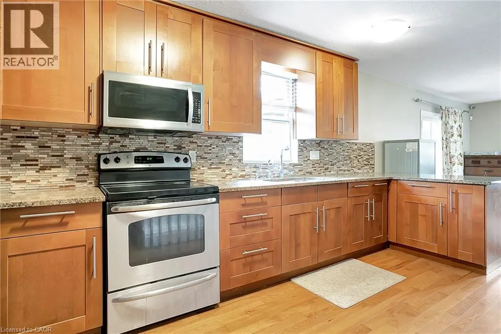 DOON SOUTH / HOMER WATSON Welcome to 1392 Doon Village Road, Kitchener! This stunning 4-bedroom, 3-bathroom bungalow is situated on a rare 1-acre lot on a quiet, dead-end streetâoffering privacy, space, and exceptional family living. Just steps from Doon Public School, the home is surrounded by mature trees and scenic nature trails.Fully renovated in 2011, this home features extensive upgrades including new ceramic and hardwood flooring, roof, plumbing, electrical, furnace, AC, insulation, appliances, and more. The open-concept main floor is ideal for entertaining, with a beautifully updated kitchen boasting granite countertops, stainless steel appliances, and stylish backsplash. The primary bedroom includes a luxurious ensuite with a new jacuzzi tub. Enjoy a spacious concrete covered patio and outdoor kitchen, perfect for summer gatherings. The massive backyard offers endless possibilities: soccer, volleyball, skating rink, firepit, or even golf practice.The fully finished basement includes a large family room, full bar, recreation/gym area, an extra bedroom, and a full 4-piece bathroom. Security features include 2 door sensors, 1 motion sensor, and 6 security cameras. Additional features include an attached 2.5-car garage, parking for up to 10 vehicles, a prime location directly across from Doon Public School, quick access to Highway 401, and proximity to scenic trails along the Grand River and Schneider Creek. A perfect blend of rural tranquility and city convenienceâschedule your private showing today! (id:27476)