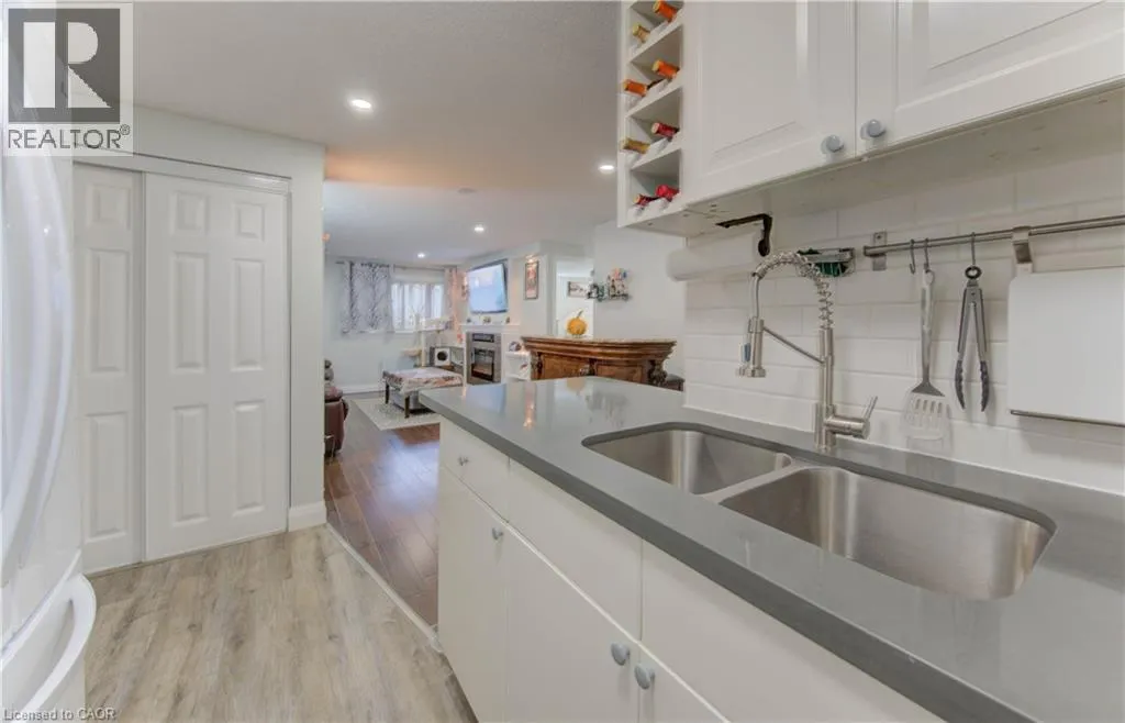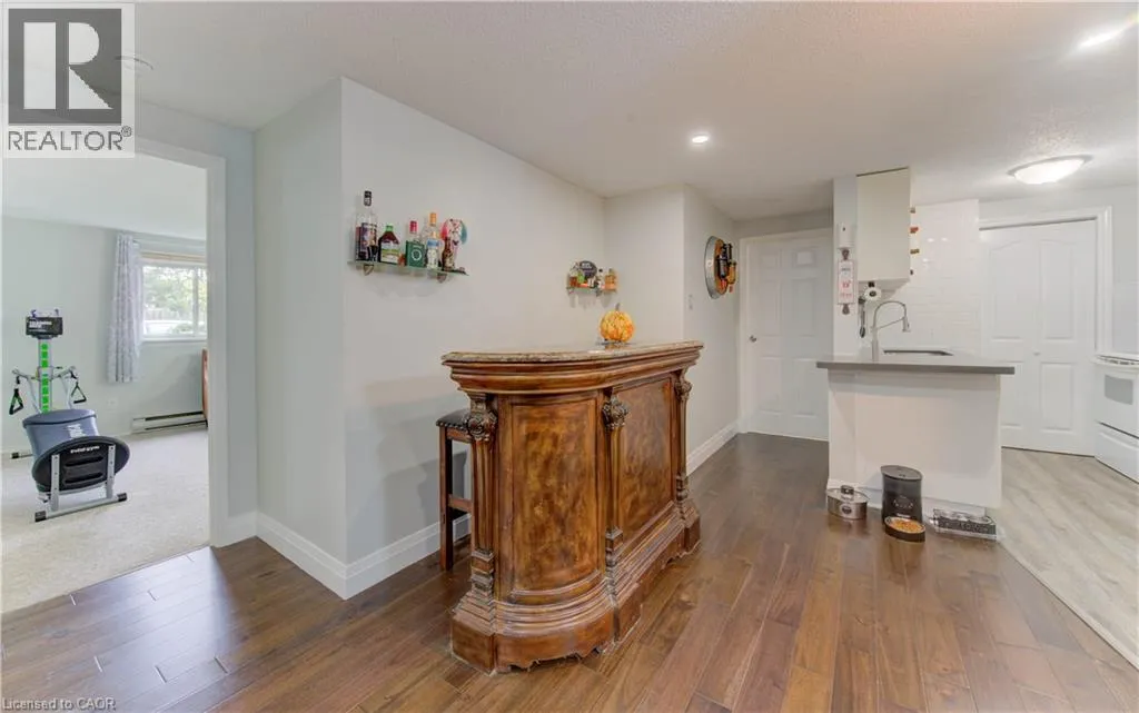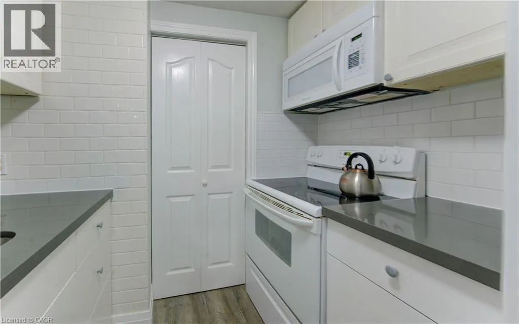Bridge street West Welcome to this beautifully updated 810 sq. ft. 2-bedroom lower-level home, offering a bright and airy living space that blends comfort and modern style. Every detail has been meticulously refreshed â from the pristine ceramic tile flooring to the new contemporary pot lights that create a warm, inviting atmosphere. The living area features a built-in electric fireplace, adding a touch of elegance and coziness. The kitchen shines with brand-new quartz-style countertops, a subway tile backsplash, and new appliances including a fridge and microwave (2025). Youâll also enjoy the convenience of in-suite laundry and one dedicated parking space. Perfectly located with quick access to the Conestogo Expressway and public transit nearby, this home is ideal for empty nesters, first-time or second-time buyers, and savvy investors alike. Enjoy being close to schools, shopping, restaurants, and the scenic Grand River Trail system â everything you need is right at your doorstep! ? Move-in ready, modern, and full of charm â this one checks all the boxes! (id:27476)