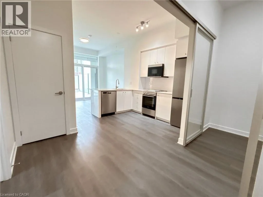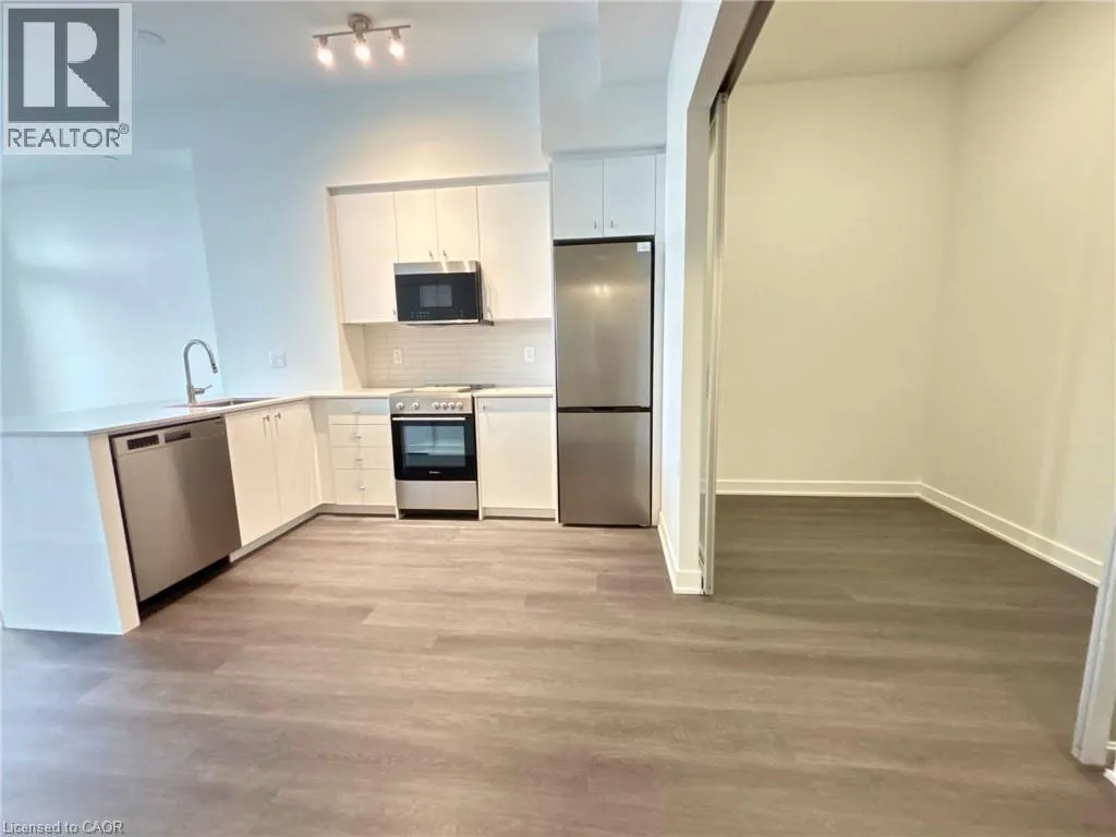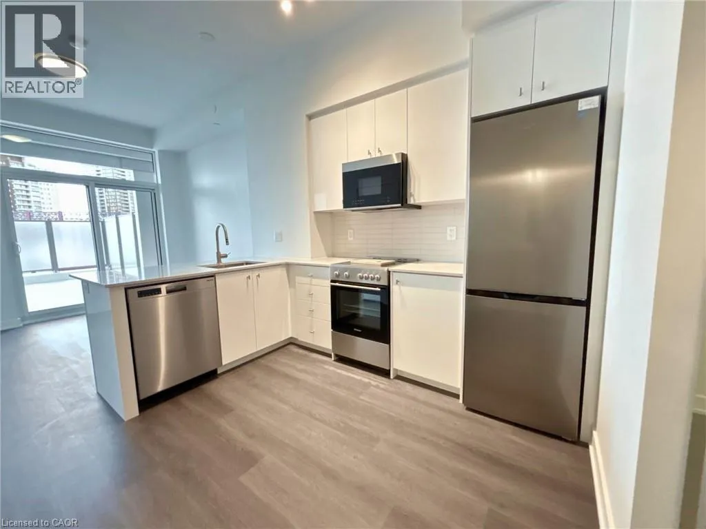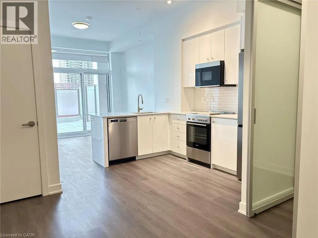 King St W to Wellington St S First Monthâs Rent Free! This rare podium 1-bedroom plus den suite offers a larger layout and an expansive private terrace. The den has sliding glass doors, perfect for a home office or flexible space. The kitchen includes stainless steel appliances and plenty of counter space with a breakfast bar, while the bedroom features a walk-in closet. Bright, open, and well laid out, itâs an easy place to feel at home. Rent includes internet, A/C, and heat; tenants pay hydro and water. Residents can enjoy on-site amenities such as a sauna, outdoor gym, and half running track, as well as full access to all Station Park building amenities, including a fitness and Peloton studio, bowling lanes, indoor lounge and bar, music room, and hydro-pool swim spa. (id:27476)