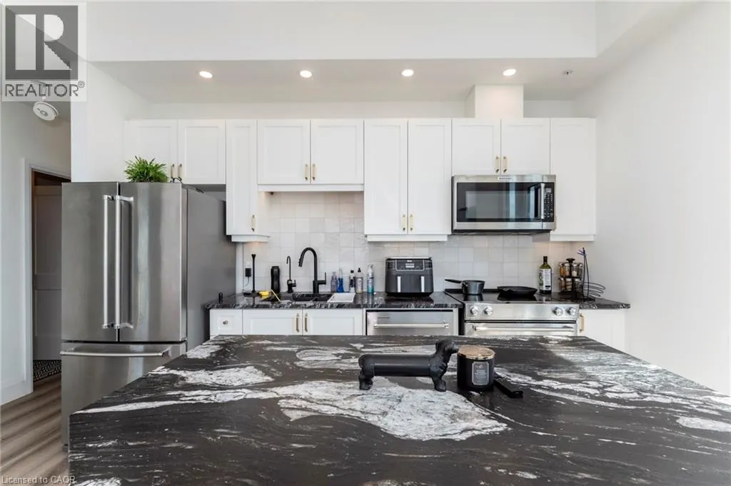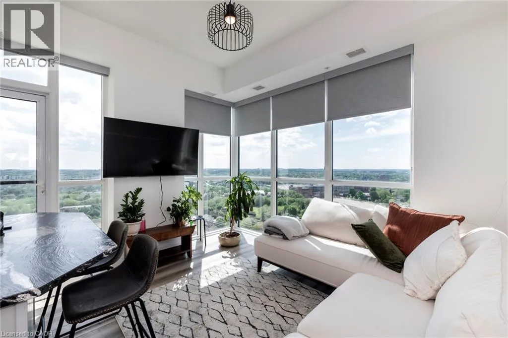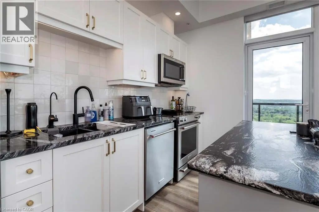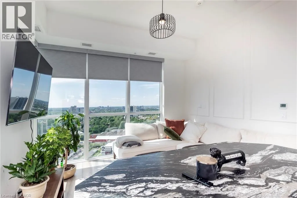Victoria to Bramm St AVAILABLE NOVEMBER 1ST! CAN BE LEASED FURNISHED! Welcome to #2708-108 Garment, an exquisite corner penthouse suite offering unbeatable sunset views and unparalleled luxury. This 2-bedroom, 2-bathroom residence, complete with parking and locker, features unique custom upgrades that are sure to leave a lasting impression. With 10-foot ceilings throughout, the welcoming entryway leads you to floor-to-ceiling windows that showcase stunning 180-degree views of Kitchener-Waterloo. Boasting over $35,000 in upgrades, this space is designed to impress. The custom kitchen includes high-end KitchenAid appliances, including a French door fridge with a water line, and numerous bespoke upgrades not offered by the builder. You'll appreciate the imported Italian backsplash, premium granite island with four large pot drawers, and elegant gold cabinet handles. Additional upgrades include custom light fixtures, motorized blackout blinds, feature wall paneling, and a built-in desk and mantel for optimal space utilization. The main bedroom is spacious and inviting, bathed in natural light with breathtaking sunset views, and features an upgraded walk-in closet and ensuite bathroom. The second bedroom, perfect as an office, includes floor-to-ceiling windows, allowing you to enjoy the cityscape from all angles while you work from home. Building amenities enhance your lifestyle with a pool, fitness center, party room, and rooftop terrace complete with a basketball court and dog run. Located just steps from the LRT, Google/Technology hub, and downtown Kitchener, convenience and luxury combine seamlessly. Book your showing today and envision yourself living in this one-of-a-kind penthouse unit! (id:27476)
