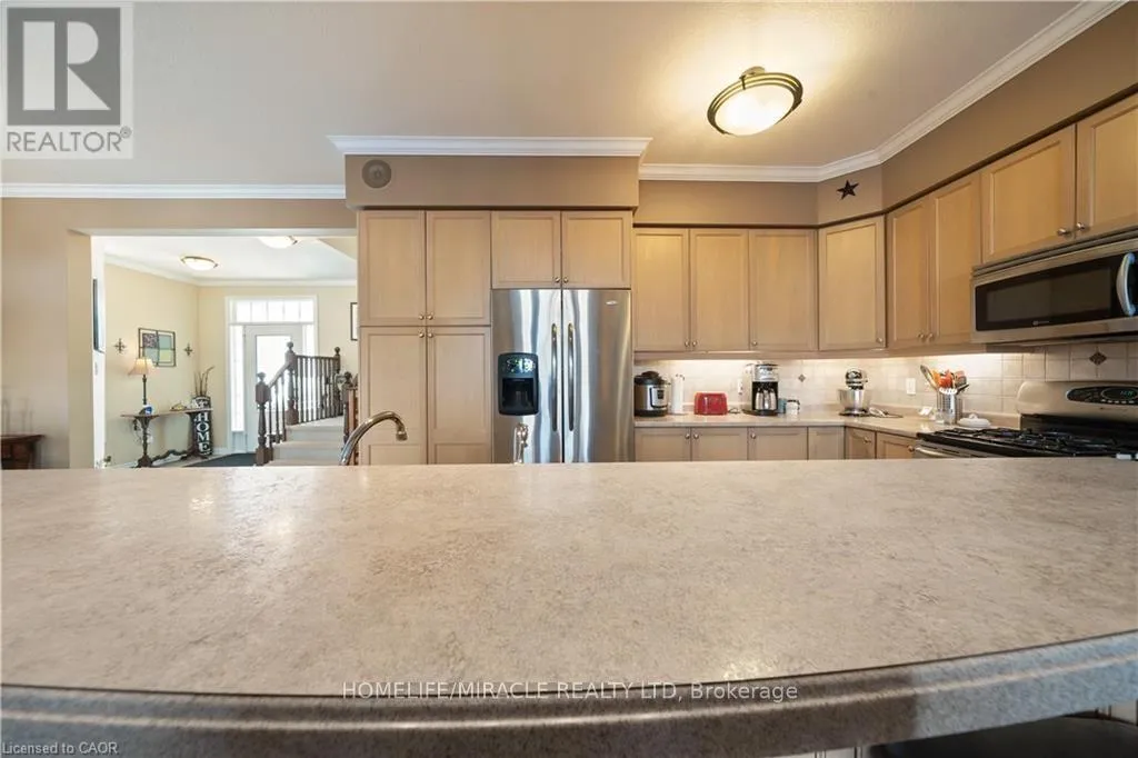 Robert Ferrie Dr to Doon South Dr Welcome to 281 Doon South Drive located in Kitchener close to the 401, shopping, schools, walking trails and parks. If great curb appeal and a fantastic location weren't enough, this 4 bedroom, 32.5 bathroom freehold end unit with double car garage was designed with family in mind, offering open concept living and so much room for a family to grow. From the spacious foyer throughout the main floor, there's no doubt this home was made to entertain. The double doors lead you from the dining room to the two level deck overlooking the beautifully landscaped fully fenced backyard, and the kitchen provides all the storage you need with an expansive island as the focal point. Unwind, book in hand in your formal living room next to your gas fireplace in the evenings. Main floor laundry and a half bath complete the main level. Heading upstairs you're welcomed into the spacious primary bedroom has two large closets and 5 piece ensuite! An additional three bedrooms and full bathroom complete this level. Main floor and second floor are for lease with 4 parking spots 2 in garage and 2 in driveway. Basement is separately tenanted with shared utilities. Upper unit will share 70% of the utilities. (id:27476)