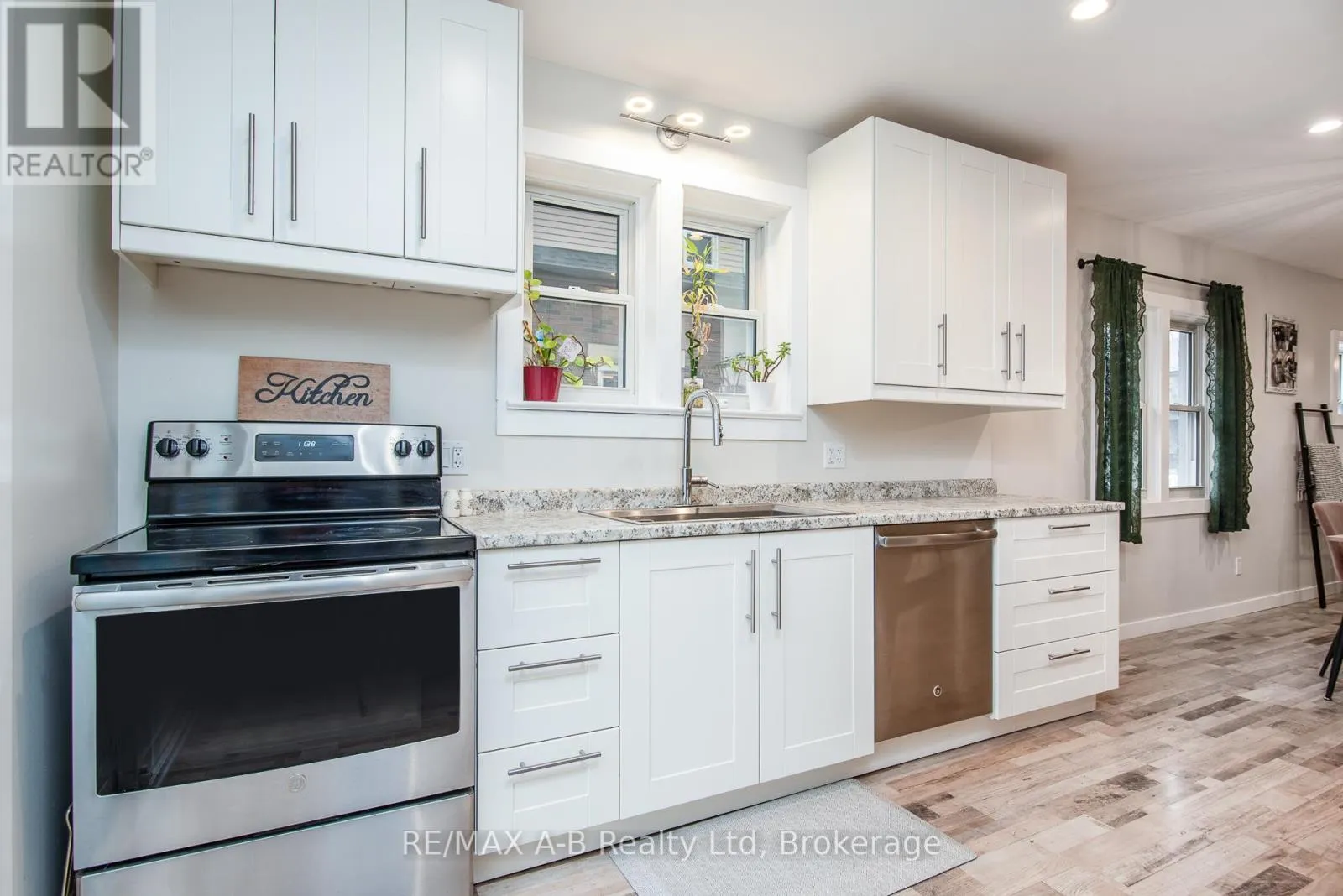 Cross Streets: Courtland Ave E and Queen St S. ** Directions: West on Courtland Ave E, left onto Queen St S. Left onto Mill Street, property is on the right. Adorable! It's the word which best describes the Fairy Tale exterior of this delightful home. But don't let that fool you. The interior is surprisingly spacious and has been fully updated! From the moment you pass through the charming entranceway with its original rounded-top door, you're greeted by the open-concept principal rooms. Featuring luxury vinyl plank flooring and pot lights, the living room and dining area lead to the renovated kitchen with soft close cabinets and hard surface countertops. The main floor offers 2 good-sized bedrooms and a 4-piece bath. The upper-level primary is a surprise with its vaulted ceiling and decorative wood beams as well as a 3-piece bathroom that boasts a jacuzzi! But it doesn't stop there. The fully finished basement features a large rec room with pot lights and built-in speakers, an office and a 2-piece, newly installed, bathroom. The fenced yard and detached garage complete the picture. Situated in a great neighbourhood and close to St. Mary's Hospital, Schneider Creek and the Iron Horse Trail. Let your own Magical Story start here, at 131 Mill Street. (id:27476)