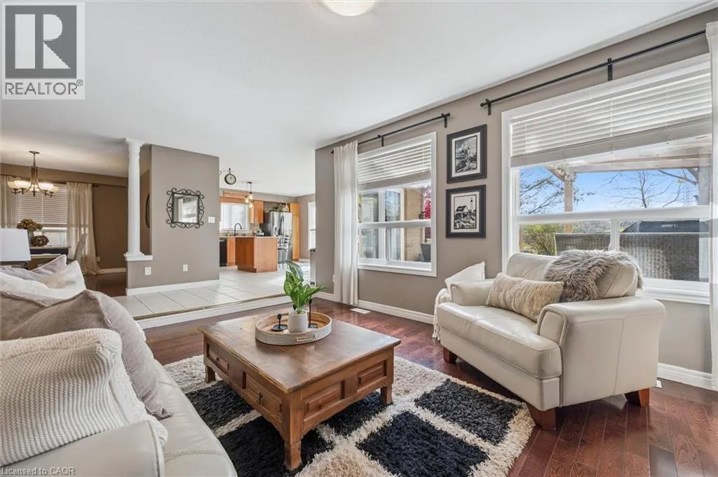Caryndale Dr to Heartwood to Heartbridge St ***Open House Sunday 11-1pm***Welcome to Your Dream Home in Doon! This stunning family home offers over 5,000 sq. ft. of finished living space in one of Kitchenerâs most desirable neighbourhoods. Backing onto serene green space, this 4+1 bedroom, 4-bath home combines luxury, comfort, and functionality. The main level features a spacious layout with a formal dining room, a bright living area, and a cozy family room perfect for relaxing evenings. The eat-in kitchen offers ample cabinetry, a large island, and a walkout to a deck with a built-in pergola, ideal for entertaining or enjoying quiet mornings surrounded by nature. A convenient laundry room with garage access completes this level. Upstairs, youâll find four generously sized bedrooms, including a primary suite with a walk-in closet and a 4-piece ensuite bath. The fully finished basement extends your living space with a rec room featuring a fireplace, a dry bar, an additional bedroom, and a 3-piece bathroomâ perfect for guests or an in-law setup. Located in the sought-after Doon community, this home is close to top-rated schools, scenic trails, shopping, and quick highway access â the perfect balance of tranquility and convenience.Carpet (2018),Roof (2018), windows (2019), basement (2014), water softener (2012) (id:27476)
