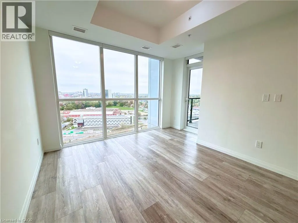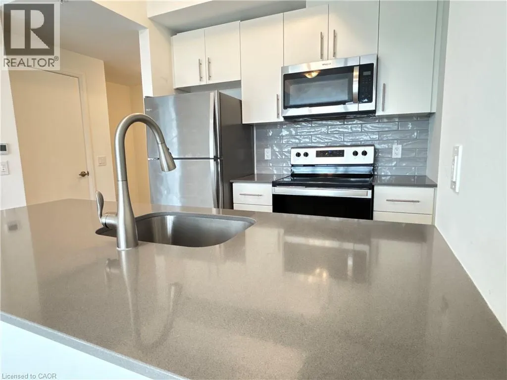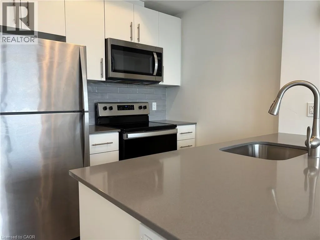 Victoria St S to Garment St This freshly painted, bright one-bedroom condo offers modern city living with floor-to-ceiling west-facing windows that fill the space with natural light and showcase stunning sunset views. The open-concept design connects the living area and kitchen, featuring quartz countertops, stainless steel appliances, and a breakfast island. The spacious bedroom includes a walk-in closet, adding comfort and convenience. Rent includes A/C, heat, and water, plus one underground parking space. Tenant pays hydro. Located in the desirable Garment Street community, residents enjoy premium amenities including an outdoor pool, fitness centre, basketball court, BBQ area, landscaped terraces, and a stylish party room. Just steps to the ION LRT, Victoria Park, Google, and Kitchenerâs best restaurants and cafés. (id:27476)