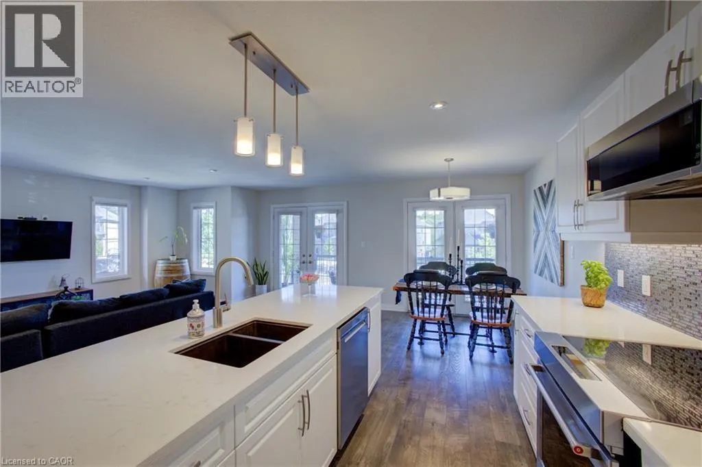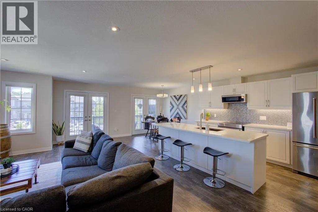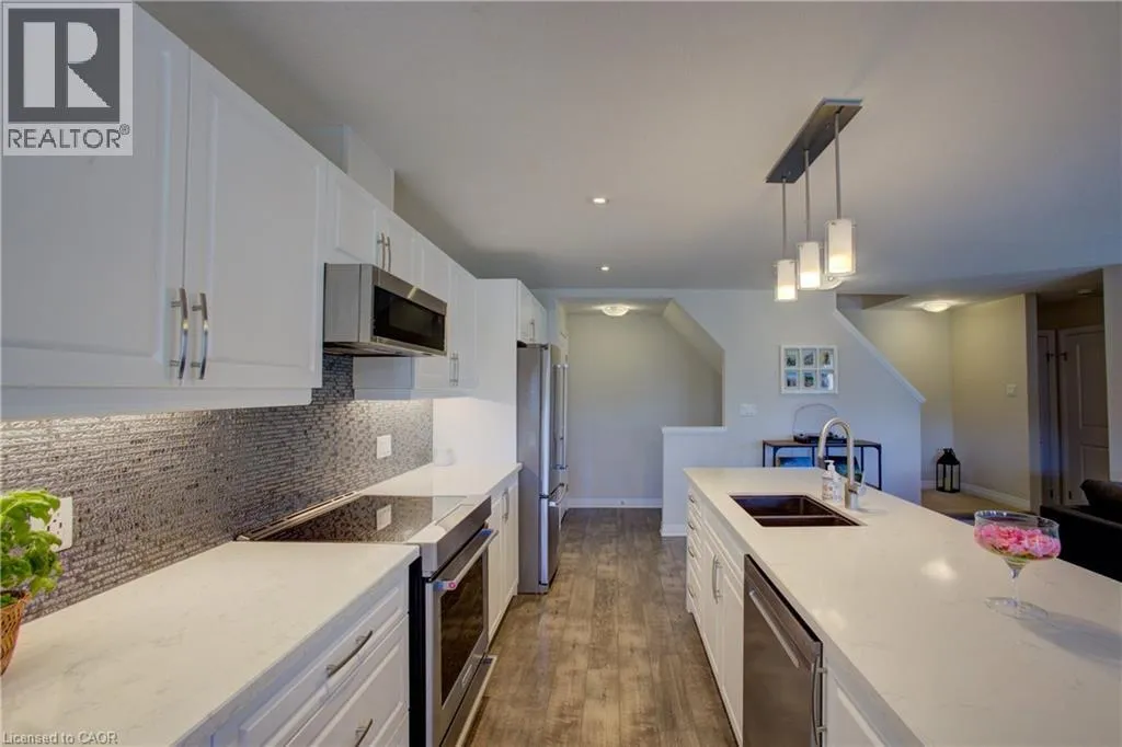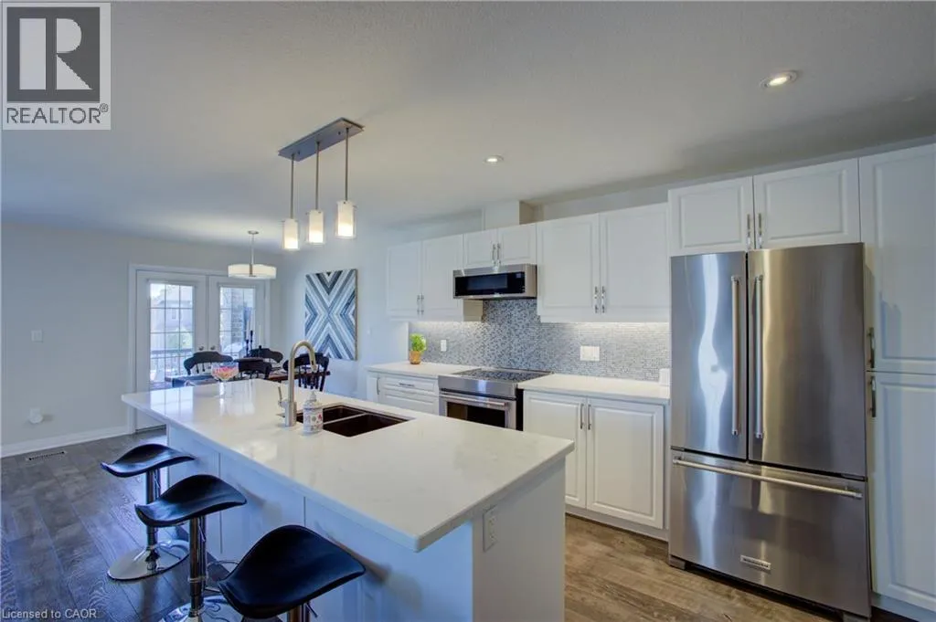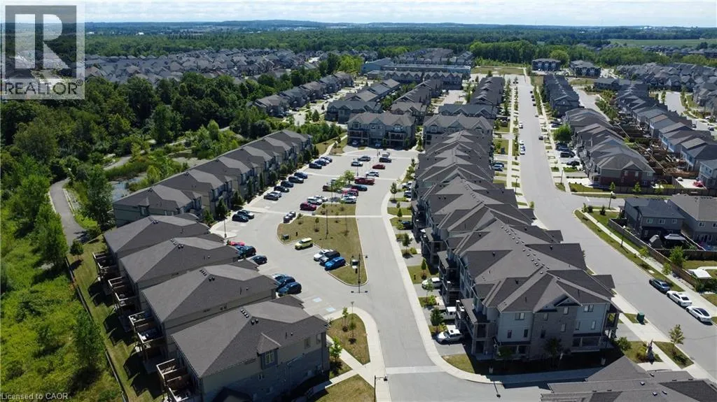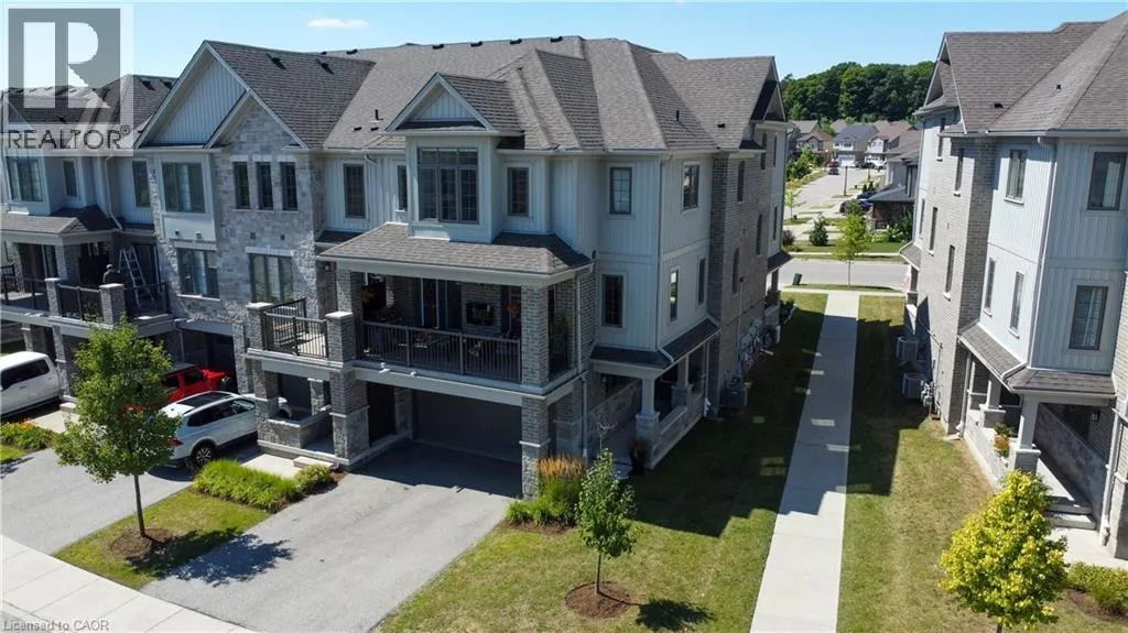 THOMAS SLEE DR TO SOUTH CREEK DR Executive move-in ready end-unit townhome offering the perfect blend of style, space, and convenience. Boasting 3 spacious bedrooms, 3 bathrooms with quartz counters, a rare double driveway, and a 2-car garage, this executive home stands out with quality features. Step inside to discover a bright, open-concept main floor featuring a gourmet kitchen with an oversized quartz island with breakfast bar, tile backsplash, and premium stainless-steel appliances. Custom window coverings add a touch of sophistication throughout. Two separate walkouts lead to a covered balcony, filling the home with natural light and offering ideal spaces for morning coffee or evening relaxation. The welcoming foyer off the covered front porch provides both functionality and curb appeal along with a decorative shiplap wall feature. Upstairs, the layout includes a convenient bedroom level laundry, two well-sized bedrooms, and a luxurious primary suite complete with a walk-in closet and a large ensuite bathroom. Additional features include a garage door opener with remote, newer furnace(2024) with a warranty, washer and dryer(2023) and low condo fees that cover exterior maintenanceâideal for investors, first-time buyers, or down sizers or snowbirds seeking worry-free living. Located minutes from Conestoga College, scenic parks, walking trails, and top-rated schools, this townhome delivers exceptional value in a prime location. Donât miss your chance to own this move in ready gemâexecutive living meets low-maintenance lifestyle! (id:27476)