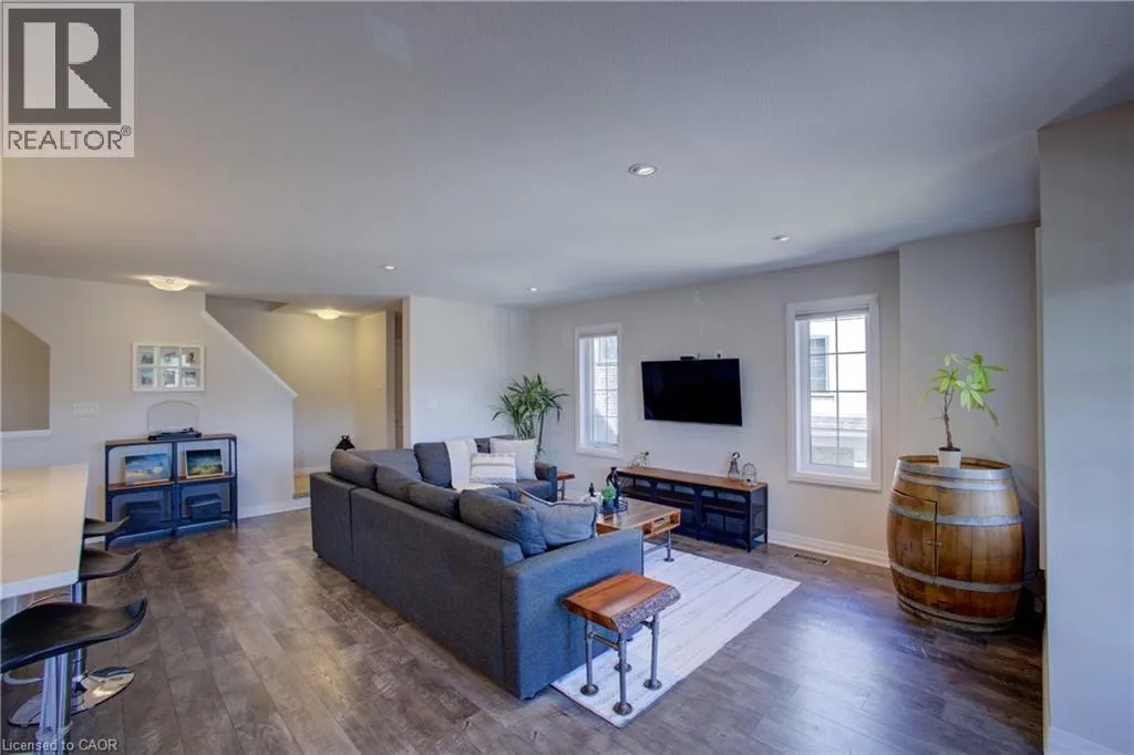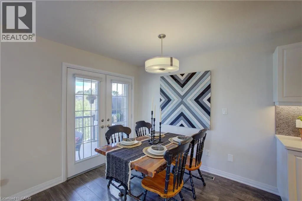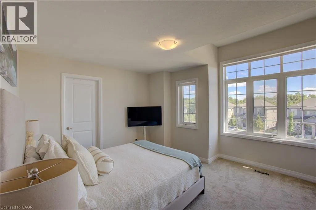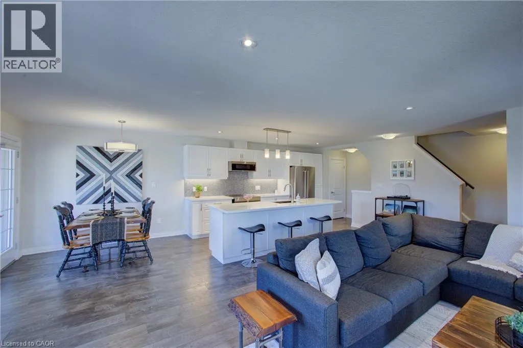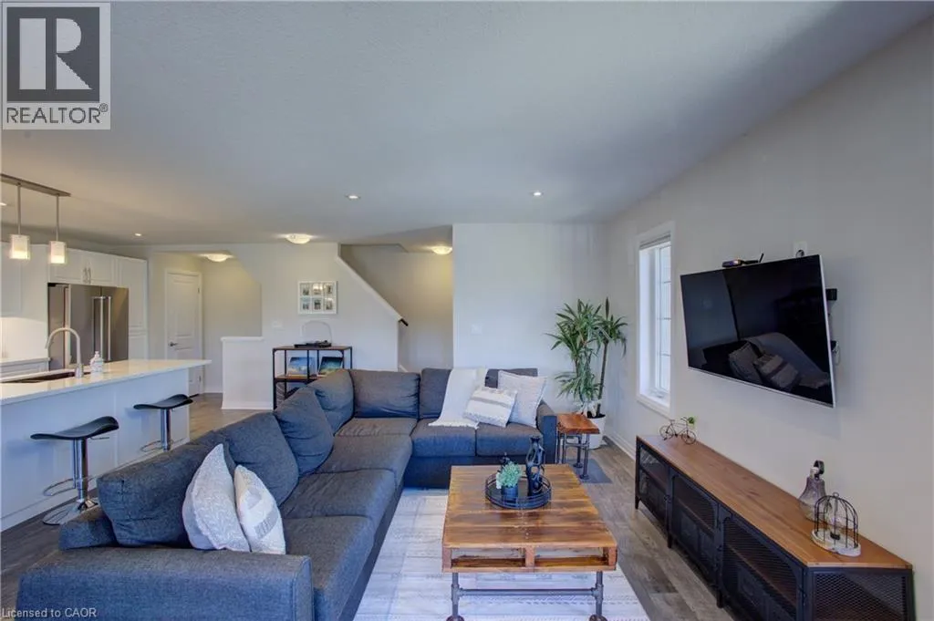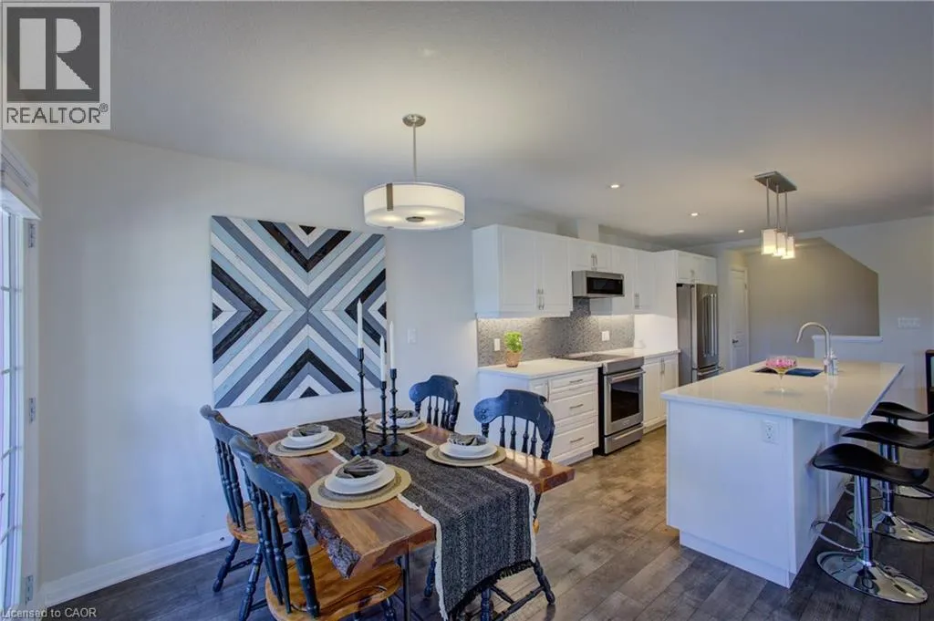 THOMAS SLEE DR TO SOUTH CREEK DR Executive move-in ready end-unit townhome offering the perfect blend of style, space, and convenience. Boasting 3 spacious bedrooms, 3 bathrooms with quartz counters, a rare double driveway, and a 2-car garage, this executive home stands out with quality features. Step inside to discover a bright, open-concept main floor featuring a gourmet kitchen with an oversized quartz island with breakfast bar, tile backsplash, and premium stainless-steel appliances. Custom window coverings add a touch of sophistication throughout. Two separate walkouts lead to a covered balcony, filling the home with natural light and offering ideal spaces for morning coffee or evening relaxation. The welcoming foyer off the covered front porch provides both functionality and curb appeal along with a decorative shiplap wall feature. Upstairs, the layout includes a convenient bedroom level laundry, two well-sized bedrooms, and a luxurious primary suite complete with a walk-in closet and a large ensuite bathroom. Additional features include a garage door opener with remote, newer furnace(2024) with a warranty, washer and dryer(2023) and low condo fees that cover exterior maintenanceâideal for investors, first-time buyers, or down sizers or snowbirds seeking worry-free living. Located minutes from Conestoga College, scenic parks, walking trails, and top-rated schools, this townhome delivers exceptional value in a prime location. Donât miss your chance to own this move in ready gemâexecutive living meets low-maintenance lifestyle! (id:27476)