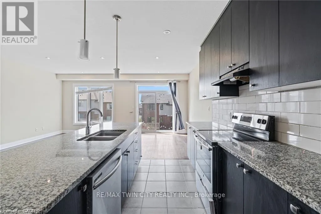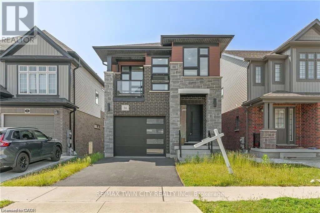 Cross Streets: New Dundee. ** Directions: Thomas Slee Drive and New Dundee Road. 34 Sportsman Hill Street - Contemporary Living in the most desired area of Doon South Beautiful 4-bedroom, 2.5-bath home offering modern design and everyday comfort. The main floor boasts a sun-filled kitchen with large island, stainless-steel appliances, and open flow to a bright living and dining area plus a stylish powder room. Upstairs, the master suite has a walk-in closet and 3-piece ensuite, three additional bedrooms with a 4-piece bath-one with a private glass balcony. with drive way parking space Close to Conestoga College, Hwy 401, schools, shopping, and transit. Motivated sellers-bring your fussiest clients. Lowest-priced detached home in the area. Lockbox for easy showings. (id:27476)