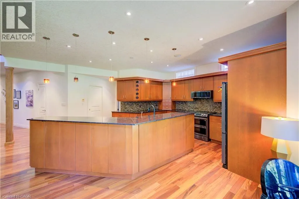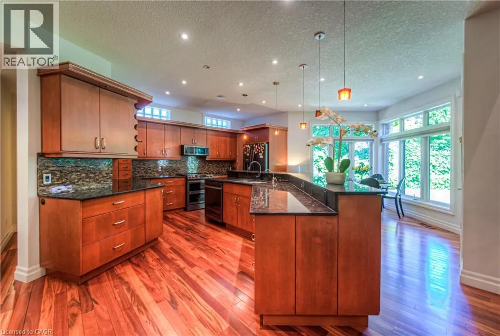 Deer Ridge to Grand Hill to Wagon St. Welcome to 75 Wagon Street â An Executive Masterpiece in Deer Ridge Experience luxury living in one of Kitchenerâs most prestigious communities. Nestled on a quiet, tree-lined street in Deer Ridge Estates, this exceptional executive residence offers over 5,000 sq. ft. of meticulously finished living space designed for comfort, sophistication, and effortless entertaining. From the first impression, this home captivates with its timeless brick-and-stucco façade, striking rooflines, and beautifully landscaped curb appeal. Step inside to discover an open and inviting layout where dramatic ceiling heights, expansive windows, and premium finishes create a sense of grandeur and warmth throughout. At the heart of the home is the showstopping great room, featuring a soaring two-storey wall of windows and a designer gas fireplace â a perfect balance of elegance and relaxation. The chefâs kitchen impresses with a massive island, granite countertops, custom cabinetry, built-in appliances, and a generous walk-in pantry â ideal for hosting or daily family living. The main-floor primary suite offers a private retreat with two walk-in closets, a spa-inspired ensuite, and direct access to your serene backyard escape. Upstairs, spacious bedrooms and a versatile loft provide flexibility for family, guests, or a home office. The fully finished lower level transforms everyday living into entertainment bliss, complete with a custom bar, games and media zones, wine cellar, and fireplace â perfect for memorable gatherings. Outdoors, enjoy your private backyard oasis featuring a covered porch, oversized deck, soothing waterfall, and hot tub â a rare sanctuary just minutes from city life. Located close to Highway 401, scenic Grand River trails, Deer Ridge Golf Club, and top amenities, this residence offers a lifestyle of refined comfort and prestige in one of Waterloo Regionâs most coveted neighborhoods. (id:27476)