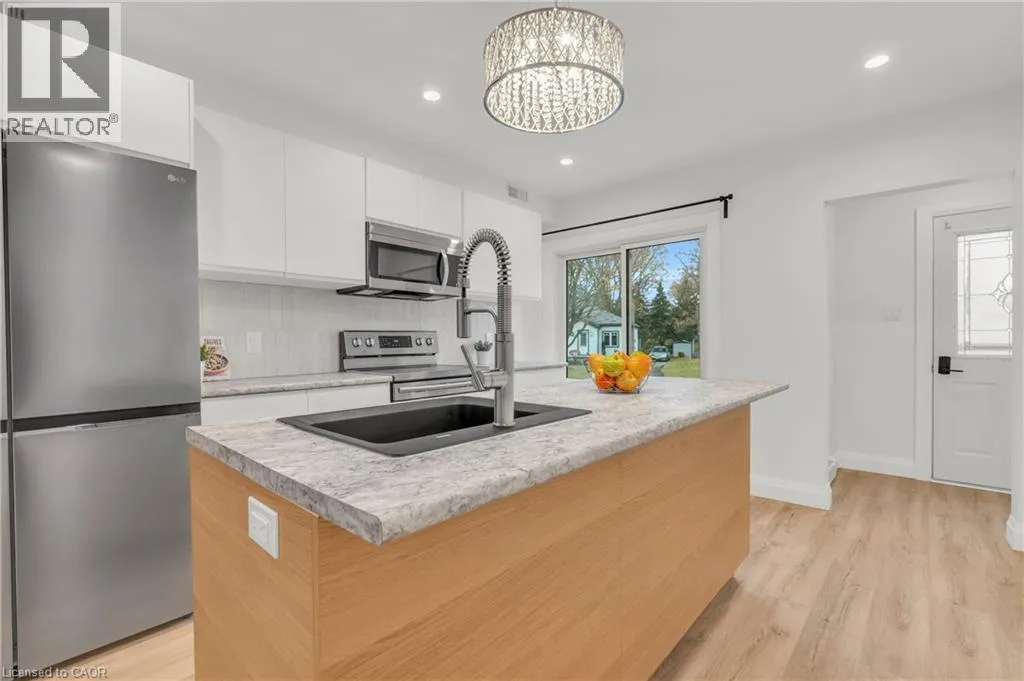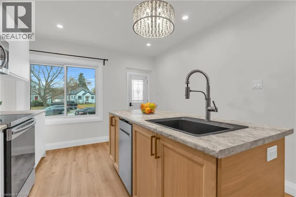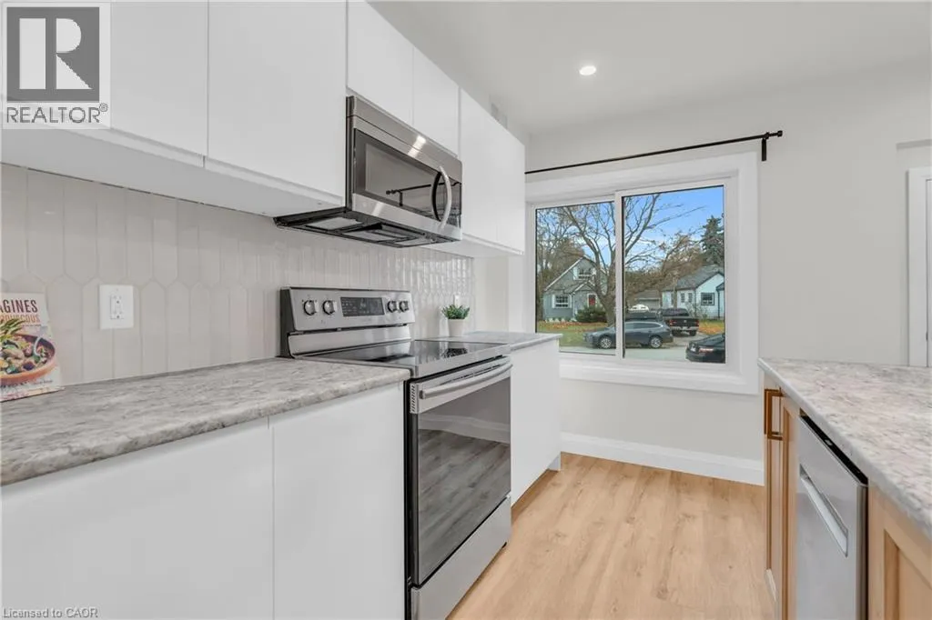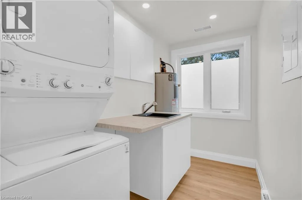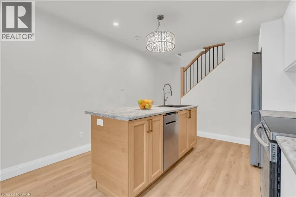 Lancaster St W, turn onto Ash St Welcome to this immaculately renovated 3 bedroom, 1 bath, 2 storey unit, thoughtfully designed with a functional layout and beautiful warm finishes. The bright kitchen features stainless steel appliances, sleek cabinetry, and a large window that fills the home with natural light. The upstairs living space gets great sunset lighting. Enjoy the convenience of an in-suite laundry room and the comfort of spacious bedrooms and one full bathroom with a double vanity and thoughtful updates. The shared backyard provides extra outdoor space to relax or unwind, and the unit includes one dedicated parking space for your convenience. Located minutes from Highway 8, a short walk to Ash Park, and close to downtown Kitchener, you have everything you need close by. Come see for yourself why this unit could be your new home! (id:27476)