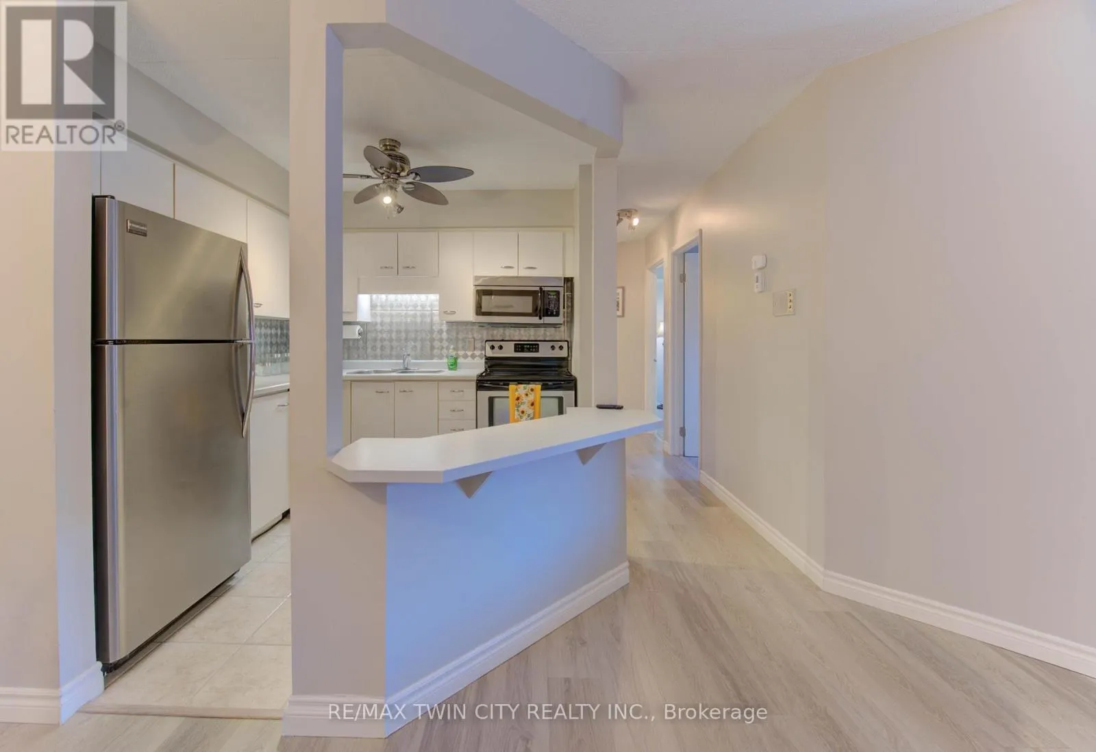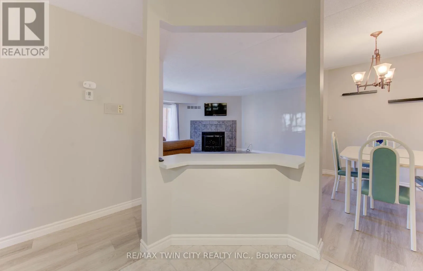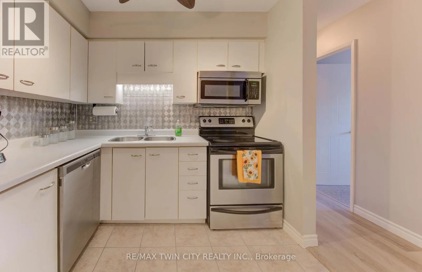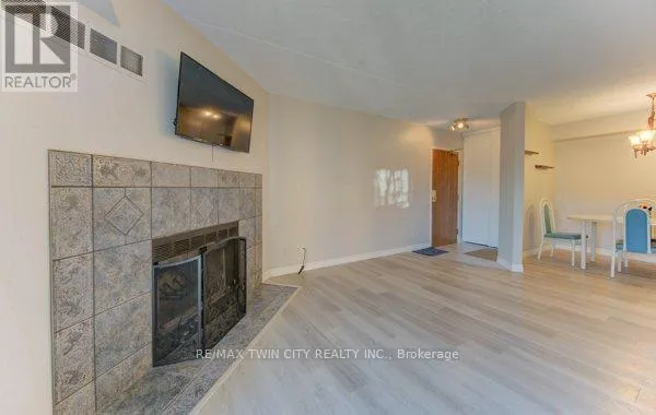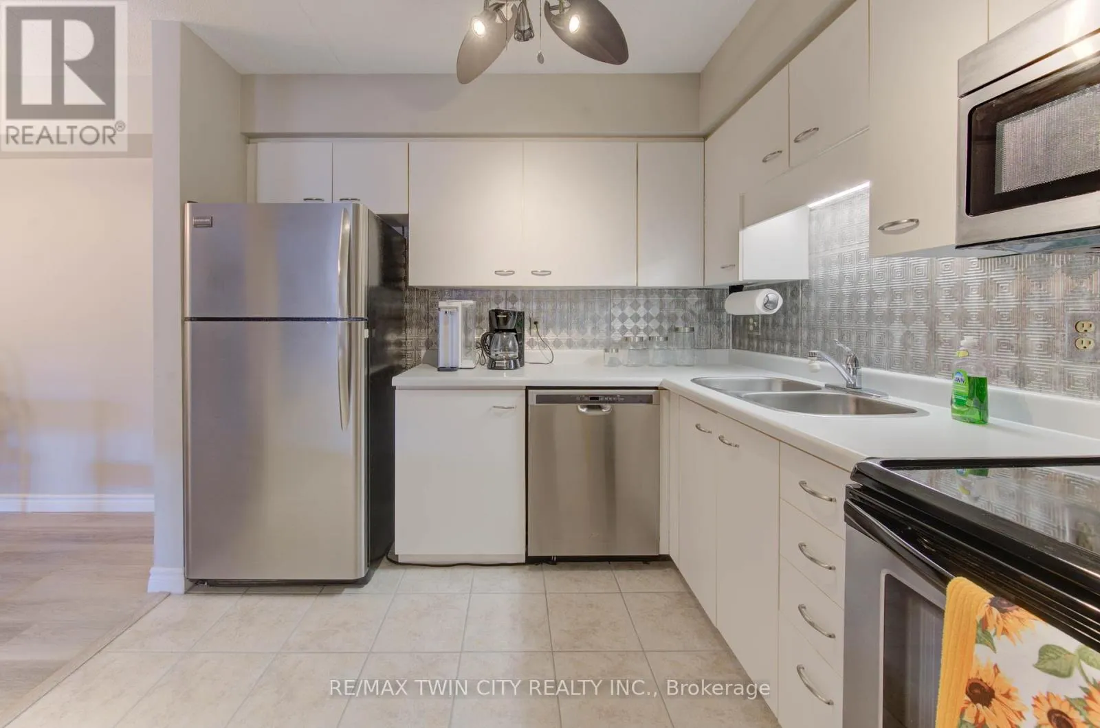 Cross Streets: Wilson. ** Directions: Wilson to Kingsway. Don't miss out on this well kept, clean and affordable 2 bedroom condo with close proximity to the 401, this move in ready condo is perfect for first time buyers, downsizers or investors in a well kept quiet complex, fantastic layout with large living room including a decorative fireplace that is perfect for gatherings with family or relaxing evenings, freshly painted throughout with updated laminate flooring the condo has a modern, clean feel, the kitchen is equipped with plenty of cupboard space including a stainless steel stove, fridge, dishwasher and built in microwave, the separate formal dining area offers additional space, whether for meals or a home office area, the newer sliding door leads to your own recently upgraded private balcony, both bedrooms are generously sized, the bathroom has a full-sized tub and shower, there is an in-suite washer and dryer for added convenience as well as a newer owned water softener, forced air furnace and central air conditioning make this home a must see, with quick possession available this condo offers the perfect blend of comfort and convenience, located within walking distance to Fairview mall, grocery stores, LRT and GRT stops, and a wide range of shops and restaurants, you'll enjoy easy access to all the amenities you will need, this is a rare opportunity to buy in a such a sought after area - book your showing today! (id:27476)