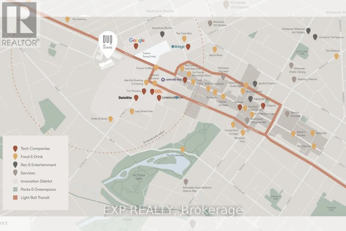 KING ST / WELLINGTON ST S Welcome to DUO Condos, the newest addition to the vibrant Station Park community in downtown Kitchener, where urban convenience meets elevated, modern living. This bright and beautifully designed 1-bedroom suite sits high on the 27th floor, offering an open-concept layout with 9-ft ceilings, floor-to-ceiling windows, quartz countertops, sleek cabinetry, high-efficiency stainless steel appliances, in-suite laundry, and a private balcony showcasing stunning city views. The building is pet-friendly and offers exceptional security and ease with 24-hour concierge services. DUO is known for its truly unmatched amenities, including a two-lane bowling alley and lounge, games room with bar, hydro pool, swim spa, unisex sauna, and a fully equipped fitness centre complete with Peloton studio, yoga and Pilates space. The outdoor amenity deck elevates the experience even further, featuring an outdoor gym area, an elevated yoga platform, table tennis court, leisure courtyard with astro-turf for lawn games, and beautifully landscaped terraces perfect for relaxing or entertaining. Located steps from Google, the LRT, GO Station, restaurants, shopping, Grand River Hospital, the Innovation District, and Victoria Park, this location offers everything you need right at your doorstep. This exceptional suite is available immediately - book your showing today and experience downtown living at its finest. (id:27476)