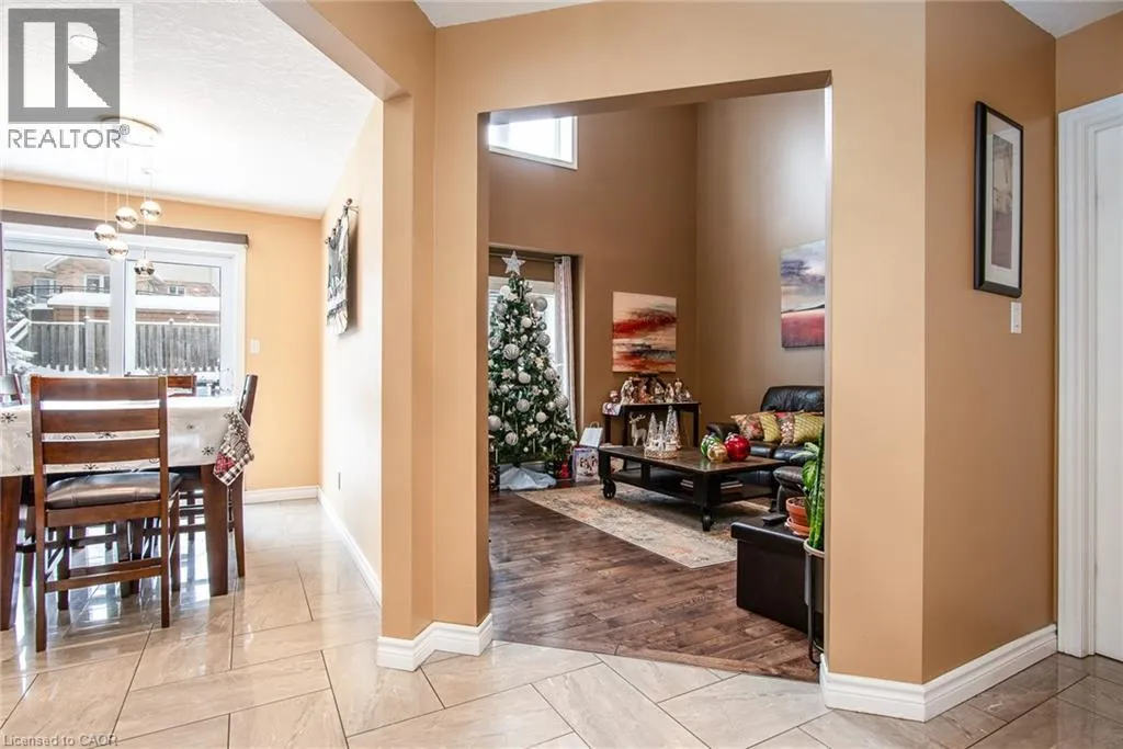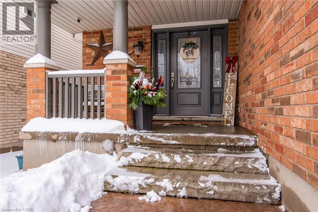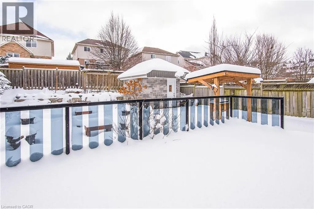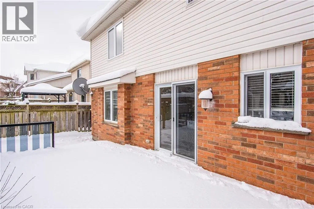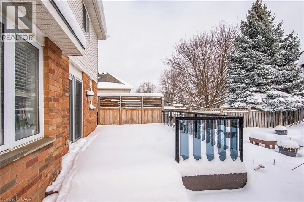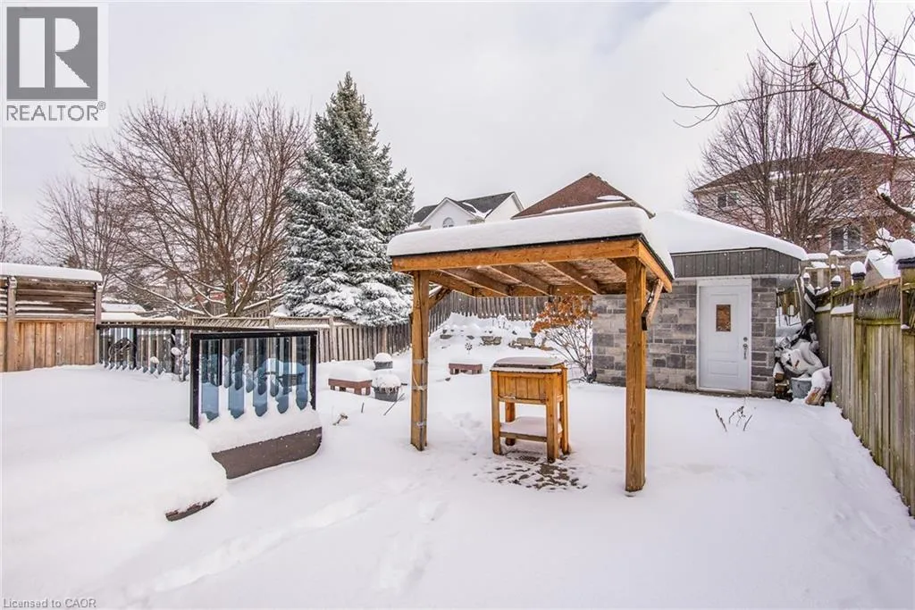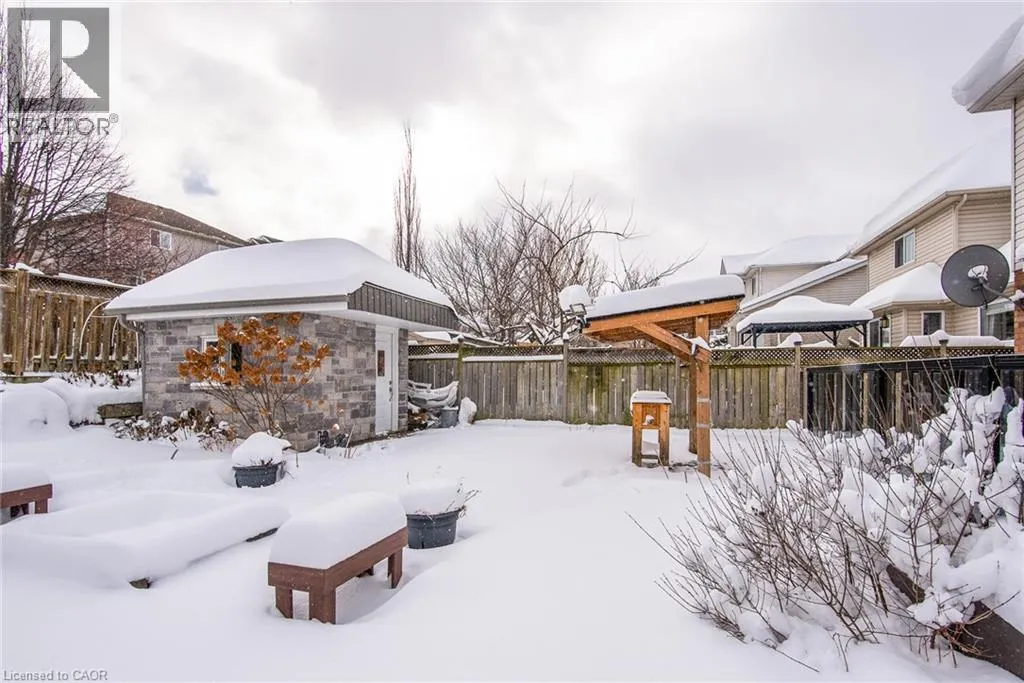 Homer Watson to Doon South Welcome to this inviting 3-bedroom, 2.5-bathroom home located in a fantastic neighbourhood close to all amenities with easy highway access. The spacious foyer opens into a bright kitchen featuring quality cabinetry and granite counterops, along with a large dining room accented by hardwood flooring. The living room boasts an impressive 16-foot ceiling, creating an open, airy feel and offering a stunning view to the second floor. From the kitchen, step through the sliding doors onto a deck that overlooks a beautifully landscaped, fully fenced yard, perfect for entertaining. Enjoy an additional patio area, a fire pit, and lush gardens, plus a strudy stone-faced shed (hydro run to shed but not connected). Upstairs, you'll find three comfortable bedrooms, including a bright primary suite with its own ensuite. A second full bathroom serves the remaining bedroom. This well-maintained home offers comfort, style, and convenience. You will not be disappointed. (id:27476)