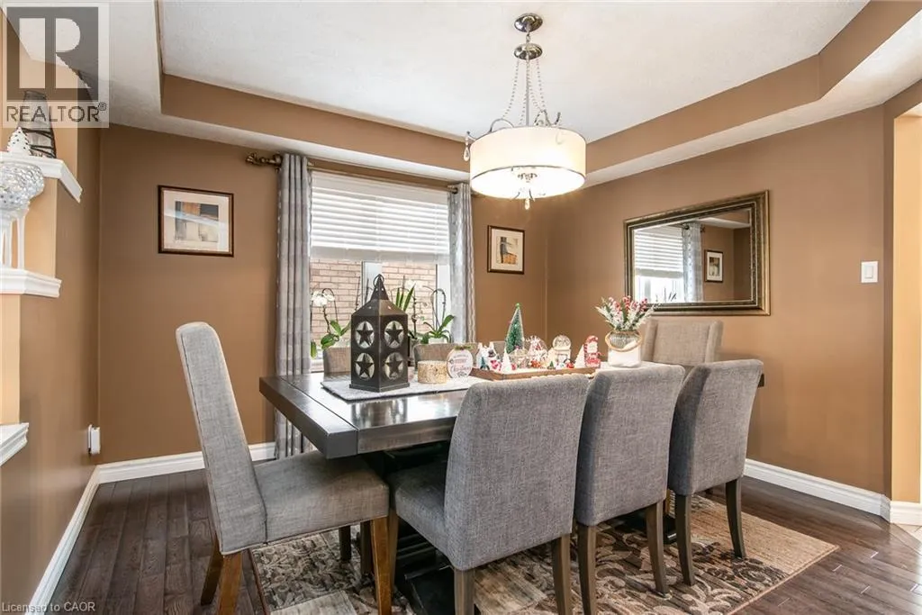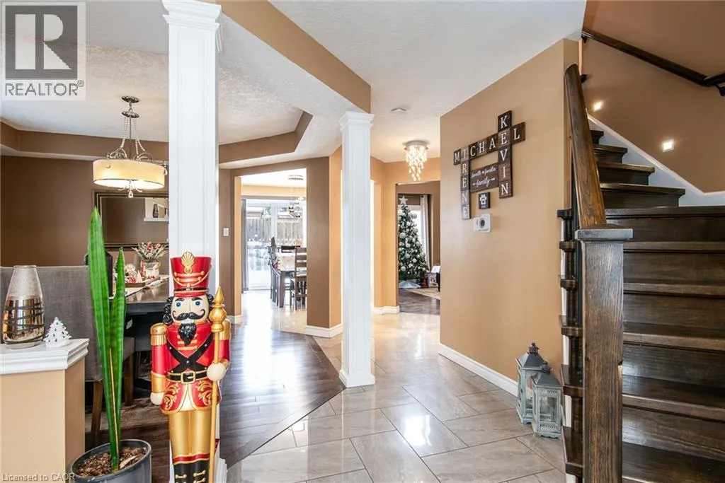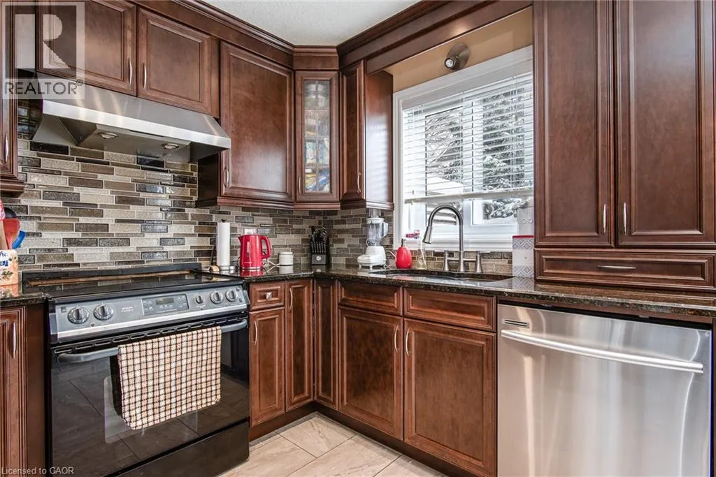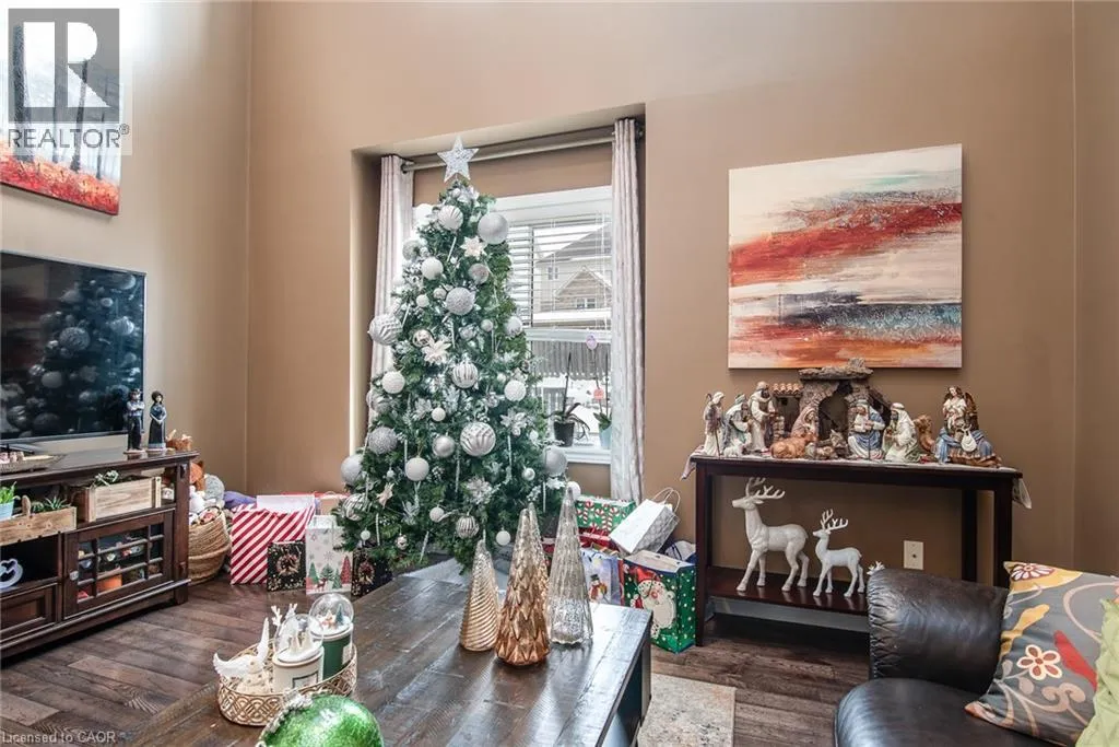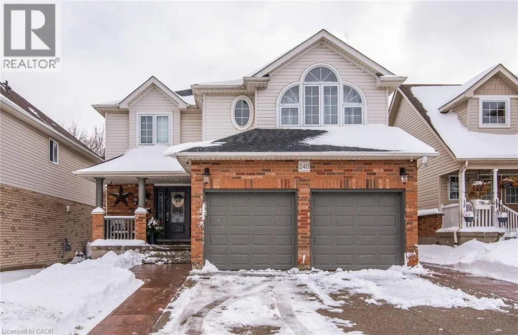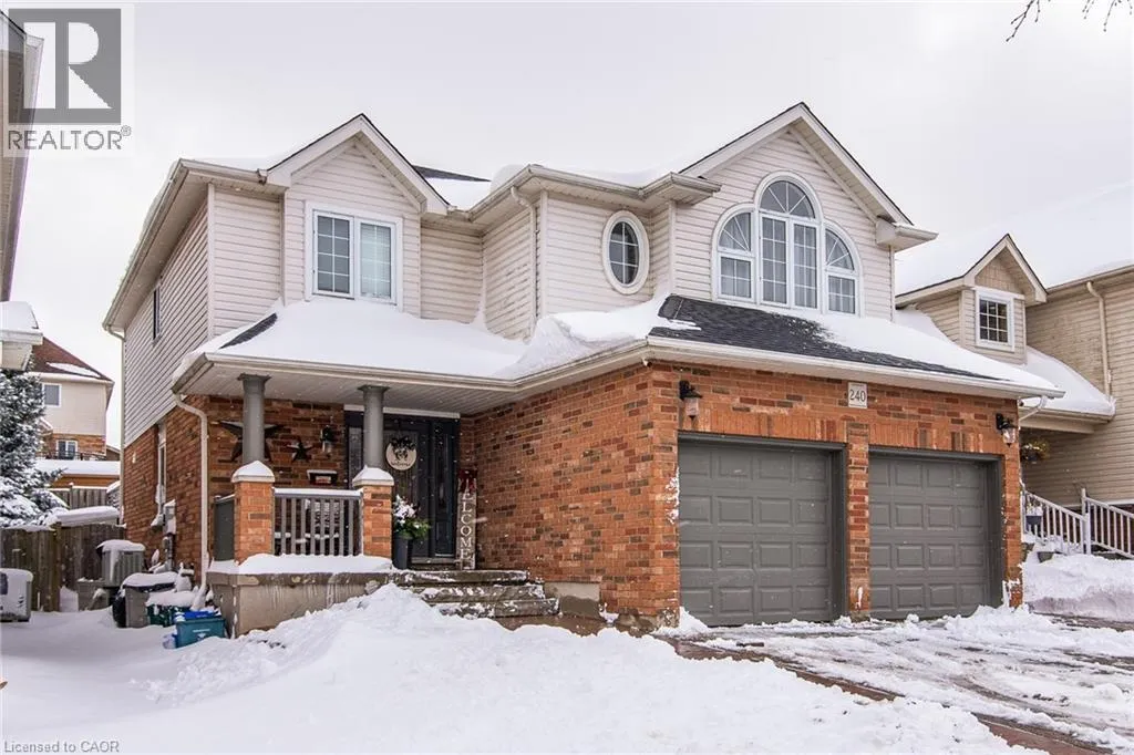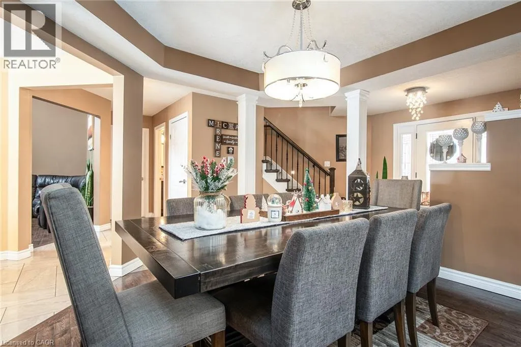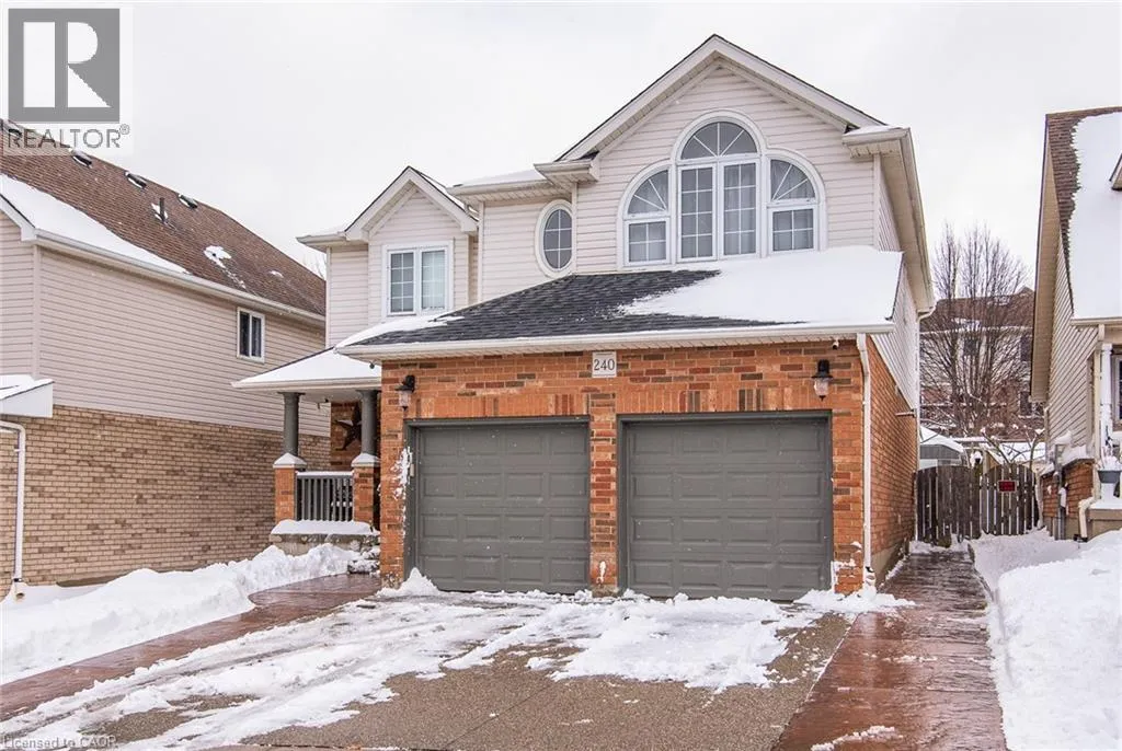 Homer Watson to Doon South Welcome to this inviting 3-bedroom, 2.5-bathroom home located in a fantastic neighbourhood close to all amenities with easy highway access. The spacious foyer opens into a bright kitchen featuring quality cabinetry and granite counterops, along with a large dining room accented by hardwood flooring. The living room boasts an impressive 16-foot ceiling, creating an open, airy feel and offering a stunning view to the second floor. From the kitchen, step through the sliding doors onto a deck that overlooks a beautifully landscaped, fully fenced yard, perfect for entertaining. Enjoy an additional patio area, a fire pit, and lush gardens, plus a strudy stone-faced shed (hydro run to shed but not connected). Upstairs, you'll find three comfortable bedrooms, including a bright primary suite with its own ensuite. A second full bathroom serves the remaining bedroom. This well-maintained home offers comfort, style, and convenience. You will not be disappointed. (id:27476)