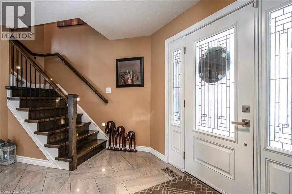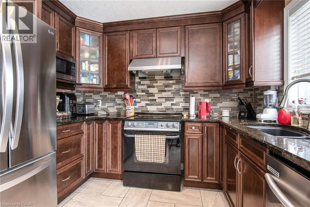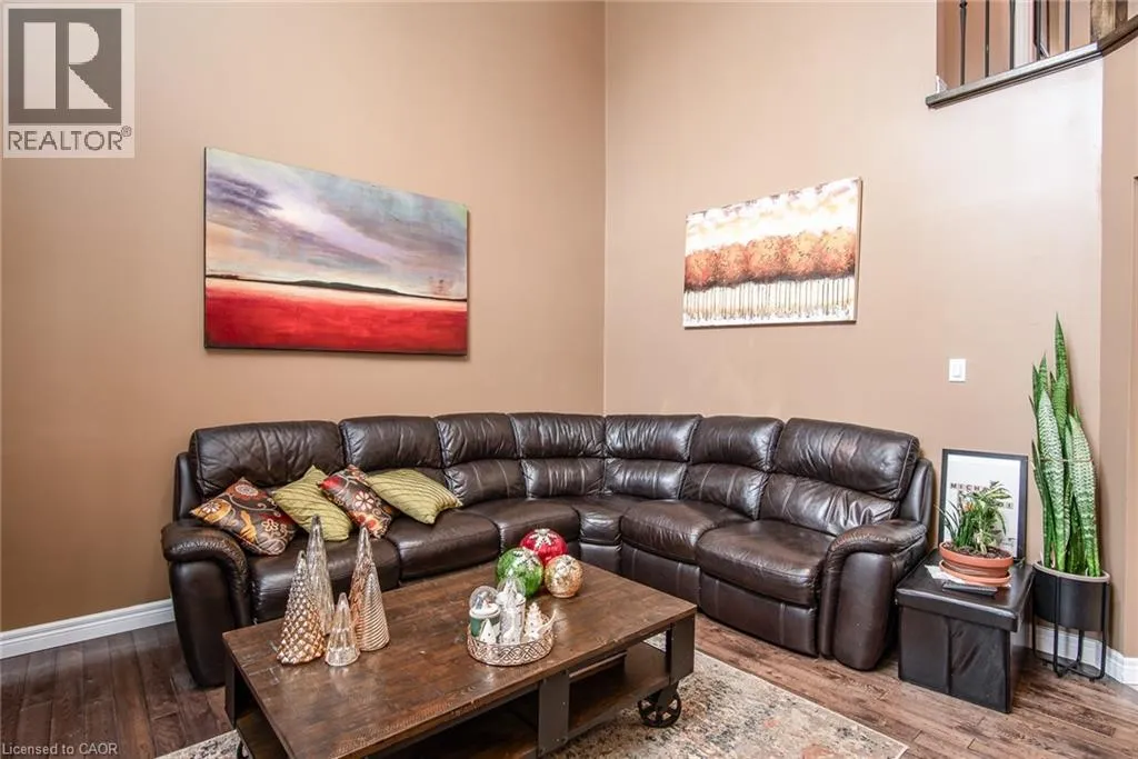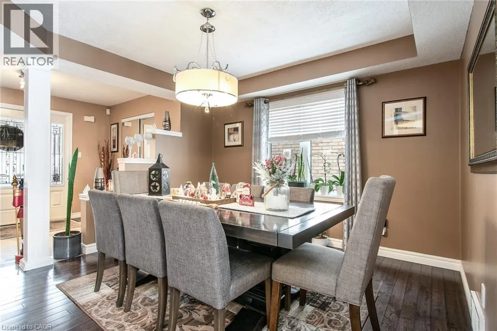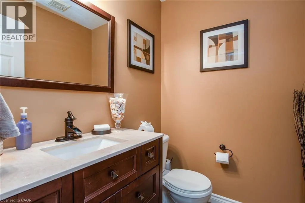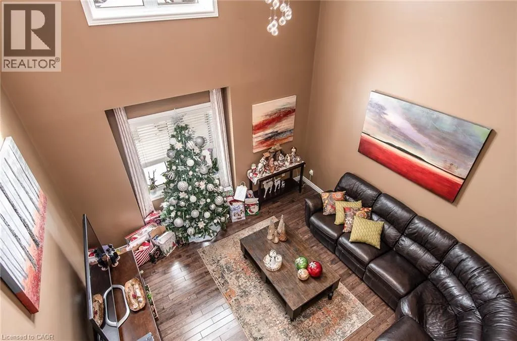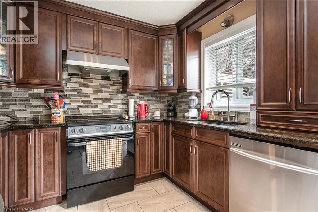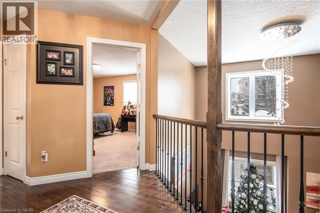 Homer Watson to Doon South Welcome to this inviting 3-bedroom, 2.5-bathroom home located in a fantastic neighbourhood close to all amenities with easy highway access. The spacious foyer opens into a bright kitchen featuring quality cabinetry and granite counterops, along with a large dining room accented by hardwood flooring. The living room boasts an impressive 16-foot ceiling, creating an open, airy feel and offering a stunning view to the second floor. From the kitchen, step through the sliding doors onto a deck that overlooks a beautifully landscaped, fully fenced yard, perfect for entertaining. Enjoy an additional patio area, a fire pit, and lush gardens, plus a strudy stone-faced shed (hydro run to shed but not connected). Upstairs, you'll find three comfortable bedrooms, including a bright primary suite with its own ensuite. A second full bathroom serves the remaining bedroom. This well-maintained home offers comfort, style, and convenience. You will not be disappointed. (id:27476)