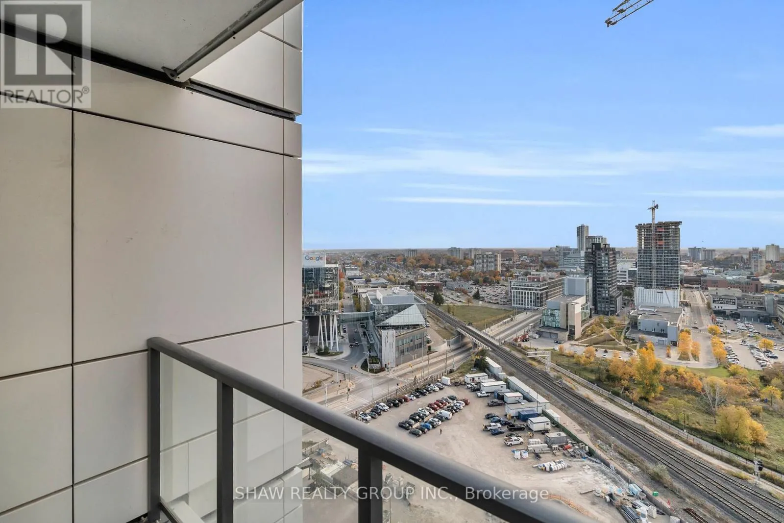 Cross Streets: King St W to Wellington St S. ** Directions: King st. Discover an exclusive luxury corner condo unit in the prestigious Station Park Condos of Kitchener. This sophisticated 1-bedroom, 1-bathroom urban sanctuary combines contemporary aesthetics with everyday convenience. Enter a space where style seamlessly blends with comfort, featuring an open-concept living area bathed in natural light from floor-to-ceiling windows, offering panoramic city views. This condo boasts $17,000 in upgrades, including an upgraded kitchen, upgraded bathroom, window coverings in the bedroom, an entertainment package, and more. Storage unit and Underground Parking License included in purchase price! The gourmet kitchen is a culinary haven with state-of-the-art appliances, sleek countertops, and ample storage, making every meal a delightful experience. Retreat to the tranquil bedroom, complete with elegant touches, durable solid surface flooring, and plenty of closet space. The luxurious bathroom features high-end fixtures and a serene ambiance, perfect for unwinding after a busy day. Station Park offers unparalleled amenities, including a dedicated dog park, bowling alley, an amphitheatre, al fresco work stations, The Circuit-an innovative outdoor workout area-and expansive open spaces for relaxation, blending outdoor living with urban essentials. Seize the opportunity to elevate your urban lifestyle at Station Park Condos. Enjoy opulence and sophistication, strategically located near entertainment, fine dining, and efficient transit options. This 1-bedroom, 1-bathroom condo exemplifies contemporary refinement and modern luxury living. Vacant Possession Possible. (id:27476)