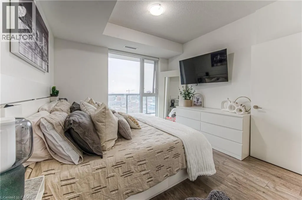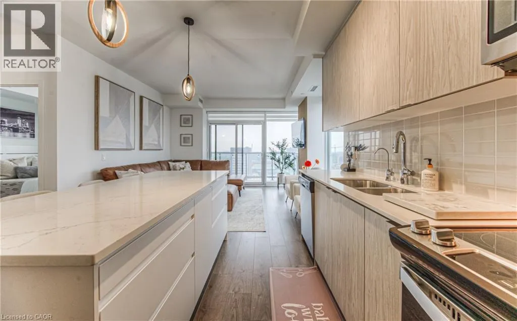 Duke/Young Street Offers anytime! Just nominated for City of Kitchener 's Great Places and People's Choice Award!Welcome to upscale urban living at its finest in this stunning 2-bedroom, 2-bathroom corner unit on the 13th floor of the sought-after Young Condos in downtown Kitchener. MANY UPGRADES/ great VALUE!! Flooded with natural light and showcasing breathtaking panoramic views, this meticulously upgraded suite offers a unique blend of elegance, comfort, and functionality. Step inside to discover a thoughtfully designed open-concept layout featuring high-end finishes throughout. The heart of the home is a custom OVERSIZED kitchen island with gleaming quartz countertops, perfect for entertaining .The kitchen is equipped with premium stainless steel appliances, a Culligan water filtration system, and built-in furniture that enhances both style and storage. Both bedrooms are generously sized, with the primary bedroom featuring a private ensuite. An in-suite washer and dryer add everyday convenience. Additional highlights include:one underground parking spot, private storage locker and bike rack access. Young Condos offers an array of modern amenities, including a fitness center, separate yoga room, rooftop terrace with BBQ, resident lounge, car and pet wash and more â all in a vibrant, walkable location near shopping, restaurants, the LRT, Google and Victoria Park. This is not just a condo â itâs a lifestyle. (id:27476)