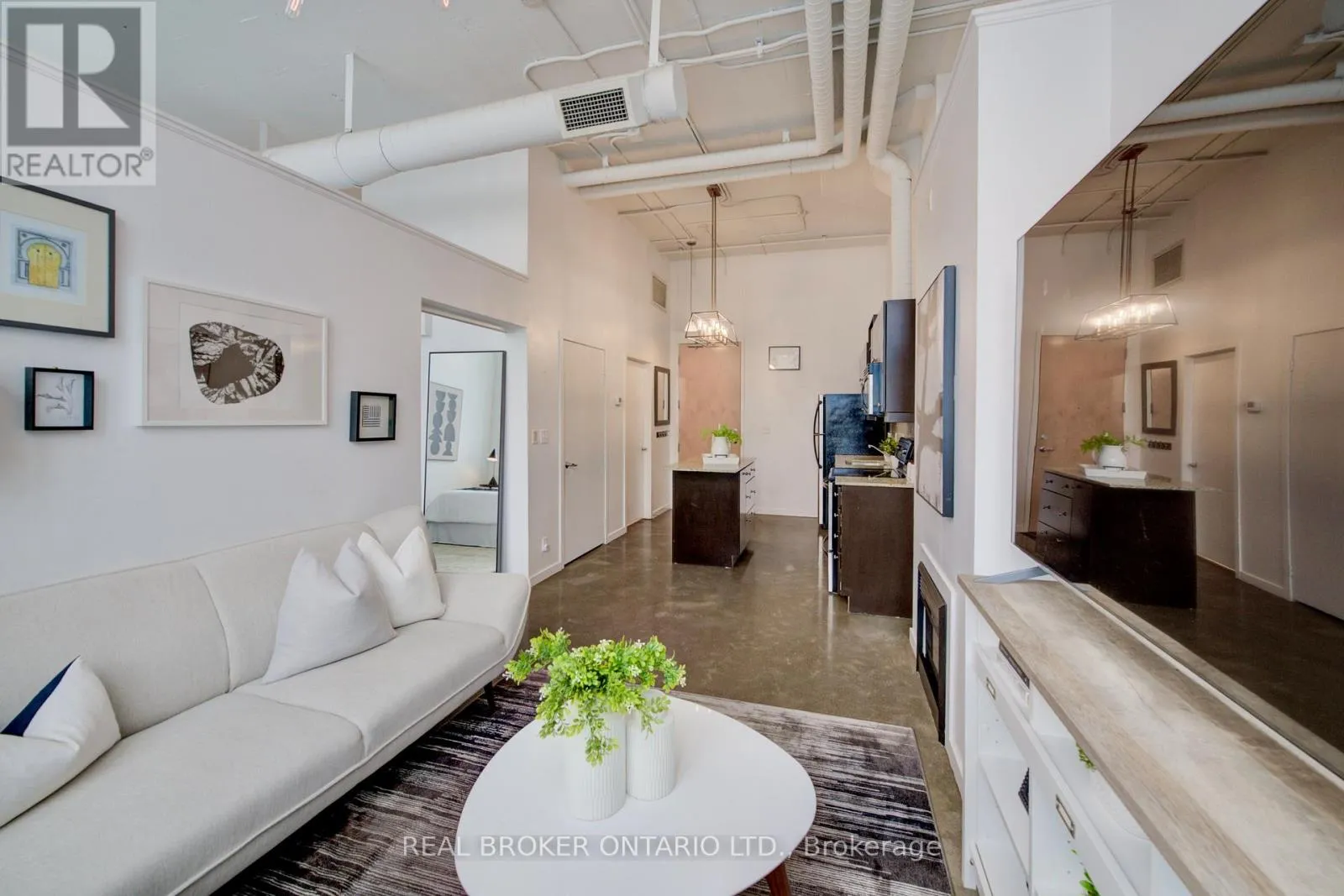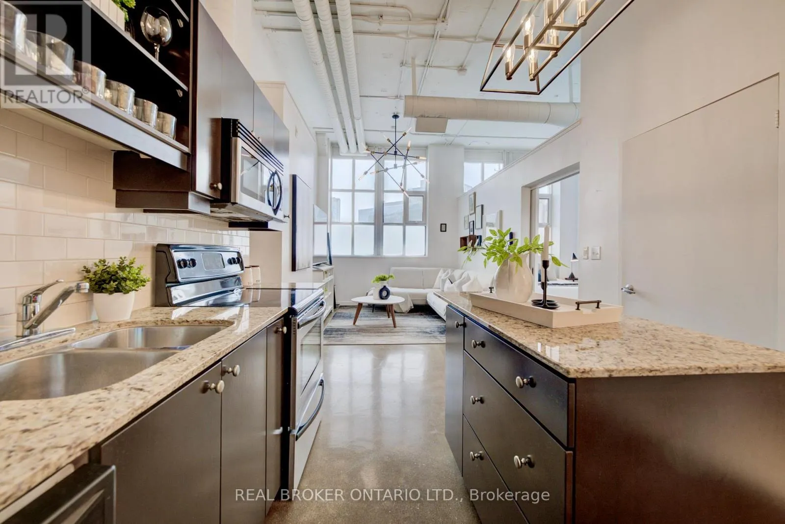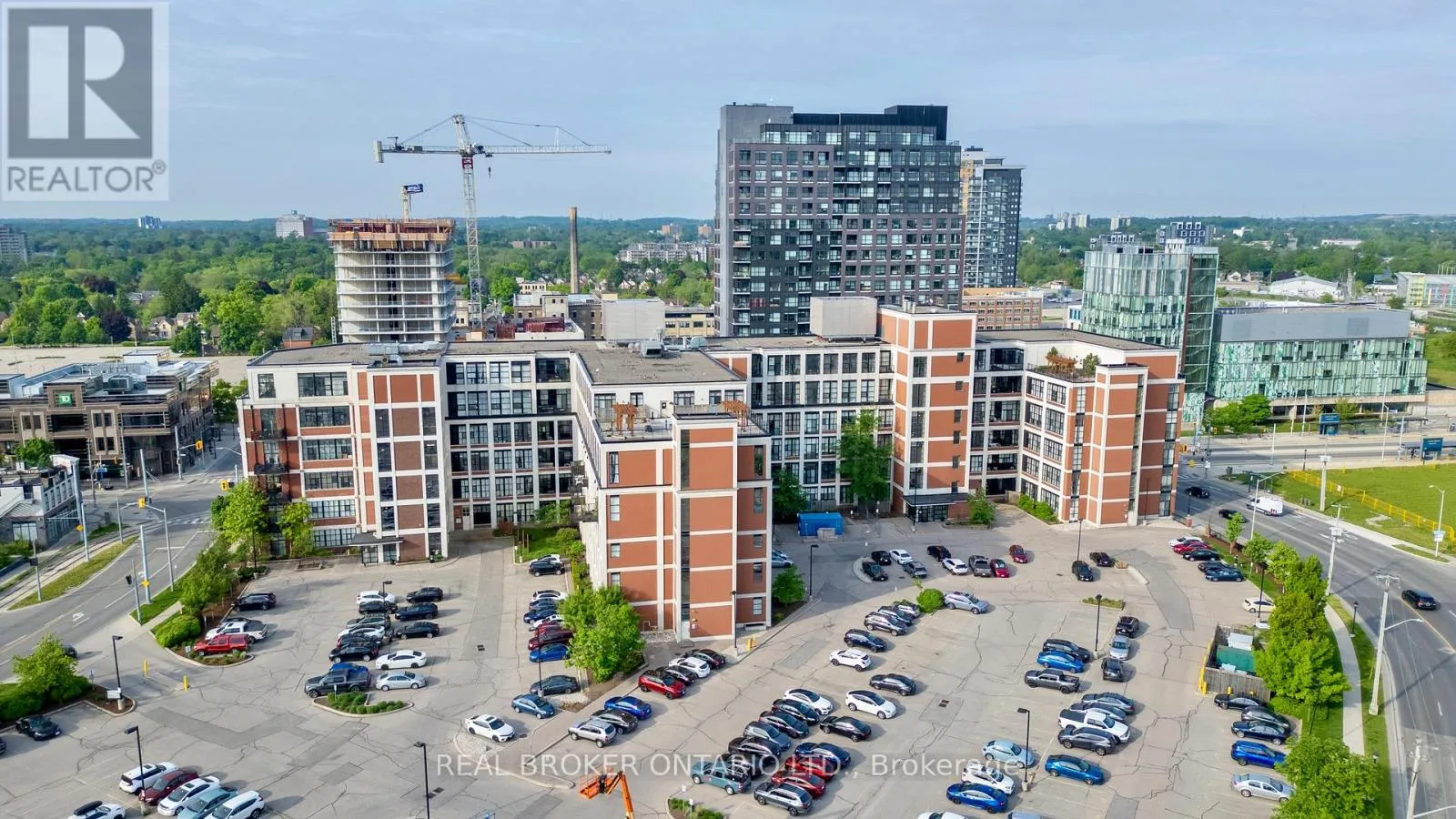 KING STREET W AND VICTORIA STREET Welcome to Unit 126 at the Kaufman Lofts, a cozy and character-filled 1-bedroom, 1-bathroom home nestled in Kitchener's sought-after Innovation District. This iconic midrise building is a celebrated landmark that blends authentic industrial heritage with modern living, featuring polished concrete floors, soaring 13' ceilings, expansive windows, and other true loft details throughout. The open-concept living space is warm and inviting with a built-in fireplace, while the eat-in-kitchen offers ample storage, granite countertops, stainless steel appliances, and modern light fixtures. The bedroom includes a walk-in closet, and the unit is complete with in-suite laundry (2022 washer and dryer), parking, and a locker. Residents enjoy premium amenities including a rooftop terrace perfect for BBQs and a party room, all located just steps from Google, Communitech, KPMG, Deloitte, the UW School of Pharmacy, two LRT stops, and the Kitchener GO Station, with easy access to highways, parks, schools, and trendy local shops. (id:27476)