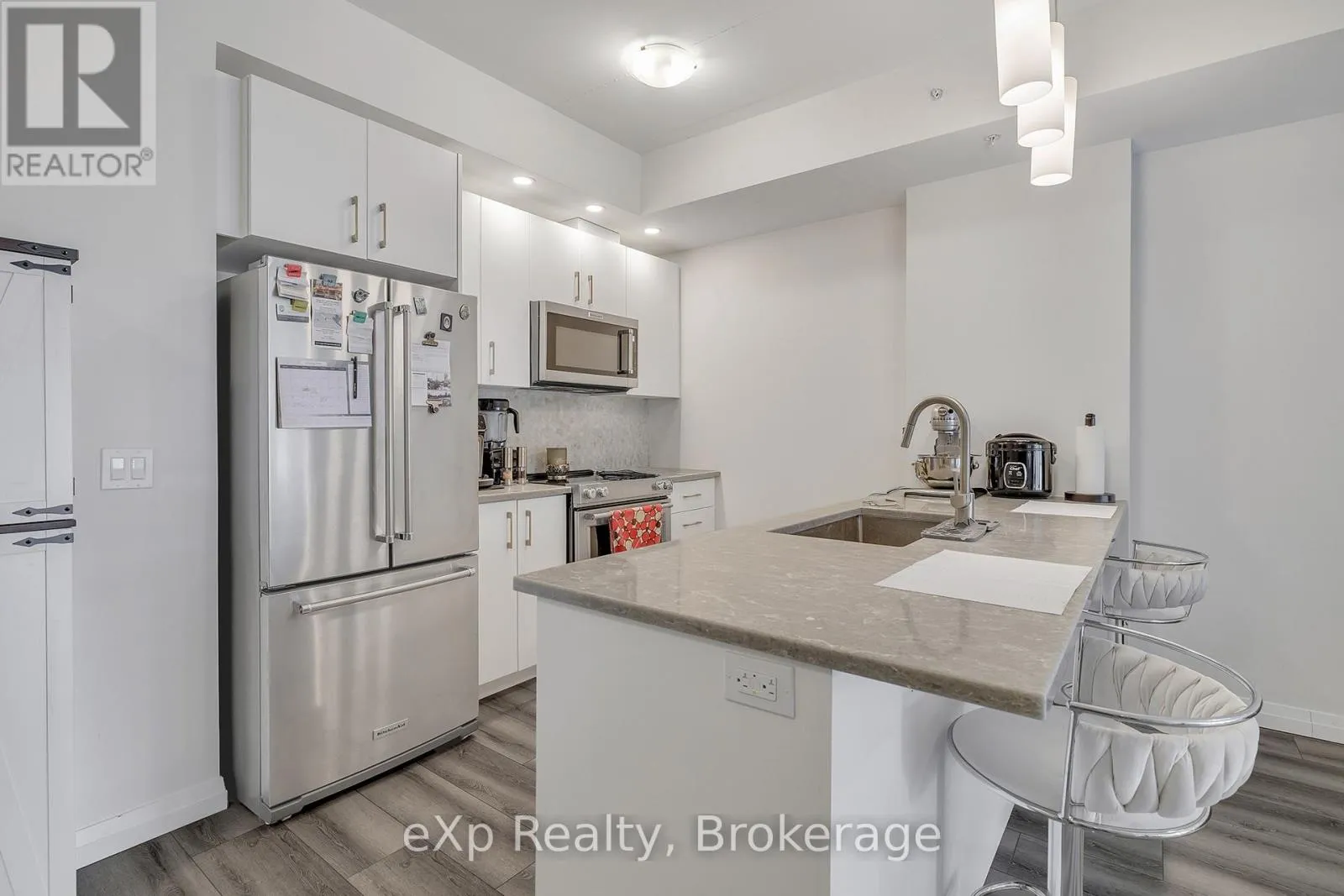 Cross Streets: King St W & Victoria St S. ** Directions: King St W to Victoria St S to Garment St. Discover one of the most desirable buildings in the city at Garment Condos! This spacious and well-designed unit offers exceptional value with a bright, open-concept layout and modern finishes throughout. The contemporary kitchen features sleek cabinetry, a convenient breakfast bar, and premium flooring that flows seamlessly into the living space. A generously sized bedroom, stylish 4-piece bathroom, in-suite laundry, and private balcony complete this comfortable and inviting home. Residents enjoy outstanding building amenities including a rooftop pool, fitness centre, party room, lounge area, yoga space, pet run, urban park, and sport court. Perfectly situated in the heart of Downtown Kitchener, just steps from Google, KPMG, Deloitte, the LRT hub, GO Train, Communitech, the Schools of Pharmacy and Medicine, Victoria Park, and an endless selection of shops, restaurants, and entertainment. A bright, modern condo in an unbeatable location-don't miss this opportunity! (id:27476)