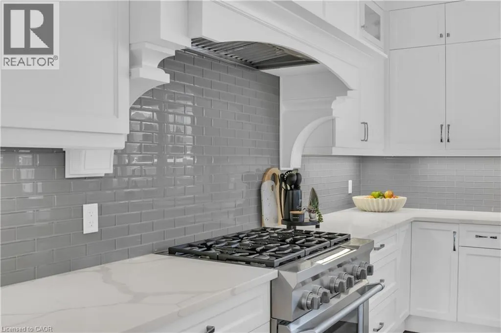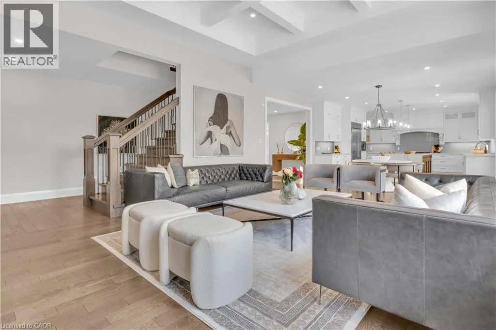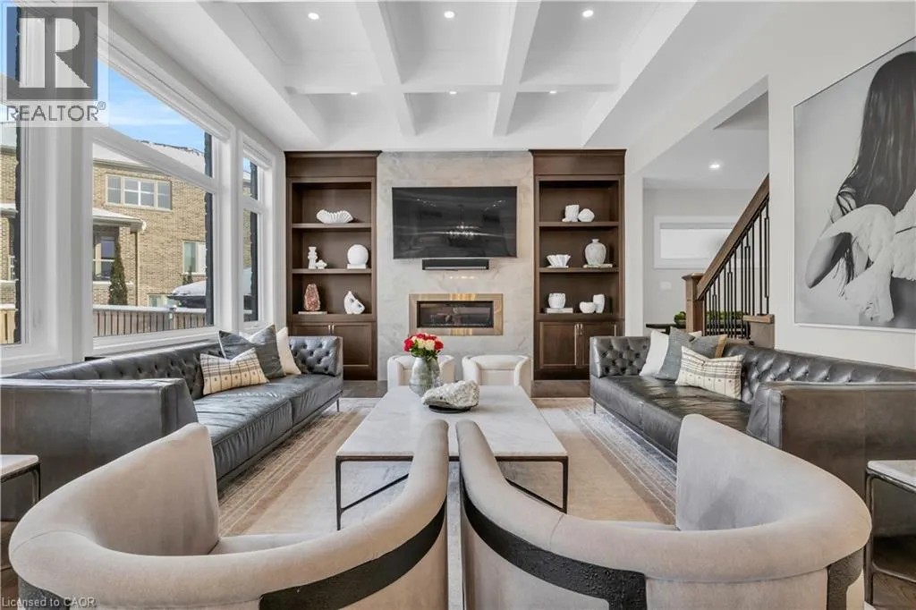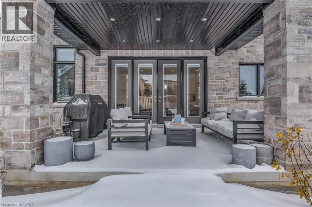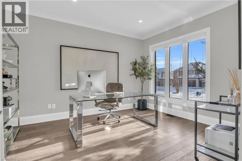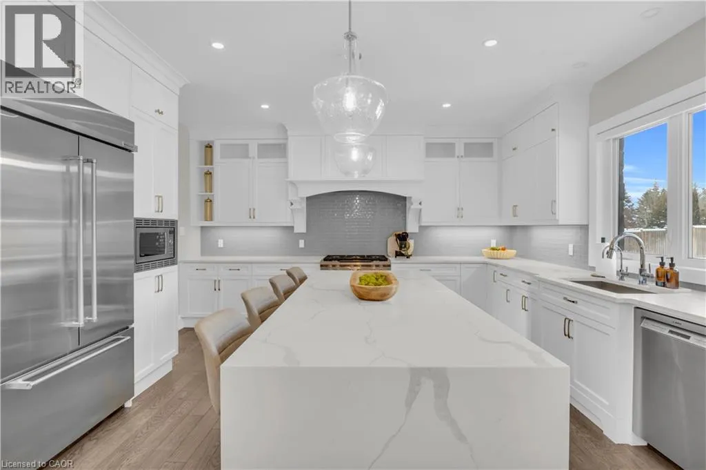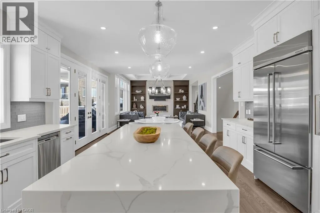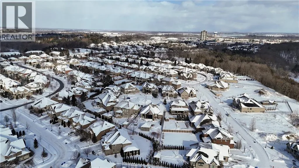 Deer Ridge Dr to Fall Harvest Dr Over 5,700 sq ft of finished living space and located on a large 0.25-acre lot in the sought-after Deer Ridge neighbourhood. Tucked away on a quiet court, this custom-built home offers a comfortable layout with carefully selected finishes throughout. The main entry opens into a bright two-storey foyer, with a formal dining room nearby that connects to the kitchen through a practical servery and pantry. The kitchen features white cabinetry, quartz countertops, a waterfall island, tiled backsplash, a built-in refrigerator, and a dual-fuel range with an oversized hood. The breakfast area includes French doors that open to a covered back porch, making it easy to enjoy the large outdoor space. The family room sits just off the kitchen and includes high coffered ceilings, a large picture window, and a gas fireplace with a floor-to-ceiling mantel. A powder room, mudroom with access to the triple car garage, and a spacious home office complete the main level. The upper floor offers four generously sized bedrooms. Two share a five-piece Jack and Jill bathroom, one includes its own ensuite and walk-in closet, and the primary bedroom features a large walk-in closet and an ensuite with a soaker tub and walk-in shower with rain head. Laundry is also conveniently located on the upper level, and all bathrooms are equipped with heated floors for added comfort. The basement benefits from very high ceilings and large above-grade windows filling the space with natural light. It is currently used as a recreation room, an additional bedroom, and a three-piece bathroom. Additional highlights include smart lighting throughout the home and automatic window coverings, offering added convenience and efficiency. Outside, the home is finished with a stone façade and includes an exterior air and weather barrier system, in-ground irrigation, a security system, and a water conditioning system. This is a great opportunity to settle into one of the most sought-after areas in Kitchener. (id:27476)