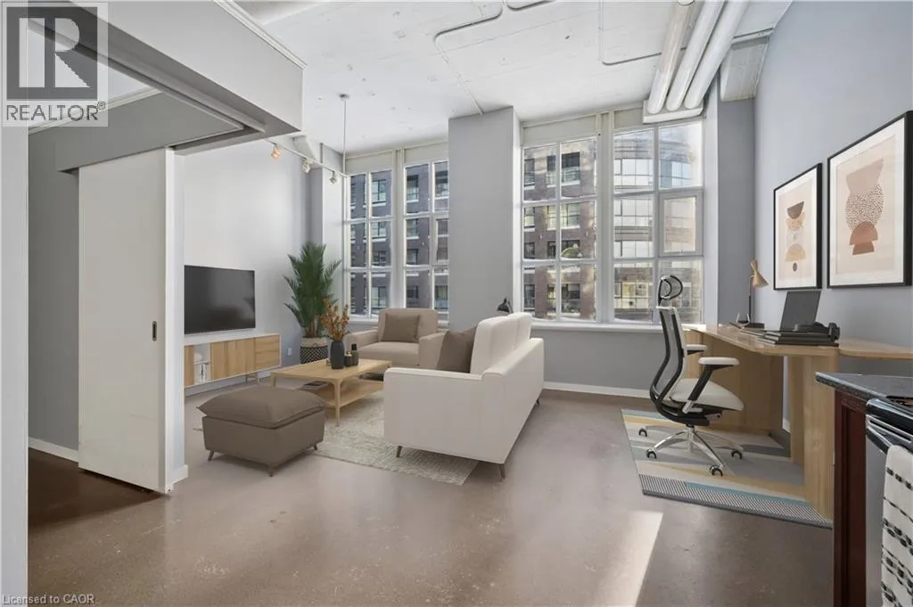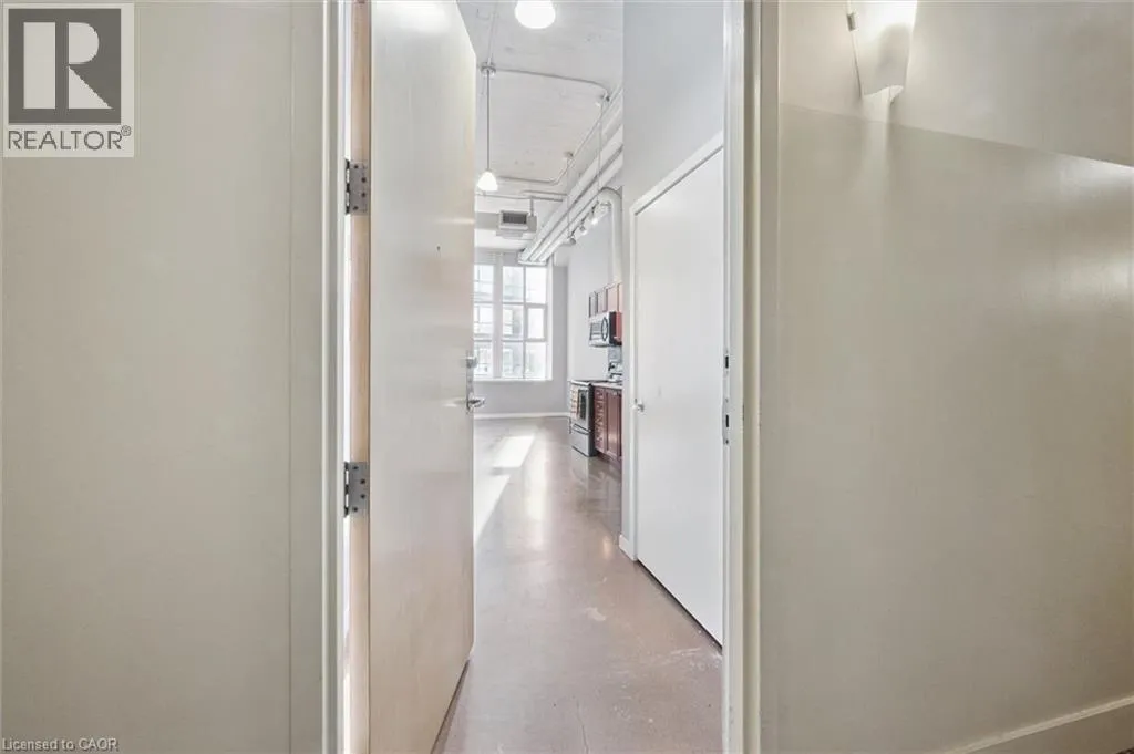 Experience authentic loft living in the heart of Kitchenerâs Innovation District at Kaufman Lofts. This 1-bed, 1-bath unit blends historic character with modern convenience. This iconic mid-rise conversion was formerly the historic Kaufman Rubber Company and has preserved the buildingâs industrial roots while offering an urban lifestyle. You will love the soaring ceiling heights & oversized windows that flood the space with natural light and exposed ductwork that celebrate the buildingâs rich heritage. Open-concept layout and thoughtfully designed floor plan with polished concrete flooring provides a low-maintenance foundation for everyday living. At the heart of the home is the kitchen with a movable granite-topped island, perfect for casual breakfasts or gathering friends and family while cooking. The kitchen offers ample storage, stainless steel appliances and seamlessly connects to the living space. The bedroom has a corner double door for privacy and spacious closet. The 4 piece bathroom features a tub to relax and unwind. In-suite laundry adds everyday convenience, while the unit comes with owned parking and a private locker for additional storage. Residents of Kaufman Lofts enjoy premium amenities, including a rooftop terrace with herb gardens, gas BBQs, and panoramic views of downtown, a party room for gatherings, and secure bike storage. The location is unparalleled in the heart of DTK walking distance to Google, Communitech, KPMG, D2L, McMasterâs School of Medicine, and the University of Waterloo School of Pharmacy. Just moments from highway access, steps away from LRT stops and the upcoming transit hub connecting GO Train and buses, the perfect location to experience the culture of DTK's restaurants, Kitchener Farmer's Market, cafés, nightlife, and Victoria Park. Whether youâre a first-time buyer, tech professional, downsizer, or investor, this loft provides the perfect combination of history, style, and a vibrant downtown lifestyle. (id:27476)