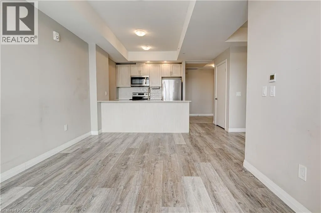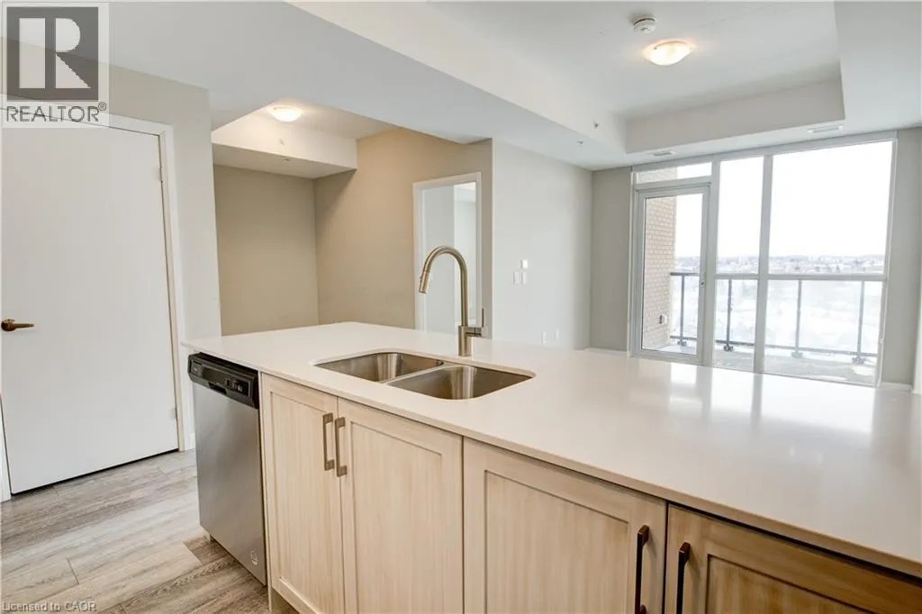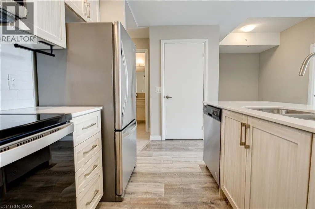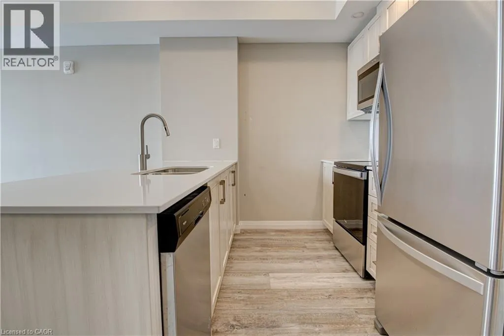 North onto Bramm Street off of Victoria Street South. Located just steps to downtown Kitchener and the beautiful Victoria Park, this 1 bedroom plus den condo at 108 Garment Street offers a welcoming place to settle into city living. Completed in 2022, the unit features a practical layout and a kitchen that truly anchors the space. Upgraded appliances and cabinetry, a double sink, dishwasher, and generous counter space make it easy to cook at home, while the extra-long peninsula comfortably seats three to fourâideal for casual meals or hosting friends. The living area flows easily from the kitchen and opens to a private west-facing balcony, offering a quiet place to unwind in the afternoon and evening. The den adds valuable flexibility, working equally well as a home office, extra storage, or cozy reading nook. The bedroom is comfortably sized, and the unit is completed by a contemporary bathroom and the convenience of in-suite laundry. Indoor garage parking for one vehicle and a storage locker are included with the unit. Residents also enjoy access to a well-equipped fitness room, yoga space, party room, and an outdoor terrace featuring a pool, basketball court, BBQ area, and plenty of seating for gathering with friends. Ample visitor parking next door makes hosting easy. With shops, transit, dining, and the tech district just outside your door, this home offers an easy, low-maintenance lifestyle in a central location. (id:27476)