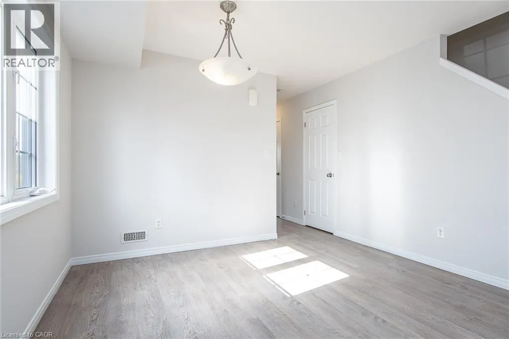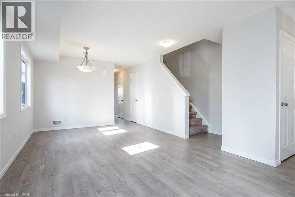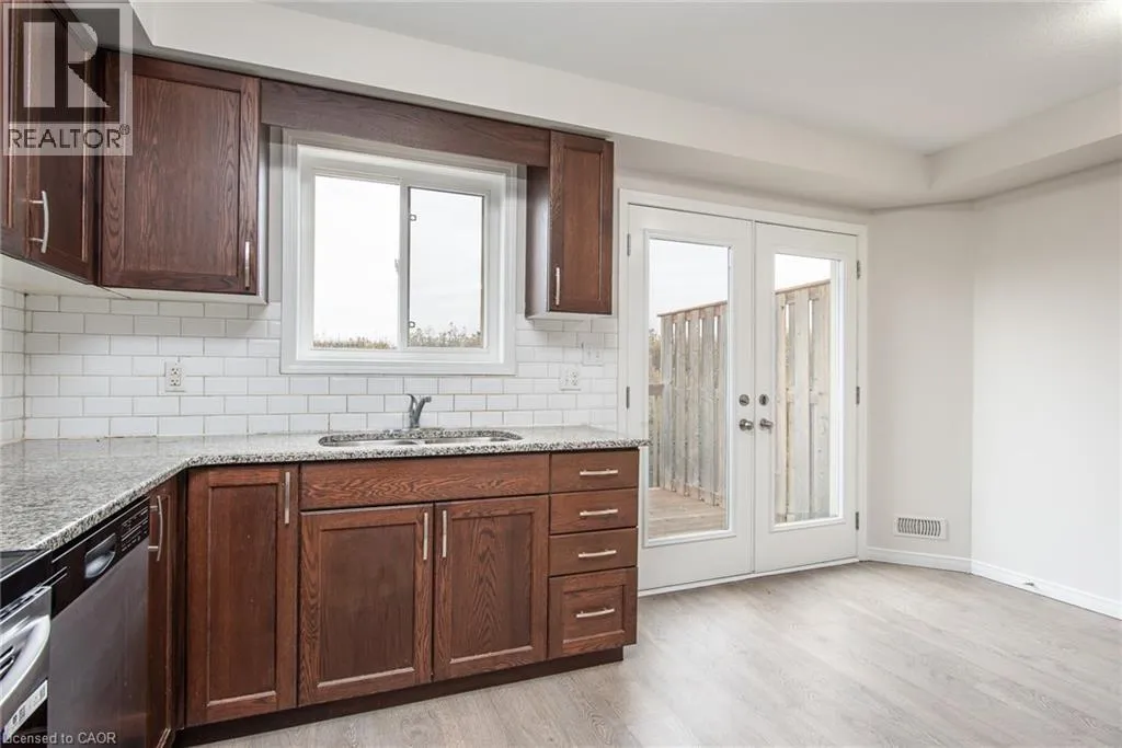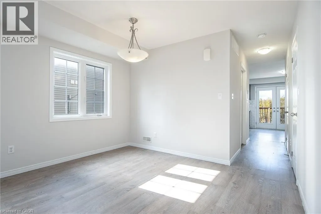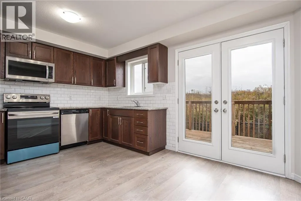 Huron Road to Templewood Dr Welcome to this bright and well-maintained 3-bedroom, 1.5-bath townhome offering 1,457 sq ft of functional living space in a growing Kitchener neighbourhood. The main floor features a spacious front living room with large windows, a convenient powder room, and a modern kitchen with stainless-steel appliances, ample cabinet storage, and generous counter space. The kitchen connects to the dining area, where double French doors open to a private deckâperfect for morning coffee, BBQs, or quiet evenings outdoors. Upstairs, youâll find three comfortable bedrooms and a full 4-piece bathroom. The primary bedroom offers his-and-her closets, and the home includes in-suite laundry and plenty of additional storage. Enjoy dedicated parking at your door, with visitor parking available in the complex. Located steps from playgrounds, sports fields, pickleball courts, Strasburg Creek Natural Area and other scenic walking trails in Kitchen. A brand-new indoor recreation complex is under construction nearby, soon to feature swimming pools, a turf fieldhouse, and fitness facilitiesâadding even more value to this convenient location.The area continues to grow, with new shopping and dining options, along with easy access to schools, public transit, the expressway, and Highway 401. This move-in-ready townhome offers a balance of comfort and everyday convenienceâperfect for families or professionals looking for a welcoming place to call home. (id:27476)